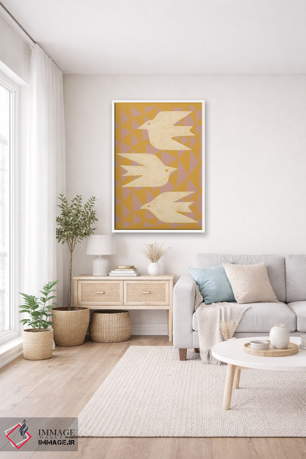 براساس پالت گرم اثر، قاب بلوط روشن (چوبی) پیشنهاد اول است و استخوانی ملایم مکمل. برای سفارشهای پروژهای با ابعاد و قابهای اختصاصی با ایماژ در تماس باشید.