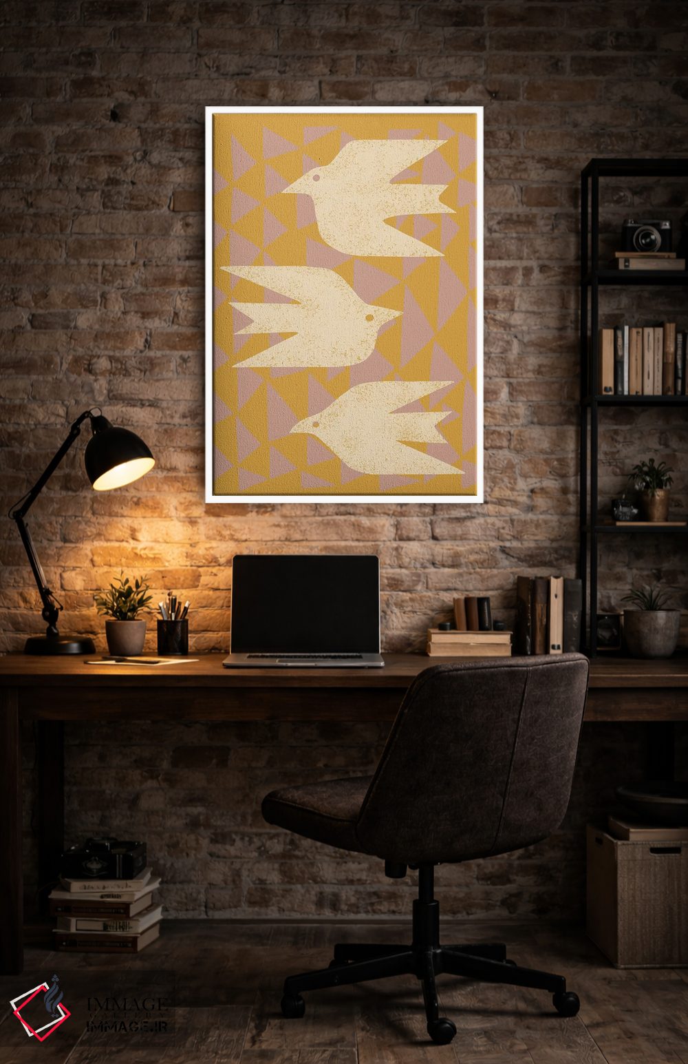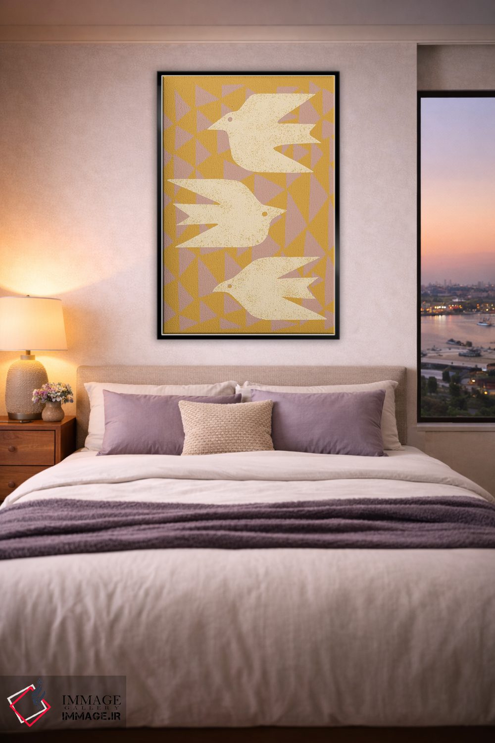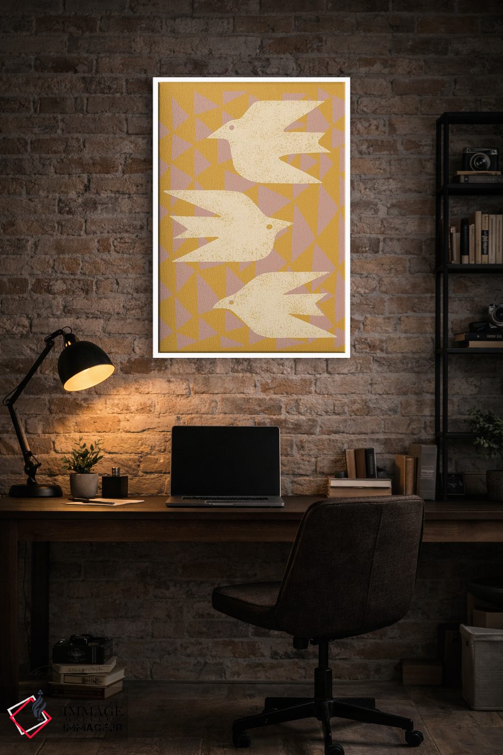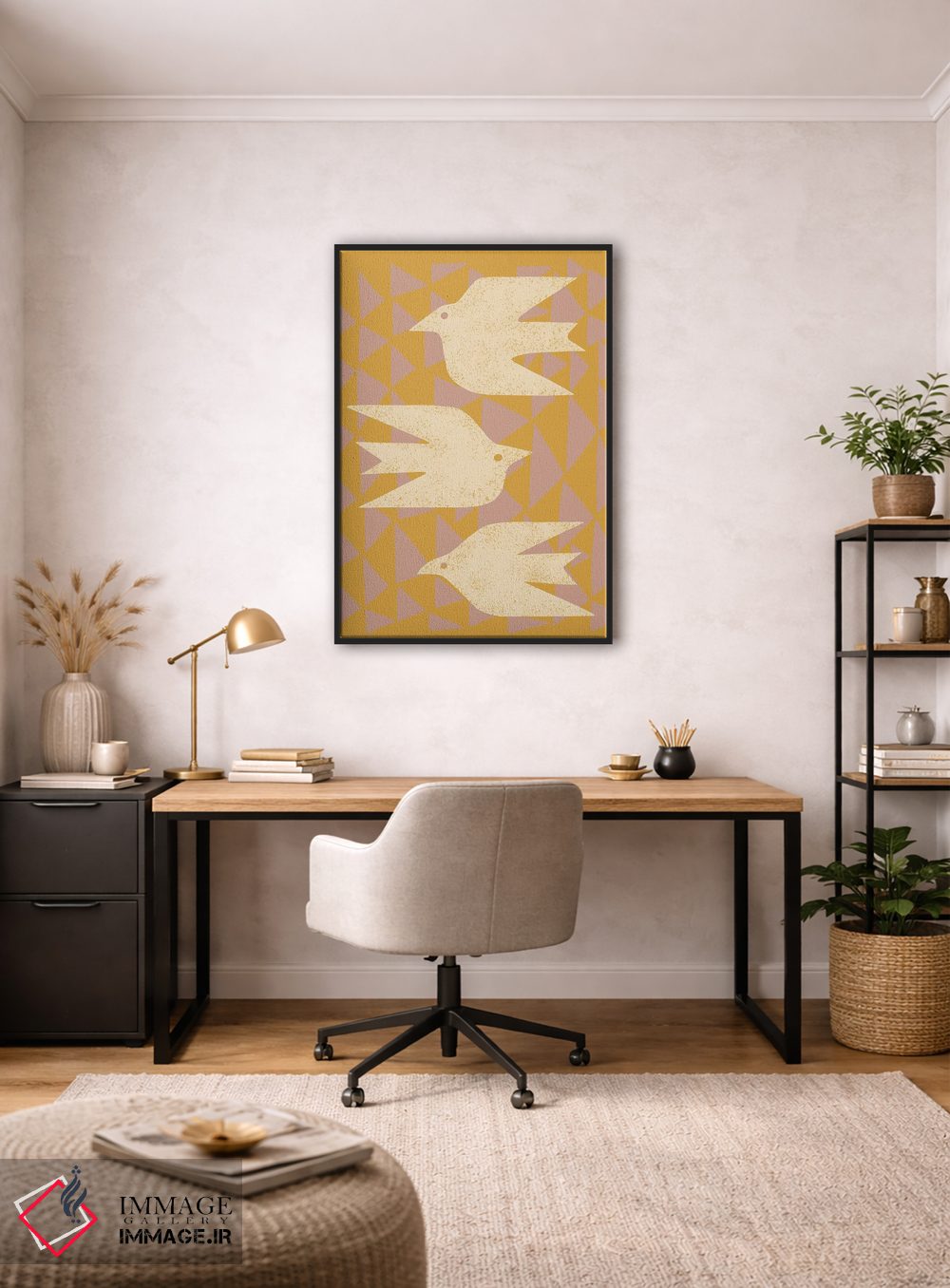برای اتاقی که به یک عنصر دوستداشتنی نیاز دارد، «قمریها در پرواز (زرد)» اثرِ «رنیا ال. تول» بافت و جزئیات را طوری نشان میدهد که نگاه میماند؛ برای دکورهایی با رنگهای خنثی انتخابی خوشسلیقه است. با نورپردازی نقطهای، جذابتر هم میشود.
