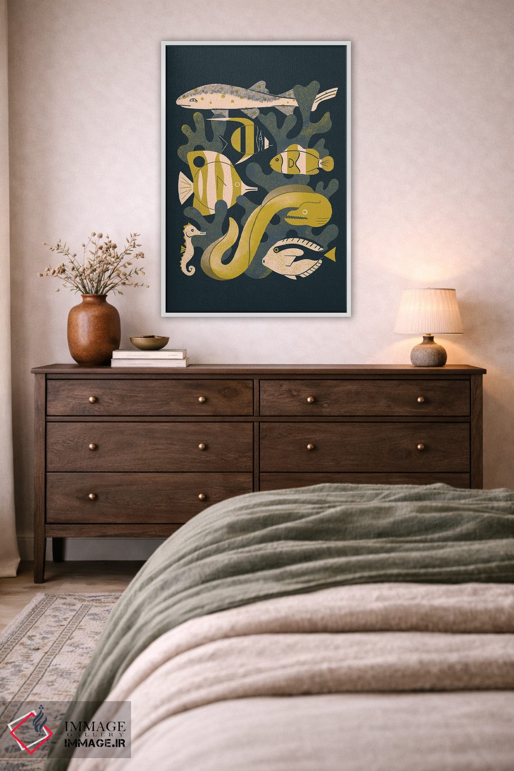 اگر به آثار حیوانات علاقه دارید، «ماهیهای مرجانی» اثرِ «رنیا ال. تول» بدون کودکانه شدن، بازیگوش و خوشپرداخت میماند، برای راهروها و ورودیهای گرم گزینهٔ مناسبیست. در کنار گیاهان و نور طبیعی، جذابتر هم میشود.