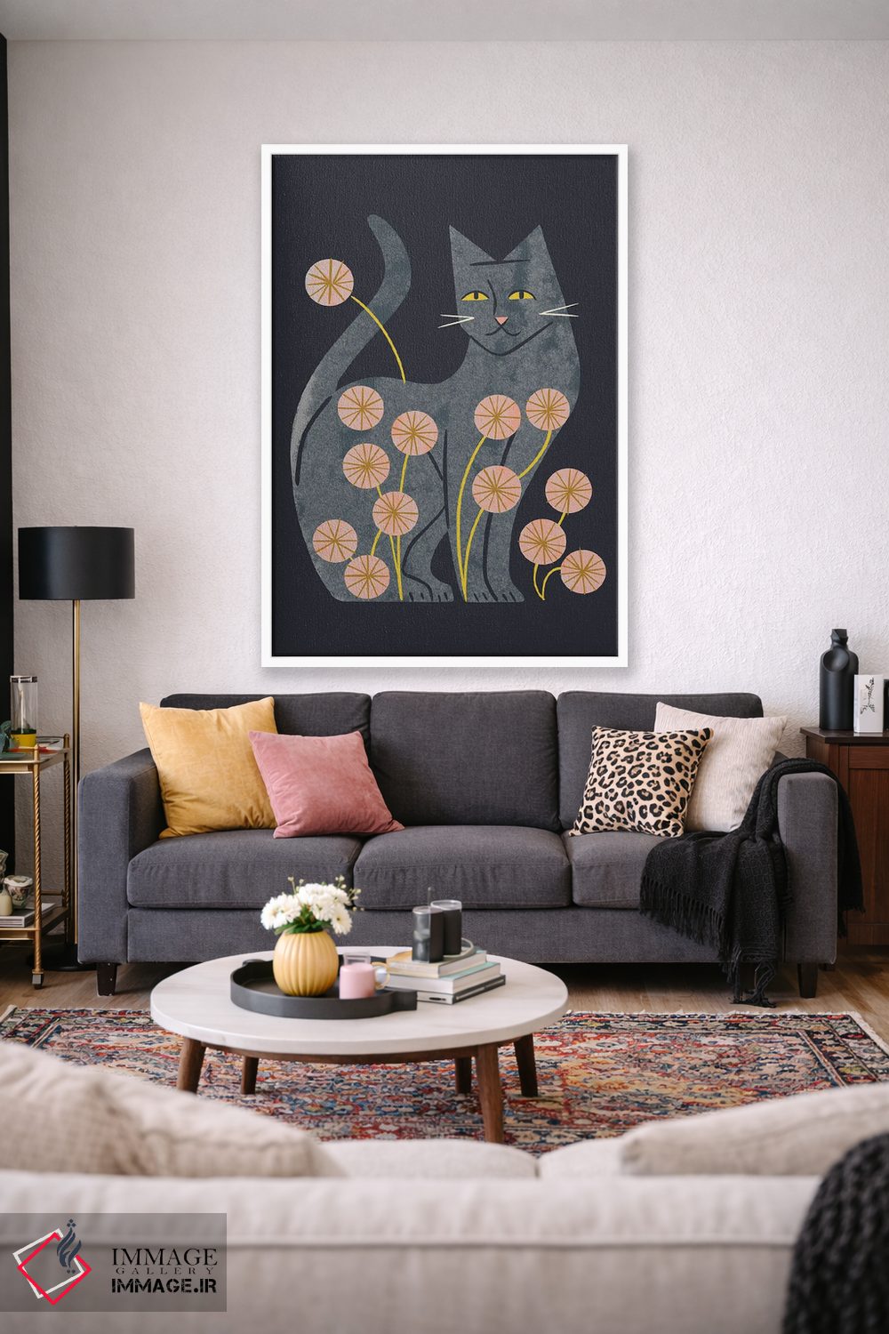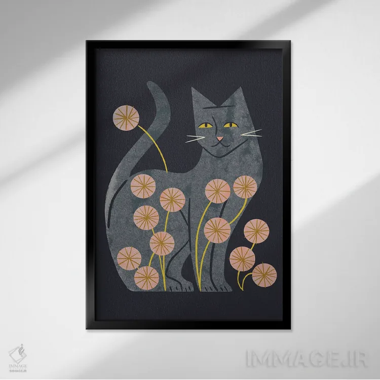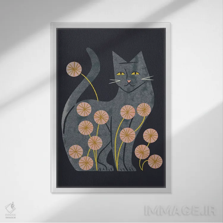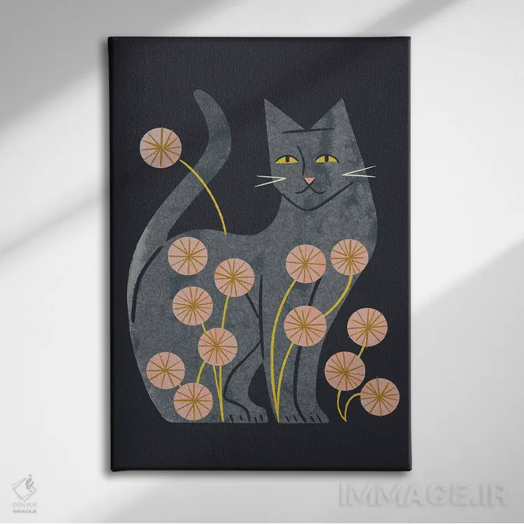 تابلو مدرن گربه خاکستری و گل ها اثر رنیا ال. تول