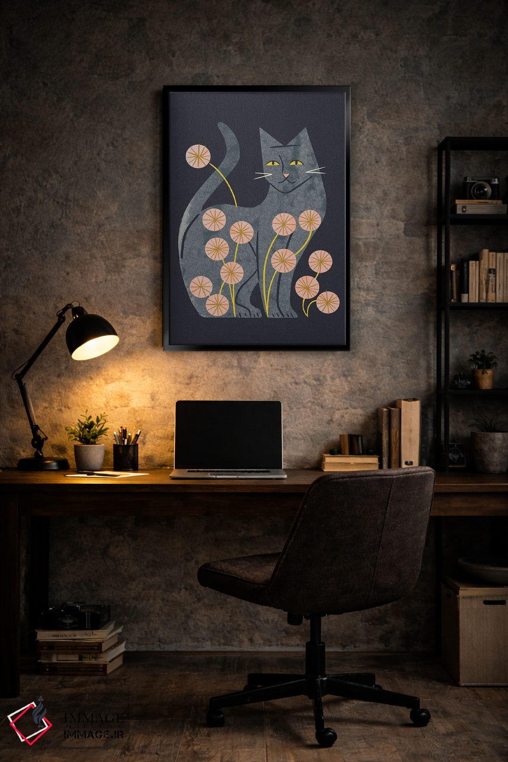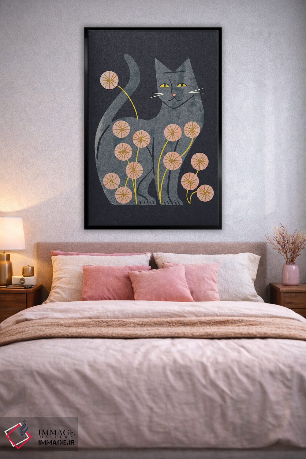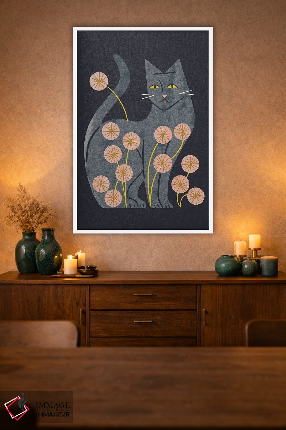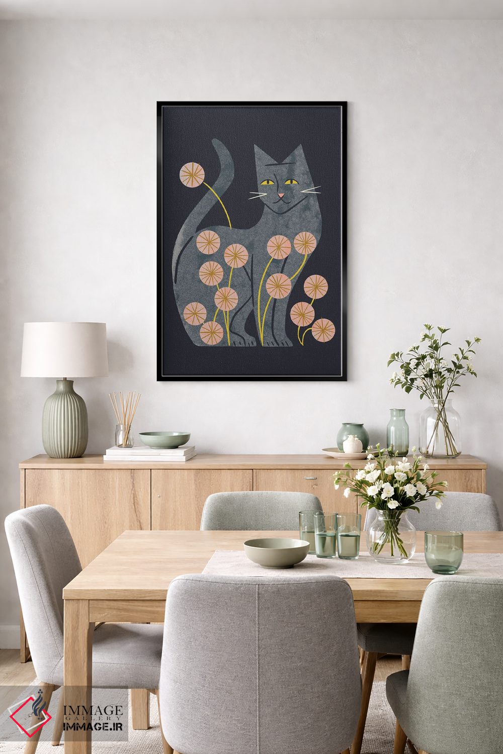 «گربه خاکستری و گلها» اثرِ «رنیا ال. تول» از آن کارهاییست که به فضا، گرمیِ ملایم اضافه میکند؛ برای دکورهایی با رنگهای خنثی انتخاب خوبیست. با نورپردازی نقطهای، جذابتر هم میشود.