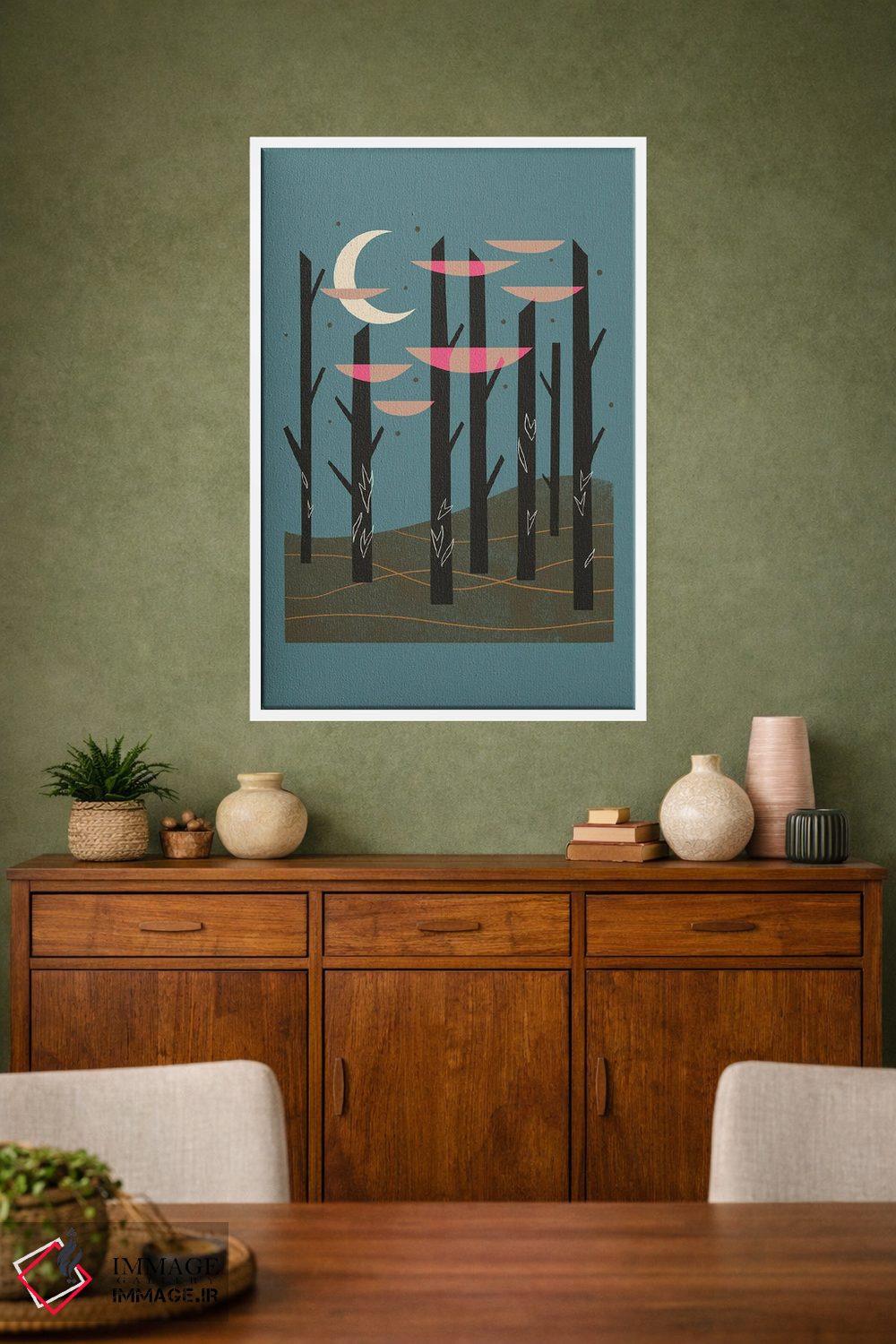 براساس پالت گرم اثر، قاب بلوط روشن (چوبی) پیشنهاد اول است و استخوانی ملایم مکمل. برای سفارشهای پروژهای با ابعاد و قابهای اختصاصی با ایماژ در تماس باشید.