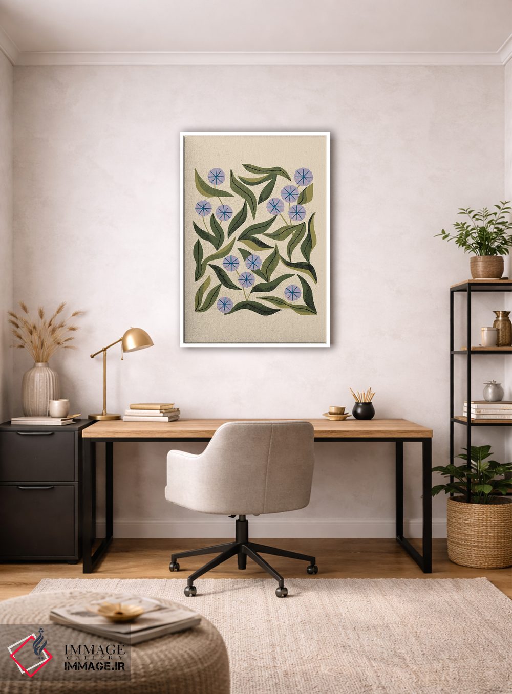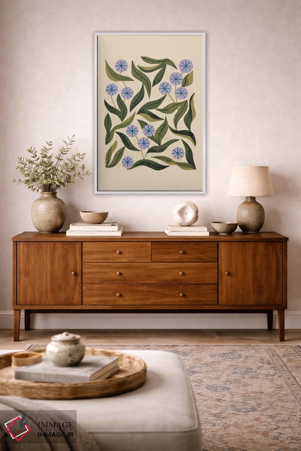 اگر دوست دارید دیوار روشنتر و آرامتر دیده شود، «سینی پریوینکل (گیاه پریوینکل)» اثرِ «رنیا ال. تول» تعادل رنگیِ لطیفی به چیدمان میدهد، برای هدیه دادن گزینهٔ مناسبیست. برای دیوار گالری هم ترکیبپذیر و خوشنشین است.