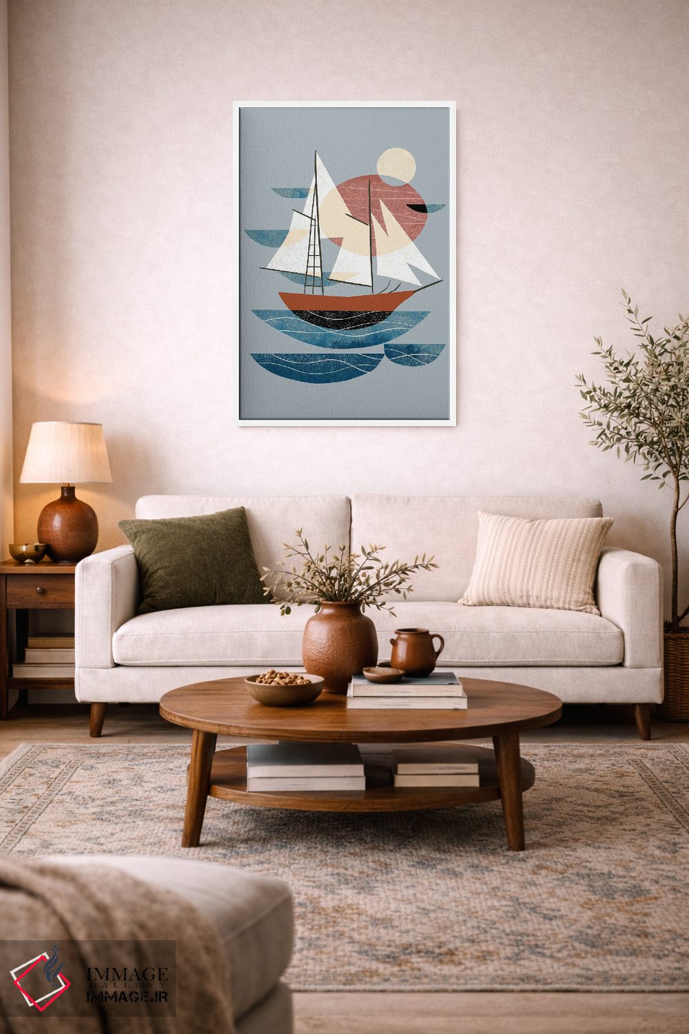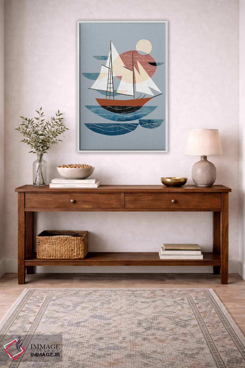 در «قایقرانی» اثرِ «رنیا ال. تول»، رنگ و فرم نقش اصلی را دارند؛ انتخابی خوب برای فضاهای امروزی و دیوارهای مینیمال.