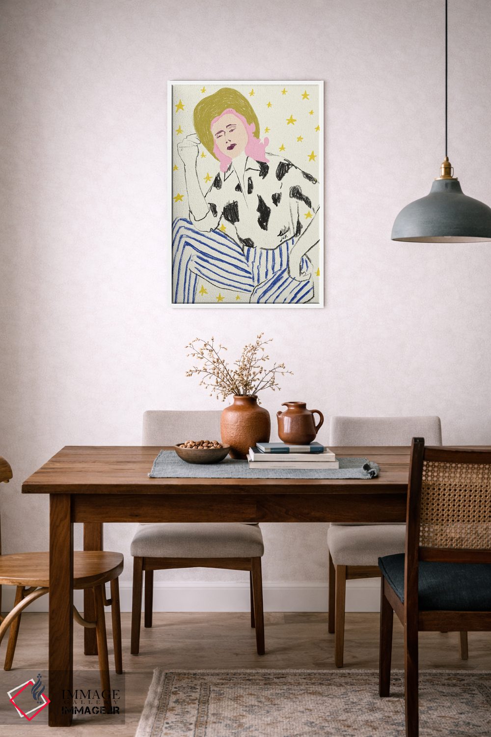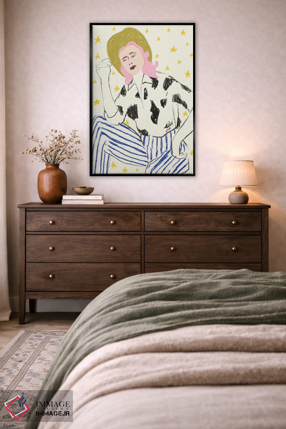 این تابلو با موضوعِ این دسته و نگاهِ پرداختِ هنری، انتخابی شیک برای اتاق خواب یا کلوزت—فضا است اثرِ «جنی روم».