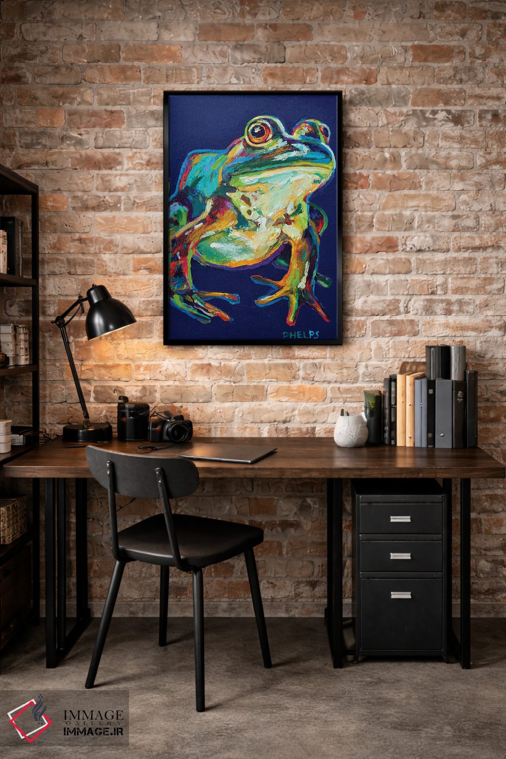 اگر میخواهید دیوار کمی سرزندگیِ محترمانه داشته باشد، «قورباغه گاوی» اثرِ «رابرت فلپس» به فضا، گرمیِ ملایم اضافه میکند، برای اتاق کودک (بدون لحن کودکانه) گزینهٔ مناسبیست. با قاب چوبی یا مشکی، حس مرتبتری پیدا میکند.