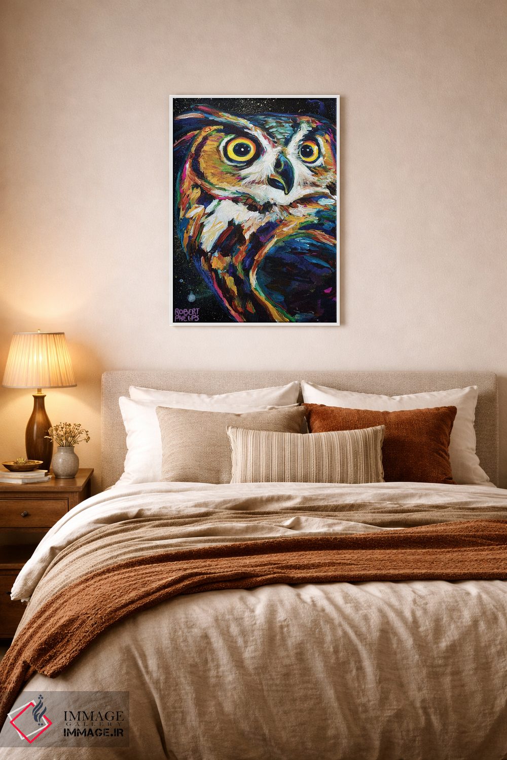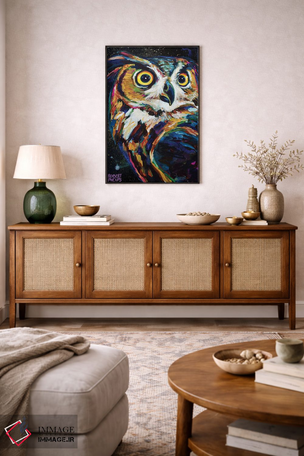 اگر میخواهید دیوار کمی سرزندگیِ محترمانه داشته باشد، «جغد شب» اثرِ «رابرت فلپس» برای دکورهای مینیمال، یک نقطهٔ توجه میسازد، برای خانههایی با چوب و پارچههای گرم گزینهٔ مناسبیست. اگر دنبال اثر دوستداشتنیِ «بیغلو» هستید، این یکی دقیق مینشیند.