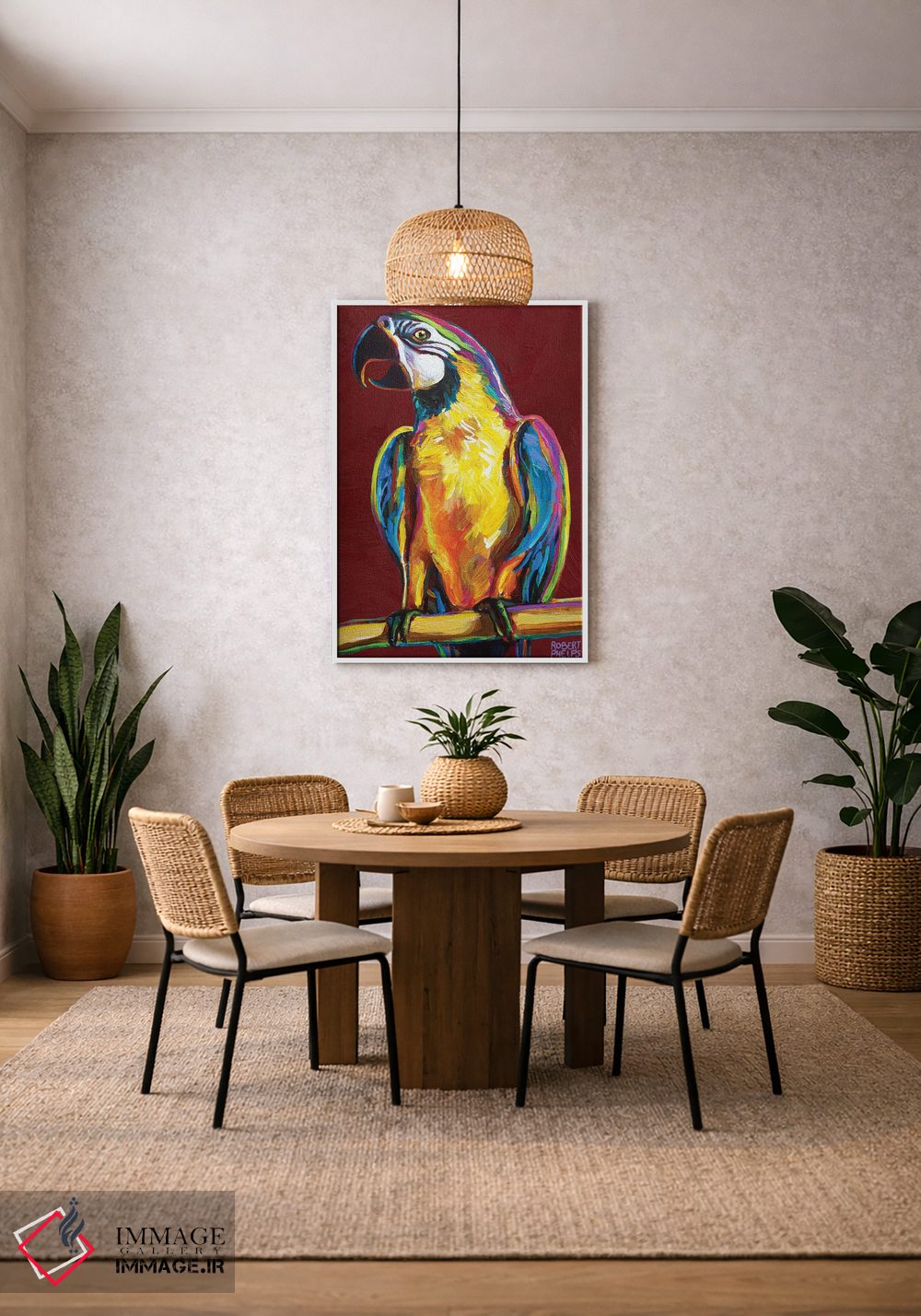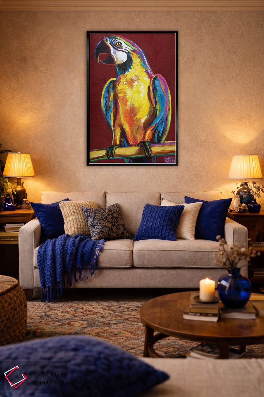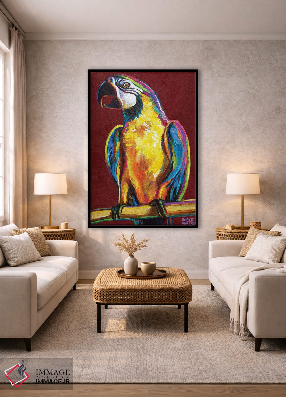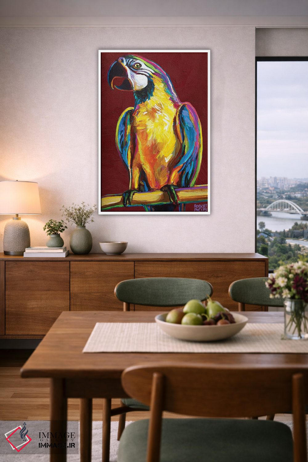 برای دیوارهای ساده، «طوطی روی قرمز» اثرِ «رابرت فلپس» به دیوار، انرژیِ نرم و زنده میدهد؛ برای دکورهای مدرن و مینیمال انتخابی خوشسلیقه است. در کنار گیاهان و نور طبیعی، جذابتر هم میشود.