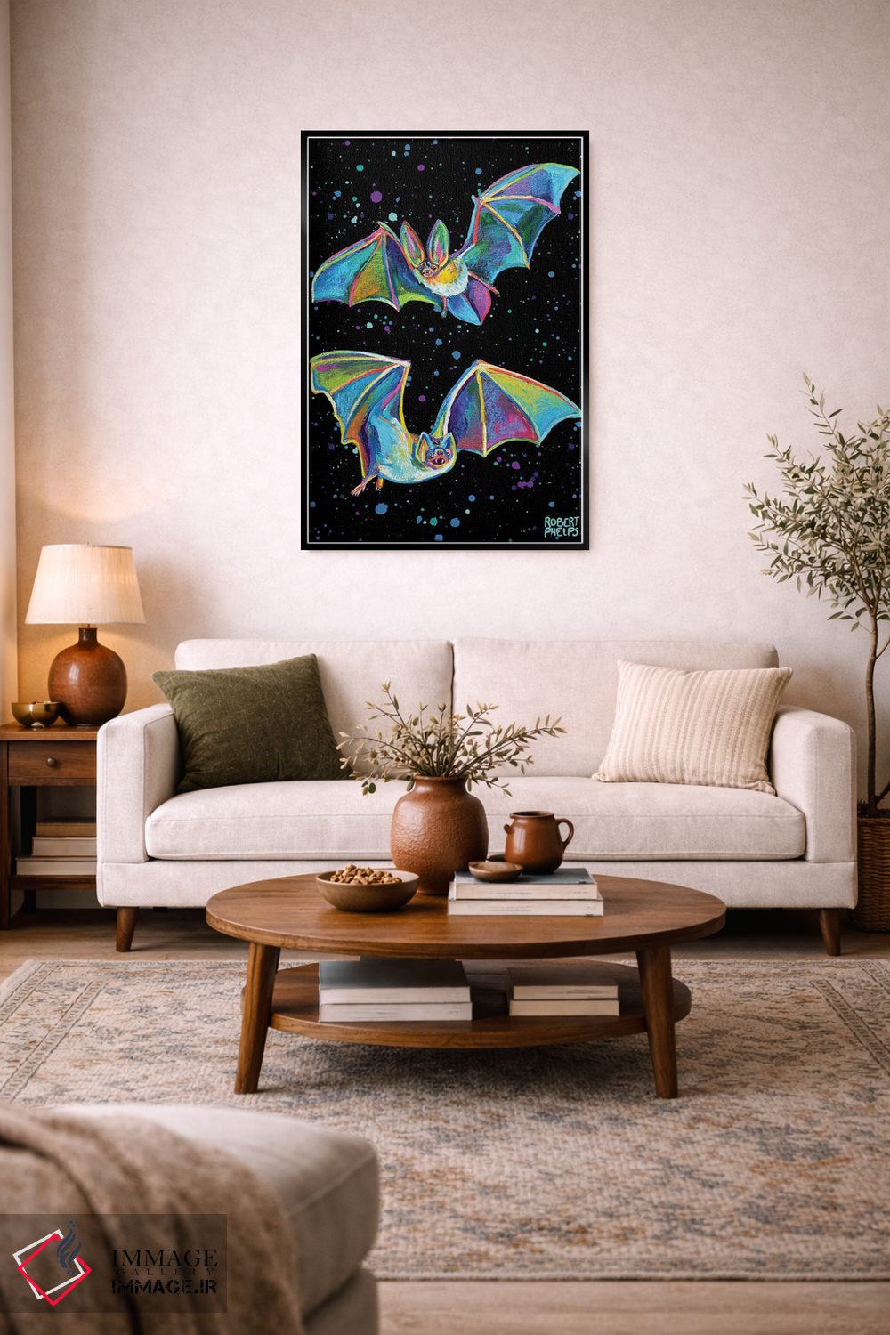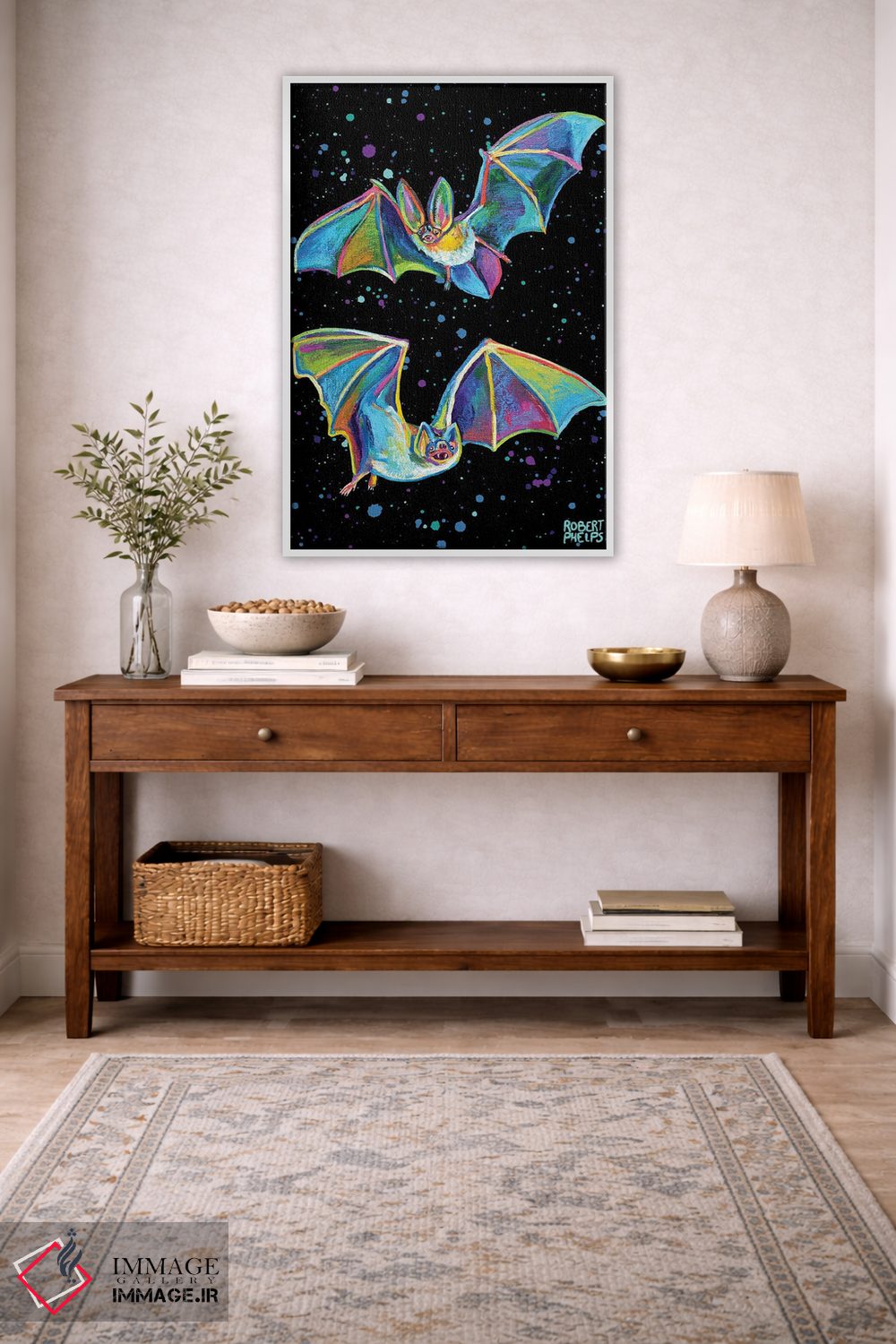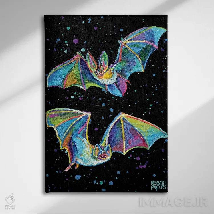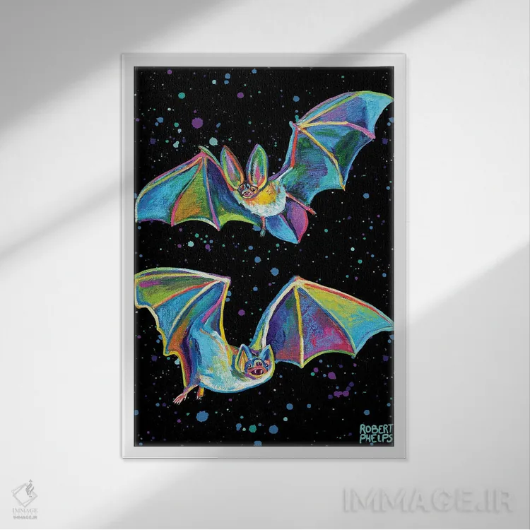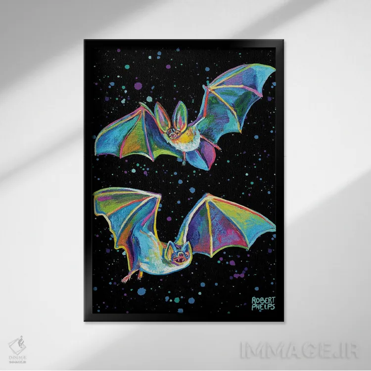 برای دکورهای صمیمی، «خفاشهای پارتی» اثرِ «رابرت فلپس» گرما و شخصیت به فضا اضافه میکند؛ برای دکورهایی با رنگهای خنثی انتخابی خوشسلیقه است. با قاب چوبی یا مشکی، حس مرتبتری پیدا میکند.