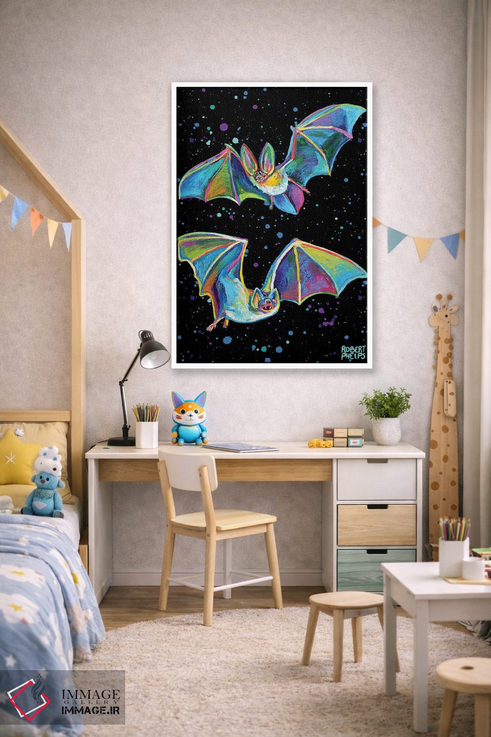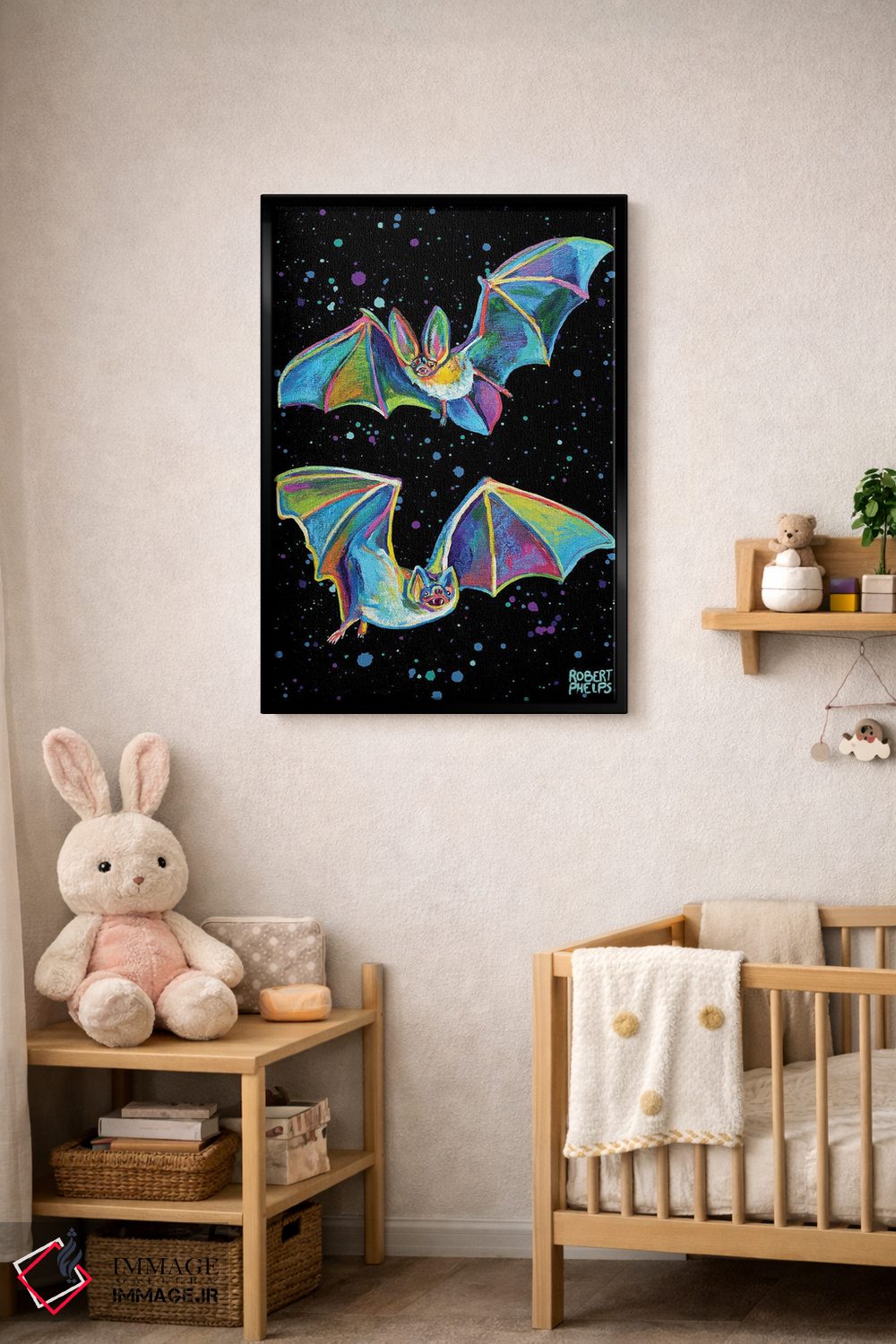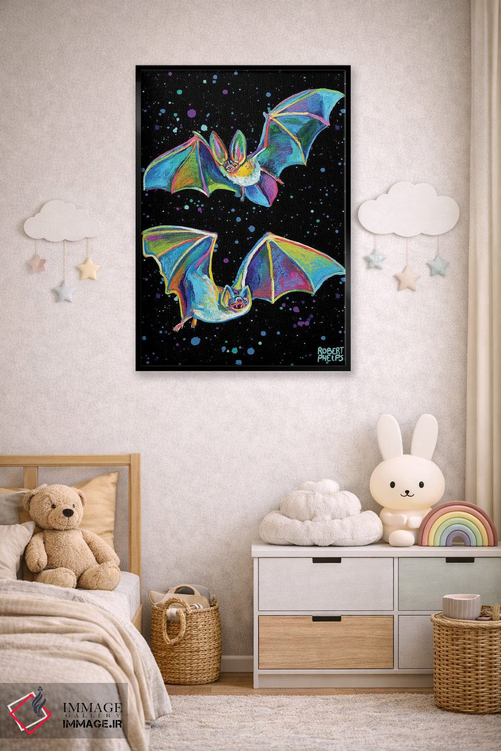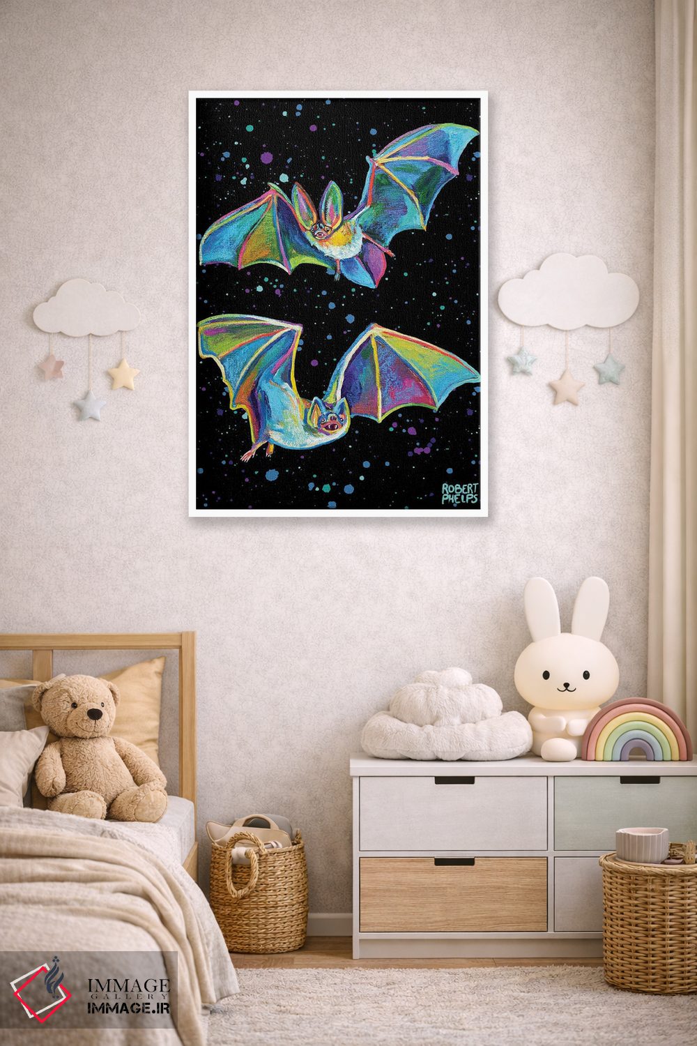 برای دکورهای صمیمی، «خفاشهای پارتی» اثرِ «رابرت فلپس» گرما و شخصیت به فضا اضافه میکند؛ برای دکورهایی با رنگهای خنثی انتخابی خوشسلیقه است. با قاب چوبی یا مشکی، حس مرتبتری پیدا میکند.