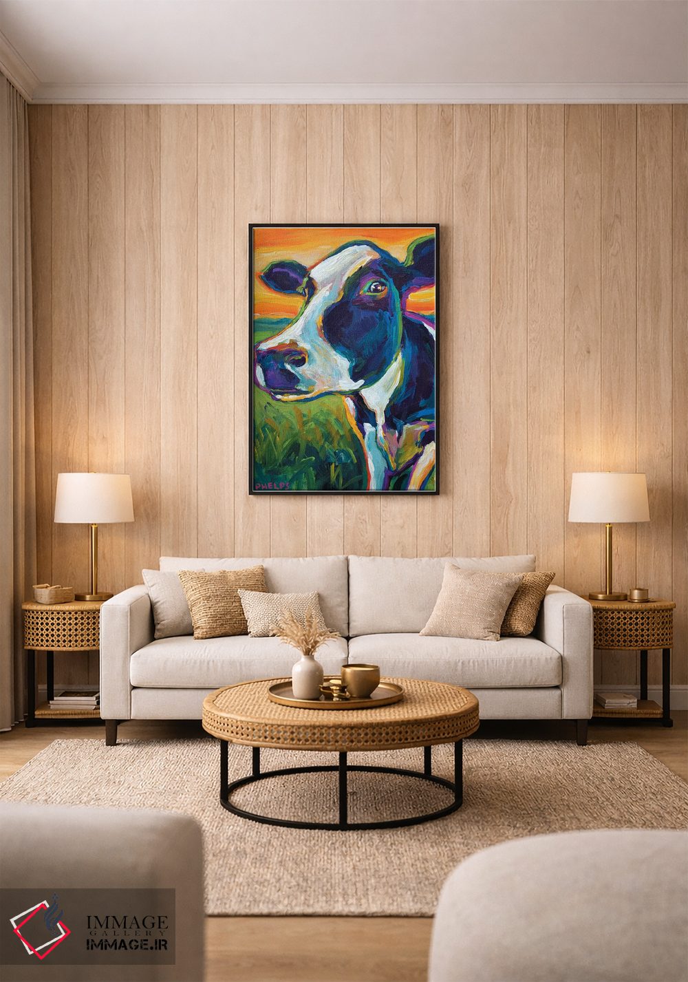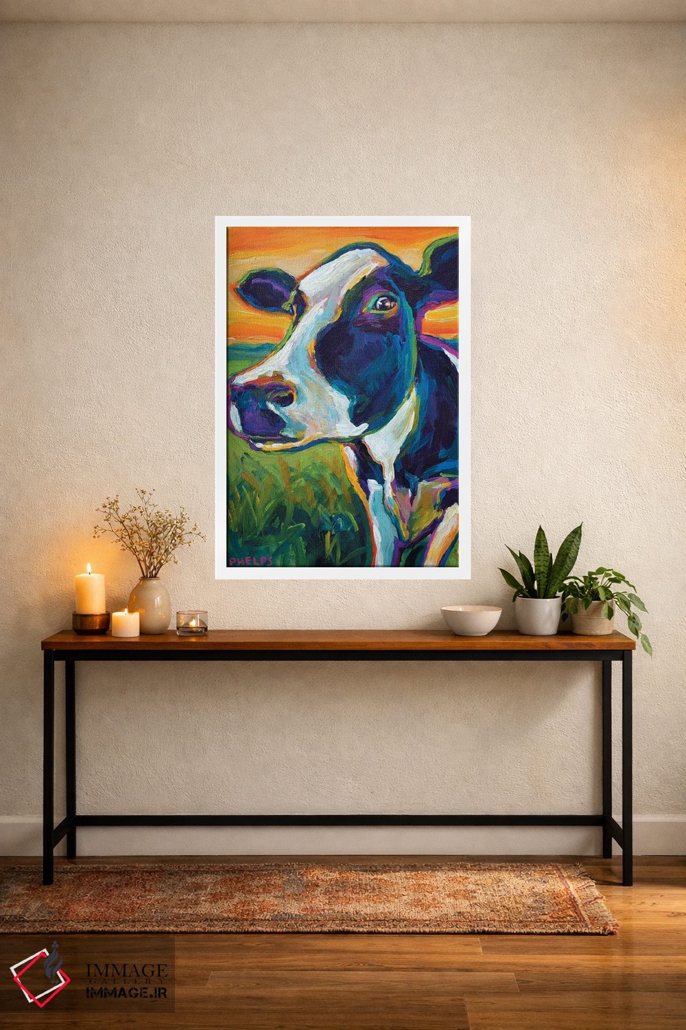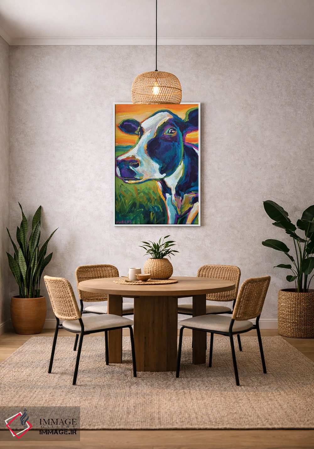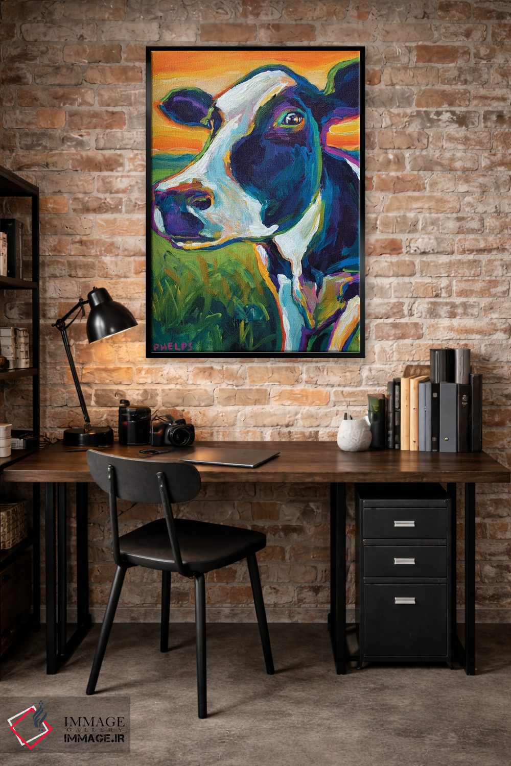 اگر میخواهید دیوار کمی سرزندگیِ محترمانه داشته باشد، «گاو» اثرِ «رابرت فلپس» به دیوار، انرژیِ نرم و زنده میدهد، برای دکورهایی با رنگهای خنثی گزینهٔ مناسبیست. با نورپردازی نقطهای، جذابتر هم میشود.
