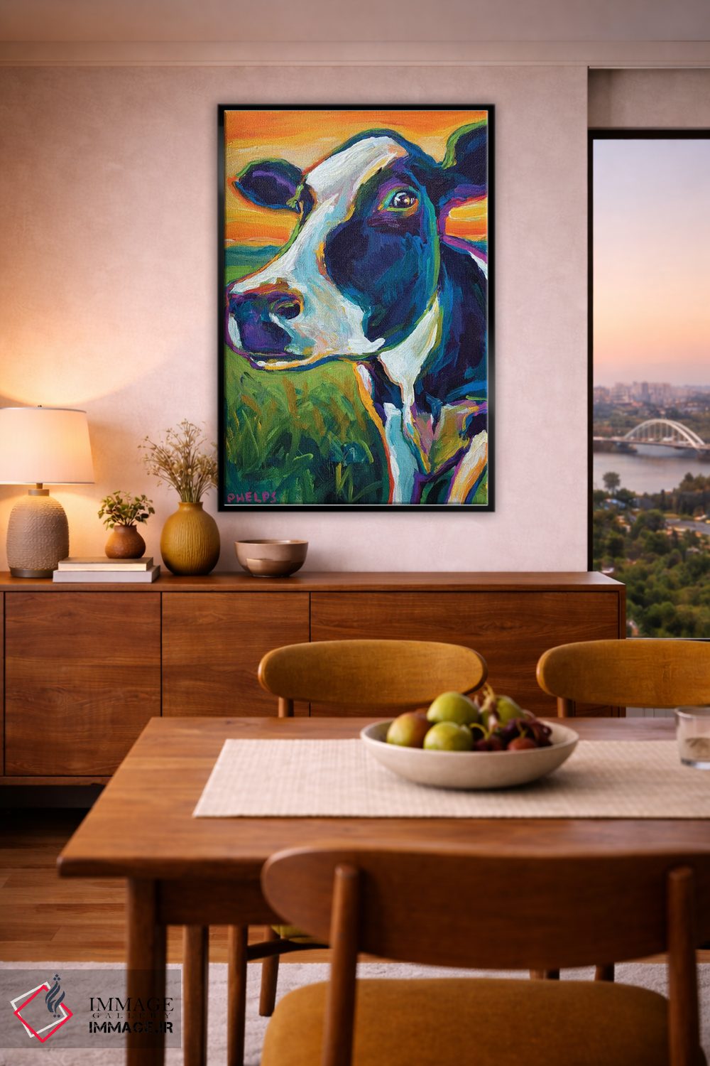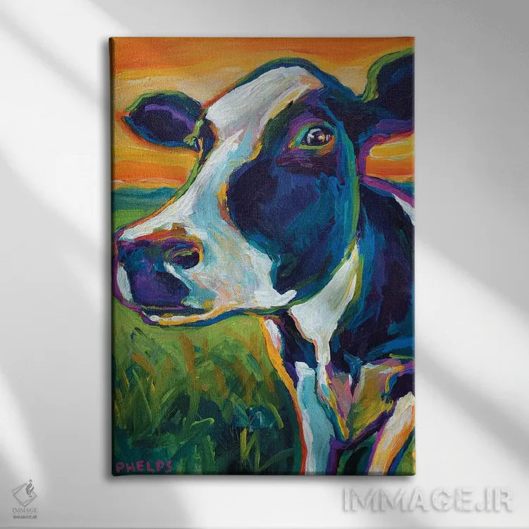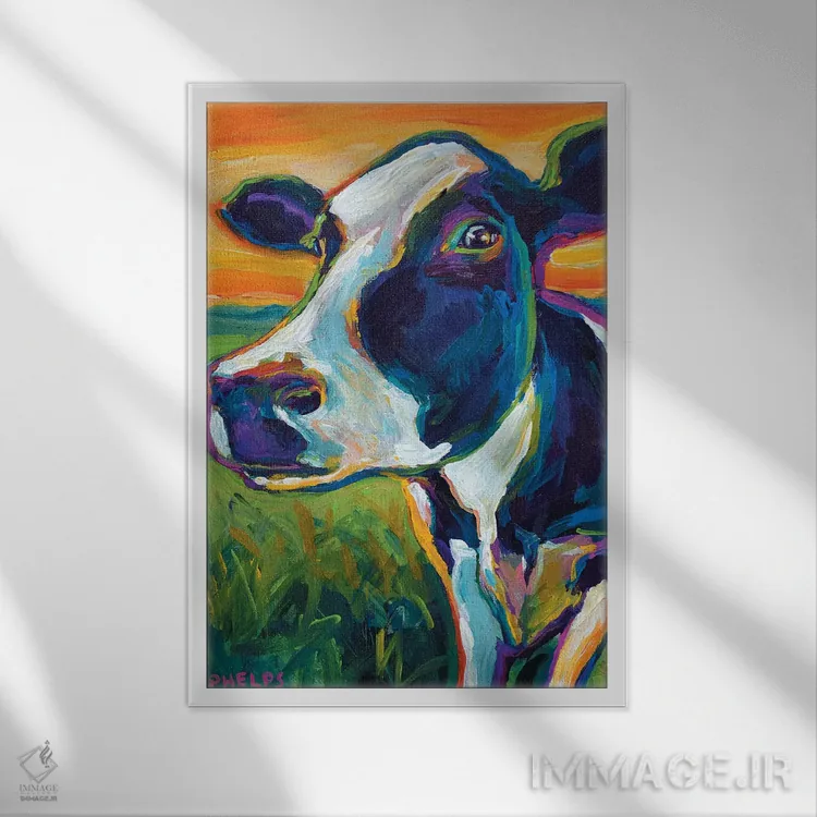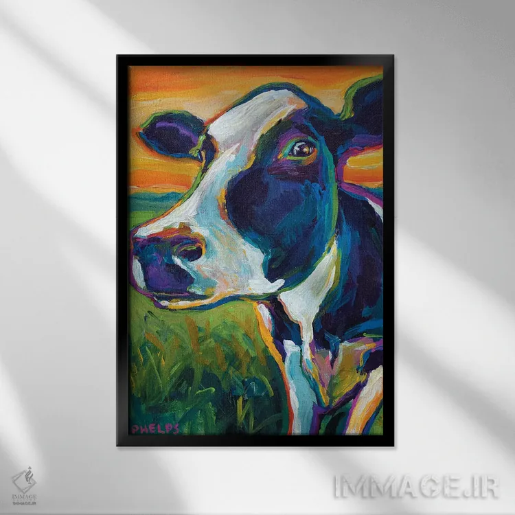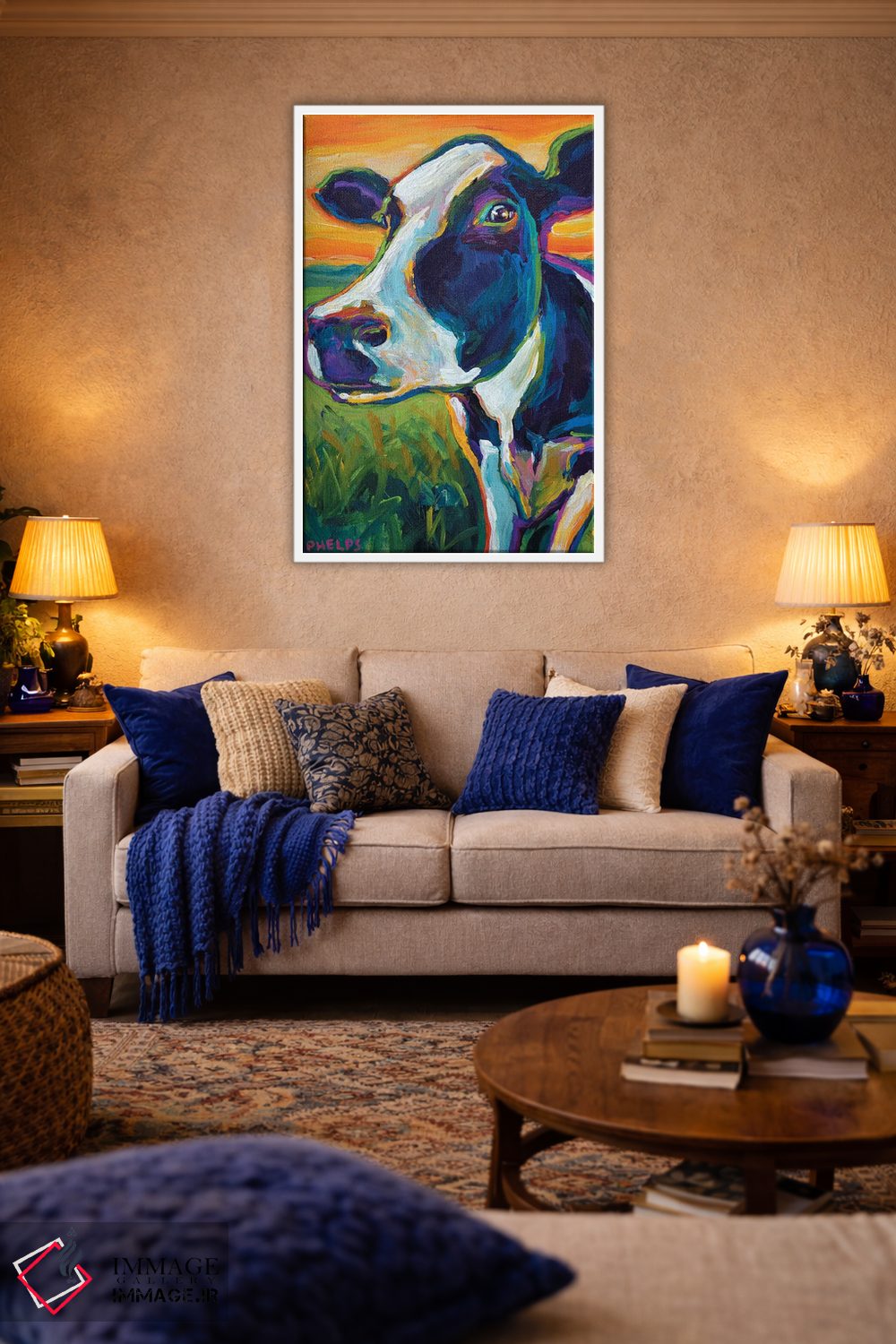 اگر میخواهید دیوار کمی سرزندگیِ محترمانه داشته باشد، «گاو» اثرِ «رابرت فلپس» به دیوار، انرژیِ نرم و زنده میدهد، برای دکورهایی با رنگهای خنثی گزینهٔ مناسبیست. با نورپردازی نقطهای، جذابتر هم میشود.