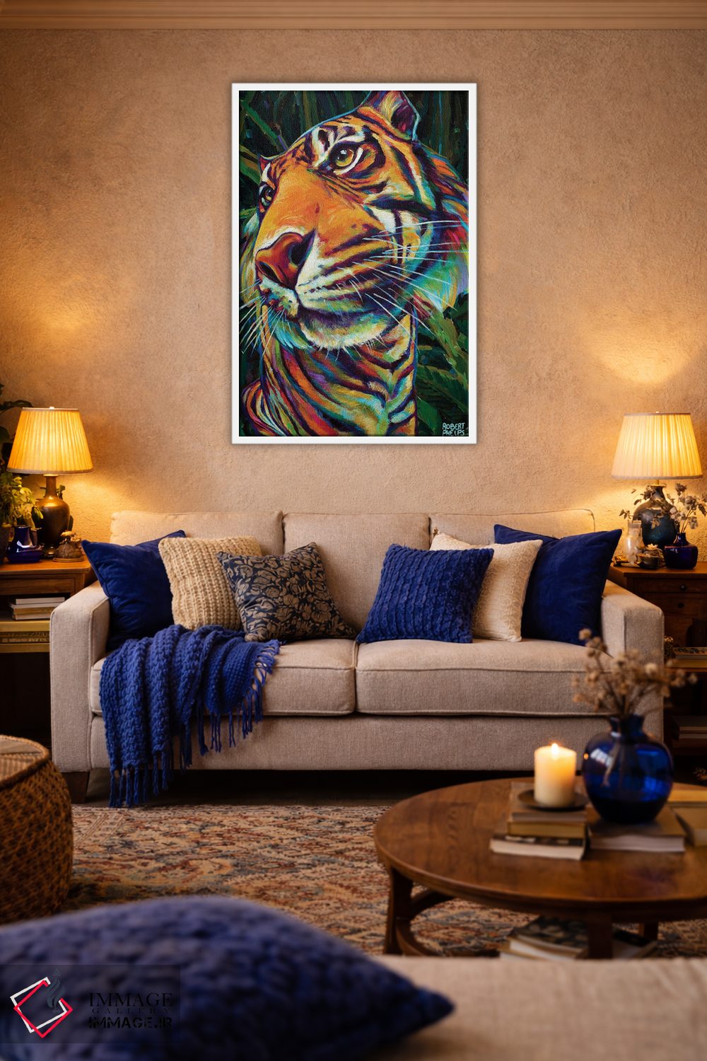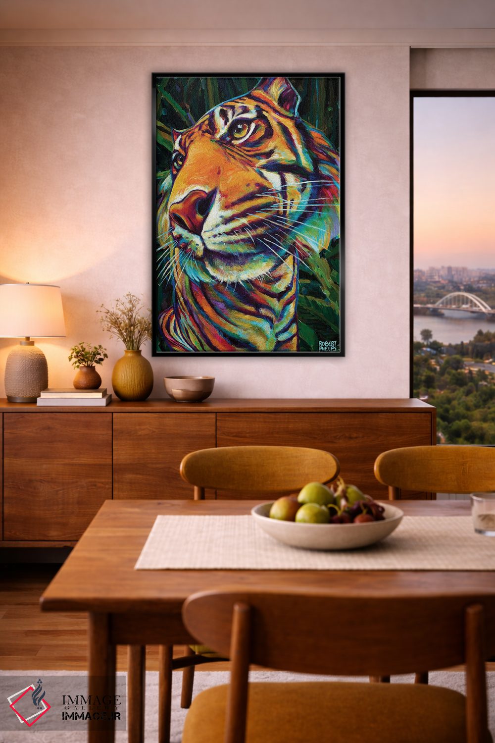 برای دیوارهای ساده، «ببر جنگلی» اثرِ «رابرت فلپس» در کنار رنگهای خنثی، تضاد دلچسبی میسازد؛ برای راهروها و ورودیهای گرم انتخابی خوشسلیقه است. به دیوار، قصه میدهد—اما قصهای آرام و شیک.