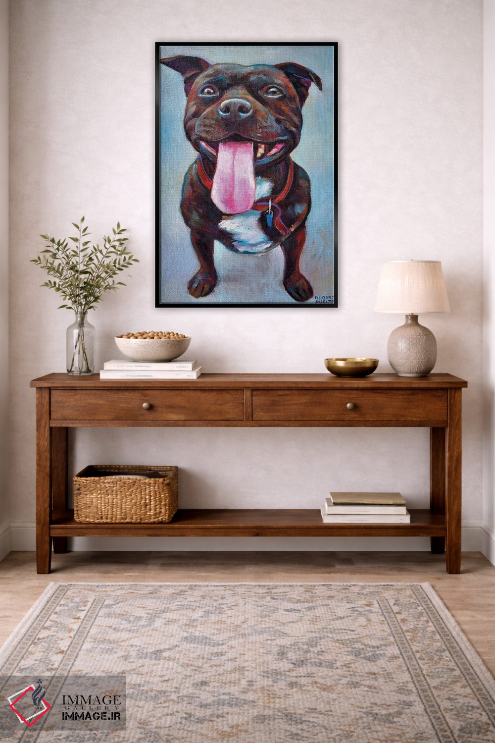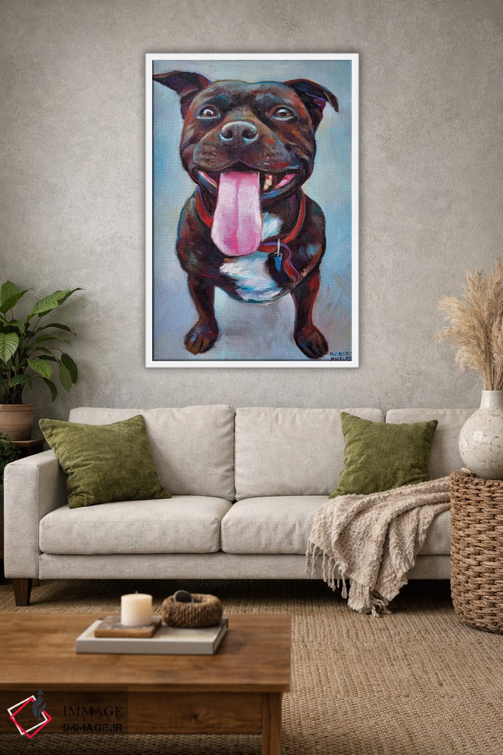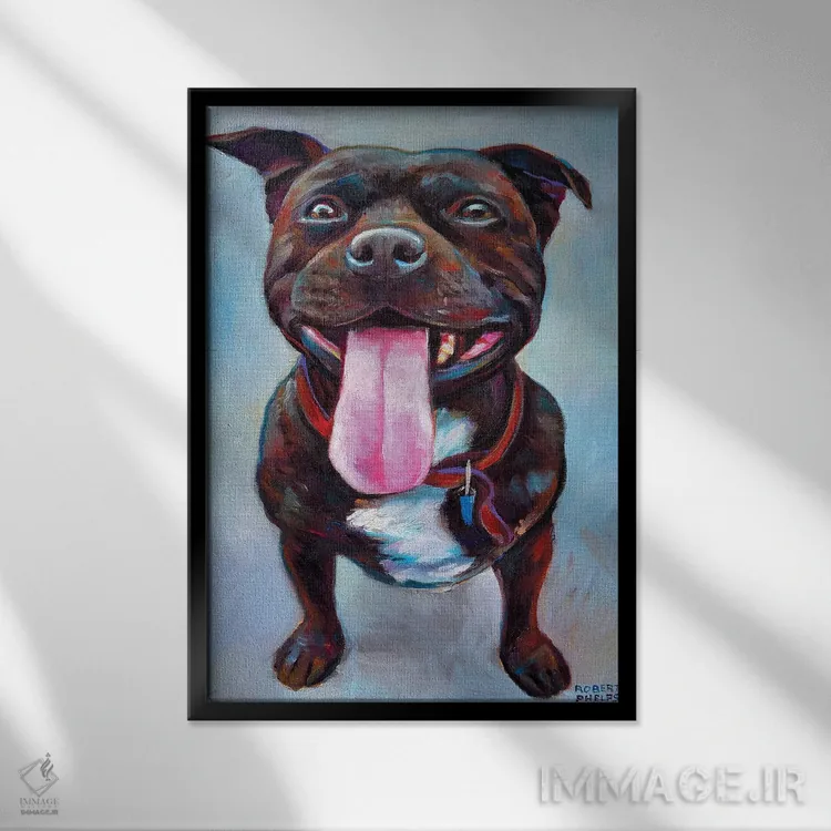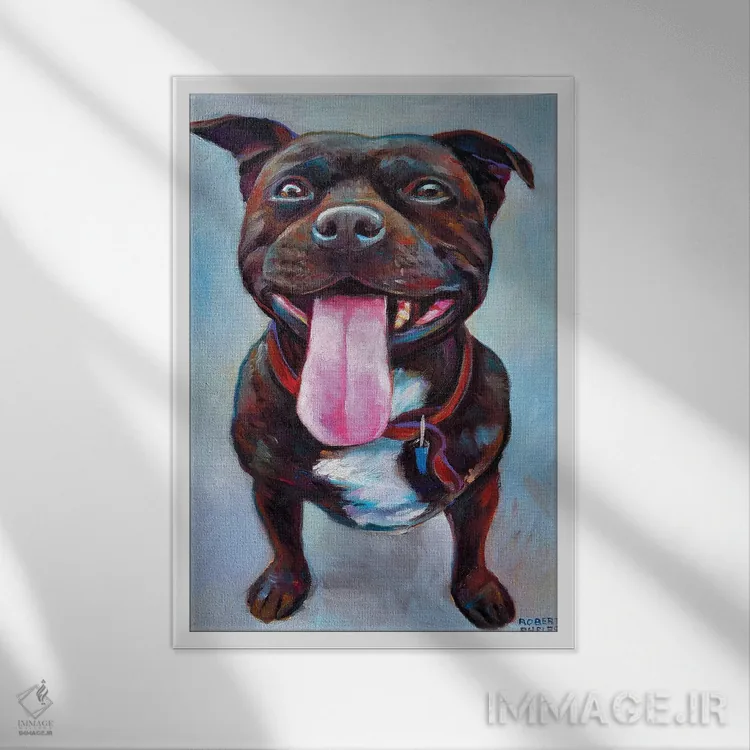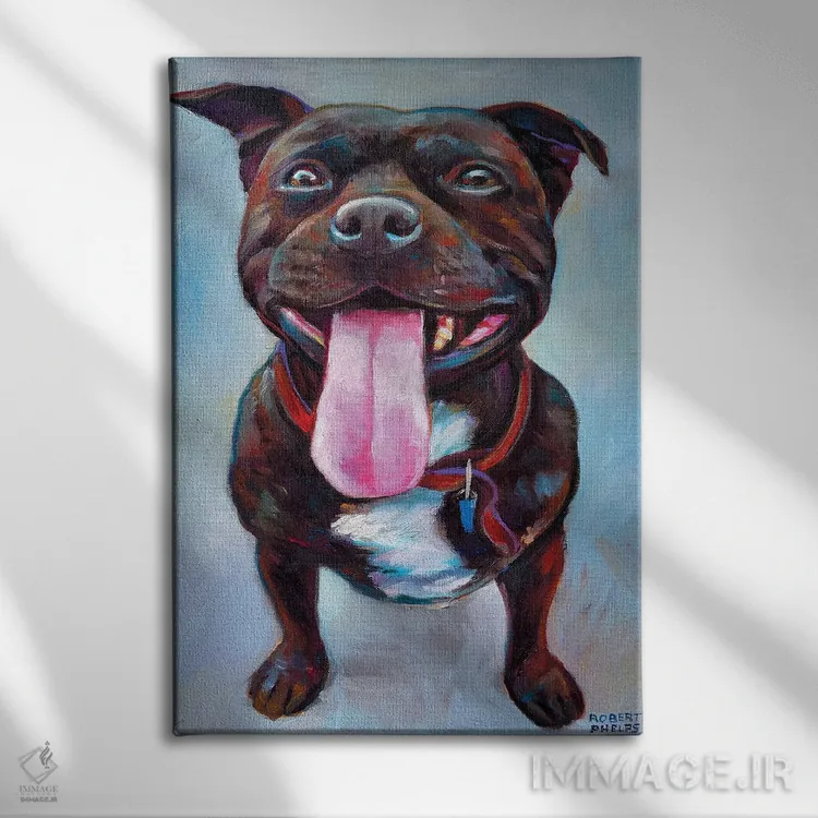 در «پیتبول» اثرِ «رابرت فلپس»، حضور حیوانات بدون کودکانه شدن، بازیگوش و خوشپرداخت میماند؛ برای هدیهدادن به دوستداران حیوانات انتخابی خوشسلیقه است. با قاب چوبی یا مشکی، حس مرتبتری پیدا میکند.