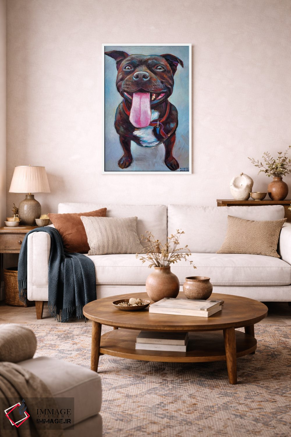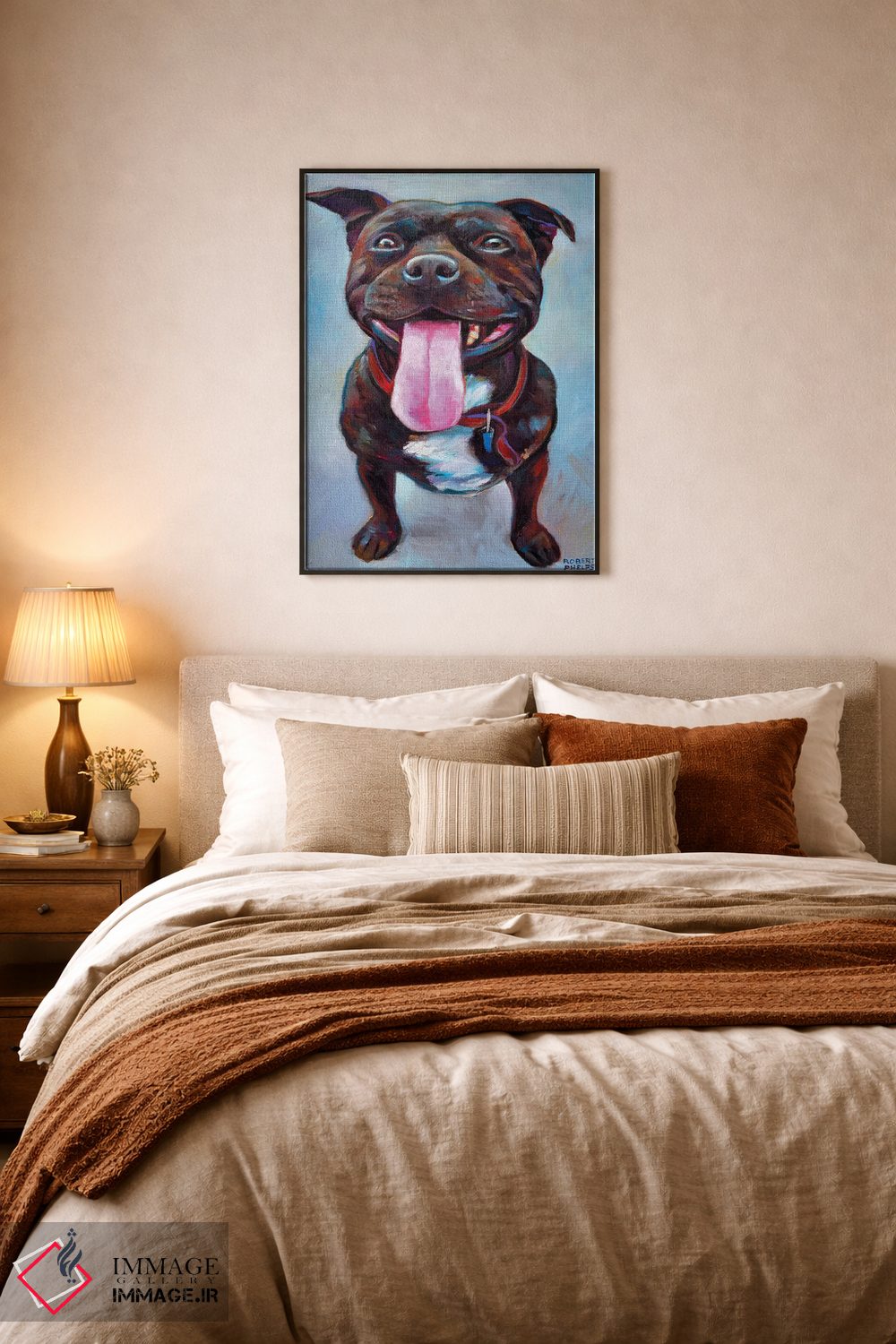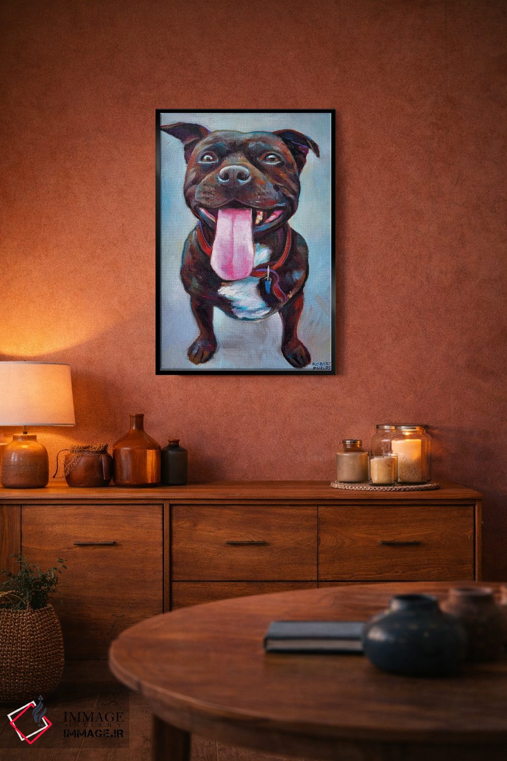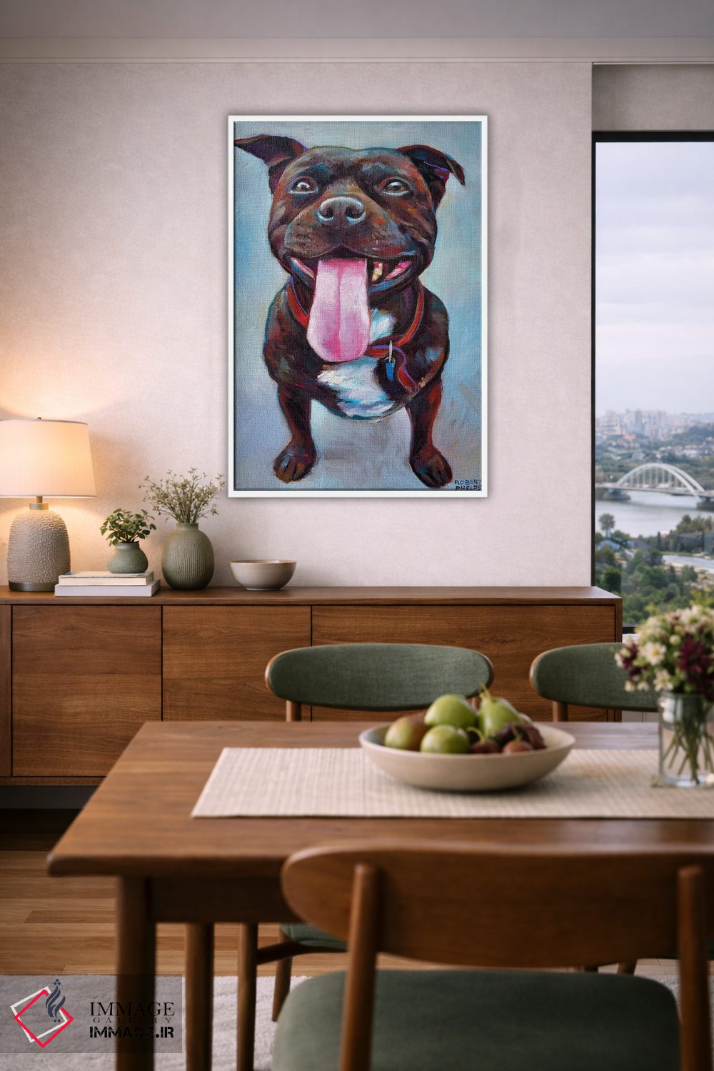 در «پیتبول» اثرِ «رابرت فلپس»، حضور حیوانات بدون کودکانه شدن، بازیگوش و خوشپرداخت میماند؛ برای هدیهدادن به دوستداران حیوانات انتخابی خوشسلیقه است. با قاب چوبی یا مشکی، حس مرتبتری پیدا میکند.