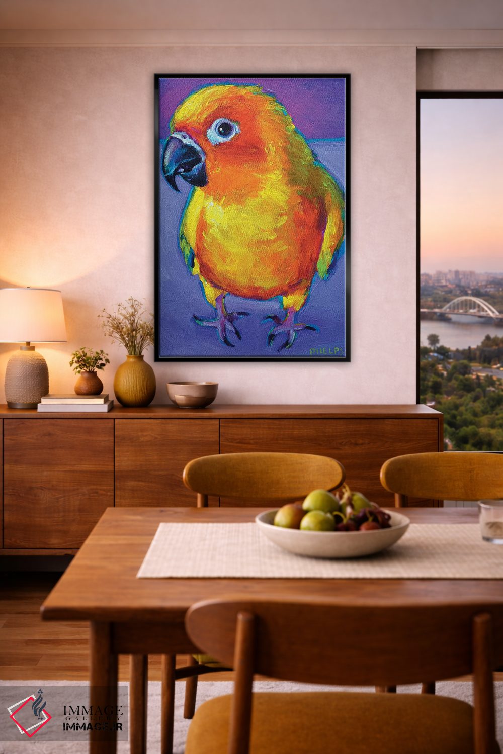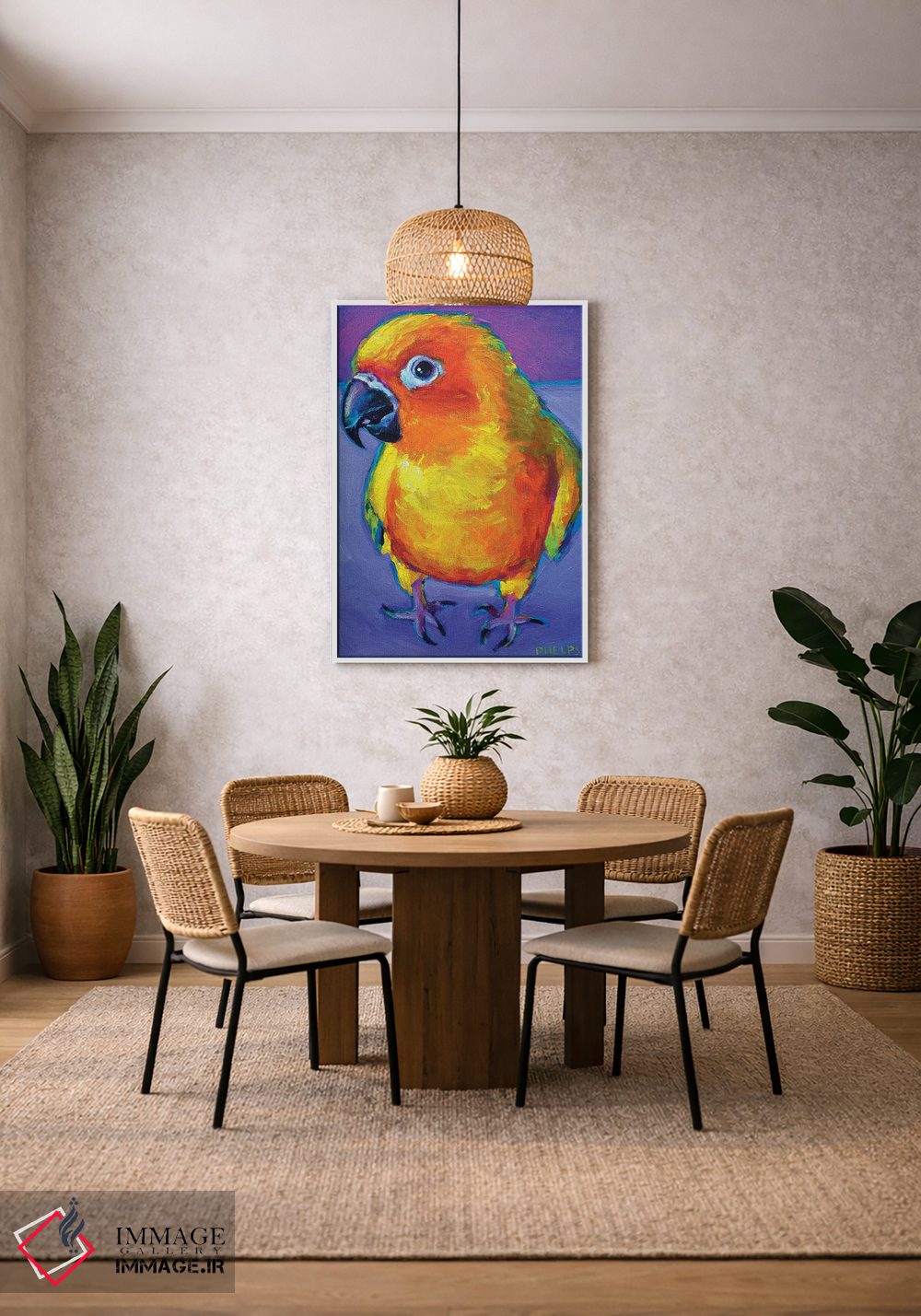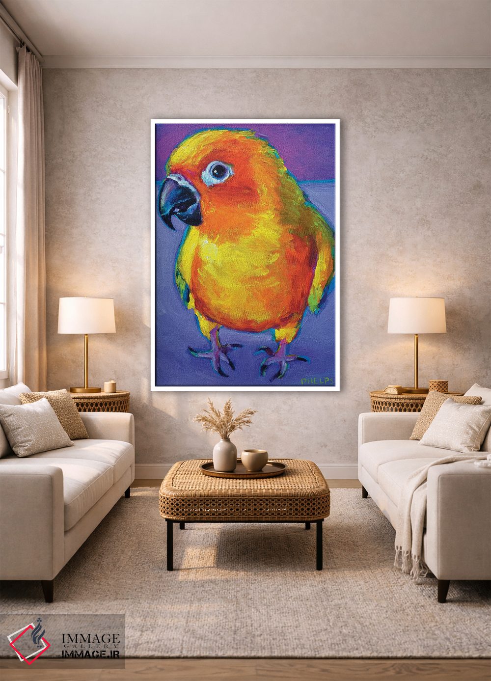 «طوطی آفتابی (سان کانور)» اثرِ «رابرت فلپس» از آن کارهاییست که به دیوار، انرژیِ نرم و زنده میدهد؛ برای خانههایی با چوب و پارچههای گرم انتخاب خوبیست. هم فضا را گرم میکند، هم شلوغش نمیکند.