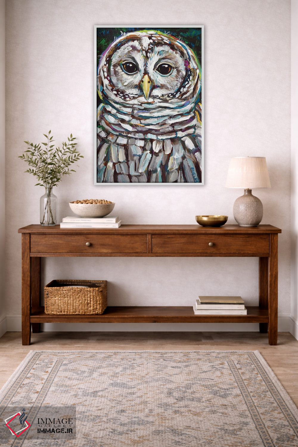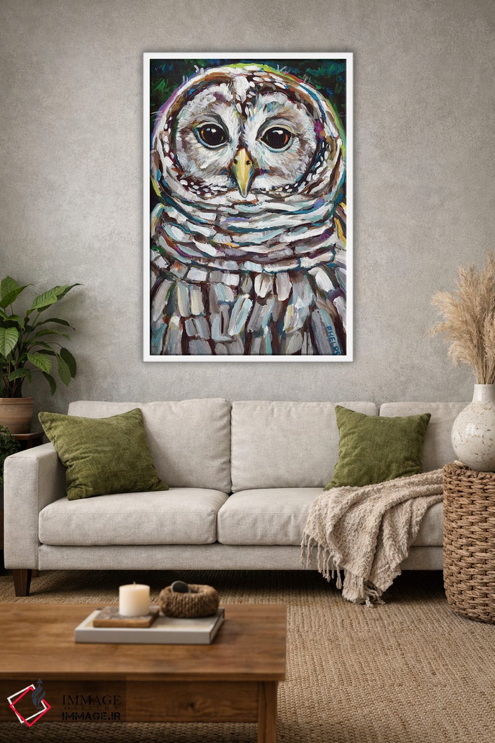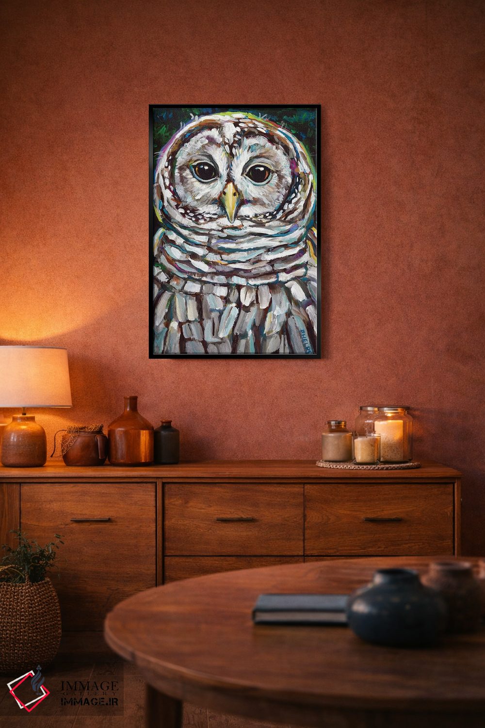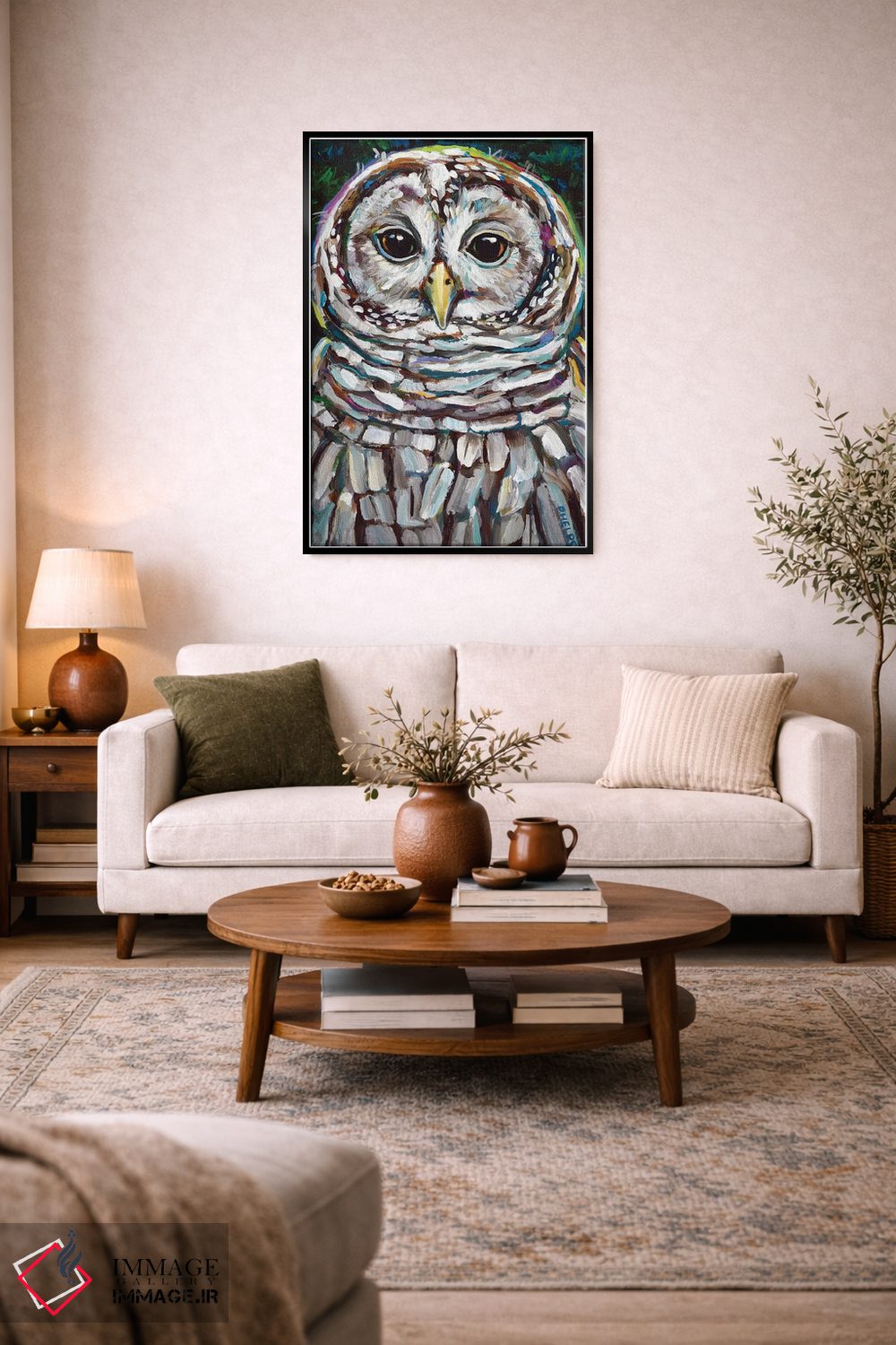 «جغد راهراه» اثرِ «رابرت فلپس» میتواند در کنار رنگهای خنثی، تضاد دلچسبی بسازد؛ برای کافههای کوچک و صمیمی پیشنهاد میشود. با نورپردازی نقطهای، جذابتر هم میشود.