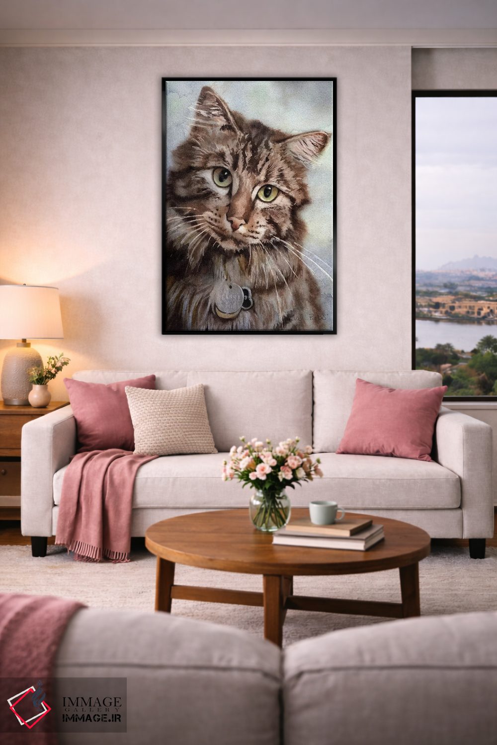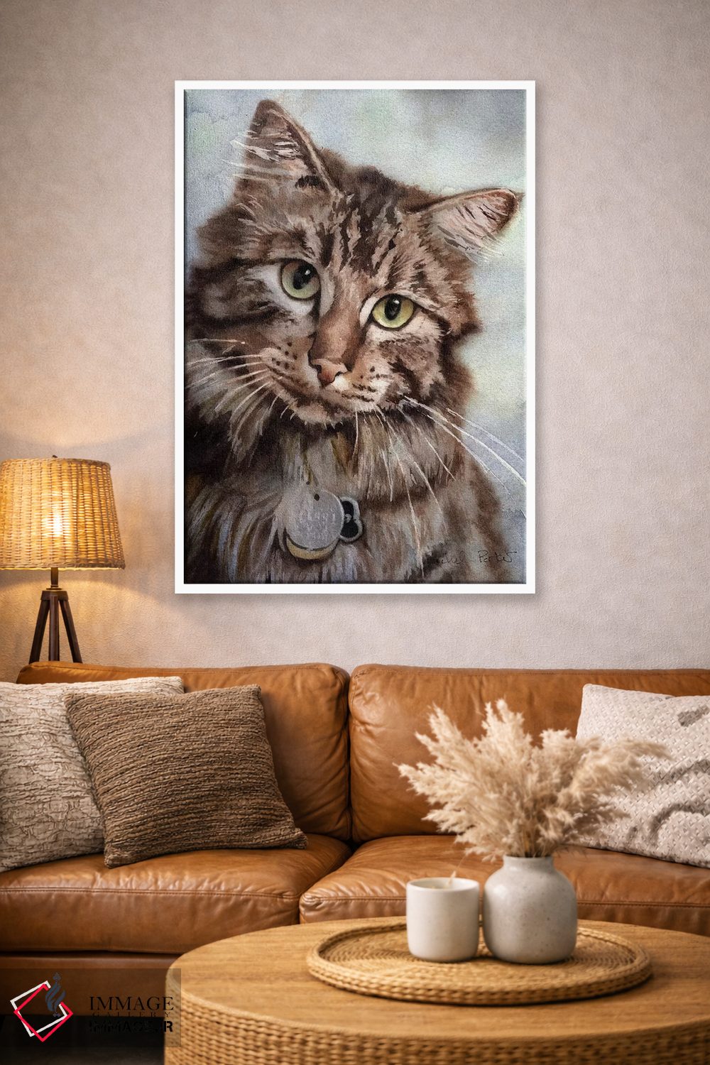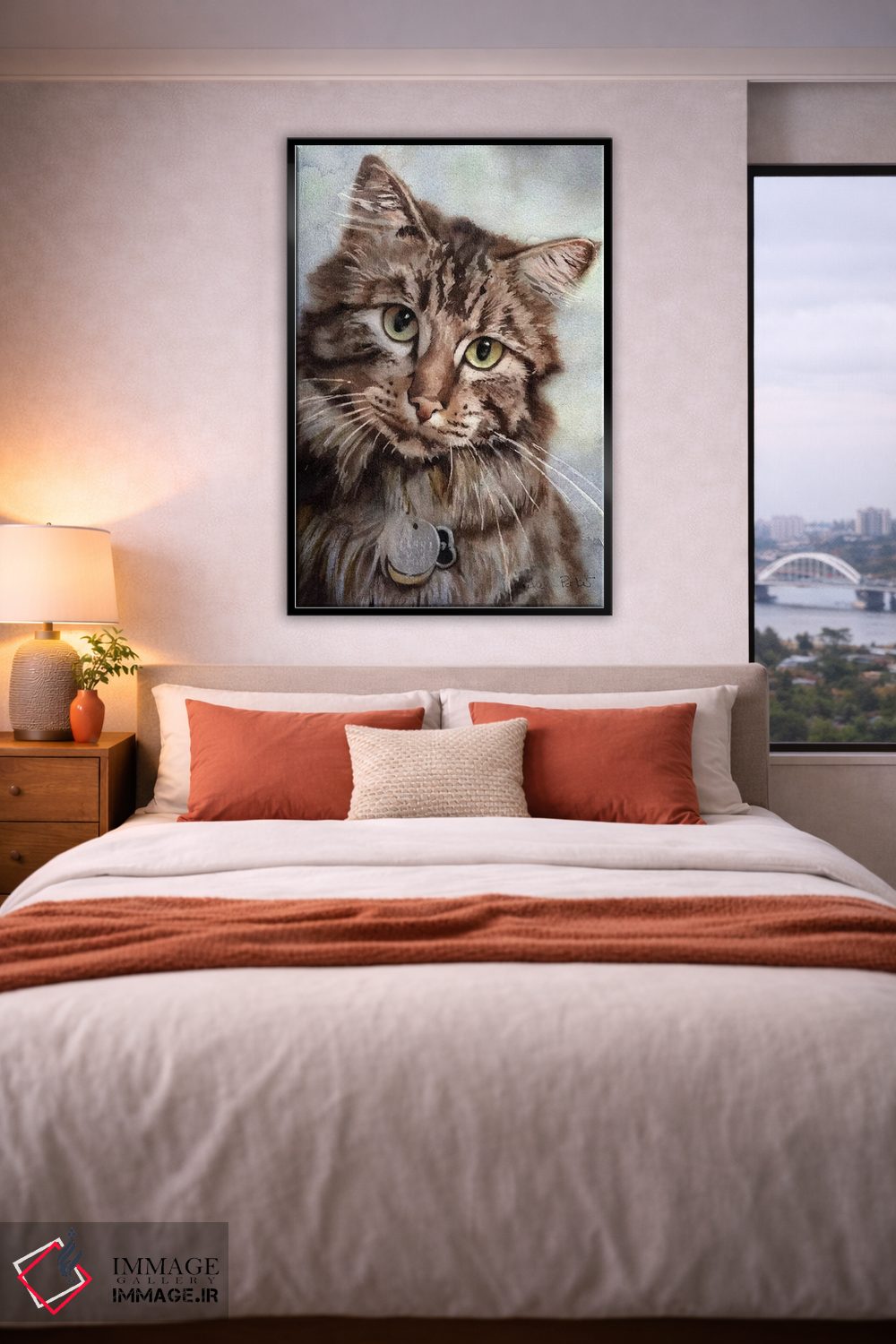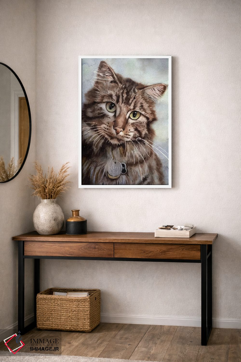 براساس پالت گرم اثر، قاب بلوط روشن (چوبی) پیشنهاد اول است و استخوانی ملایم مکمل. برای سفارشهای پروژهای با ابعاد و قابهای اختصاصی با ایماژ در تماس باشید.