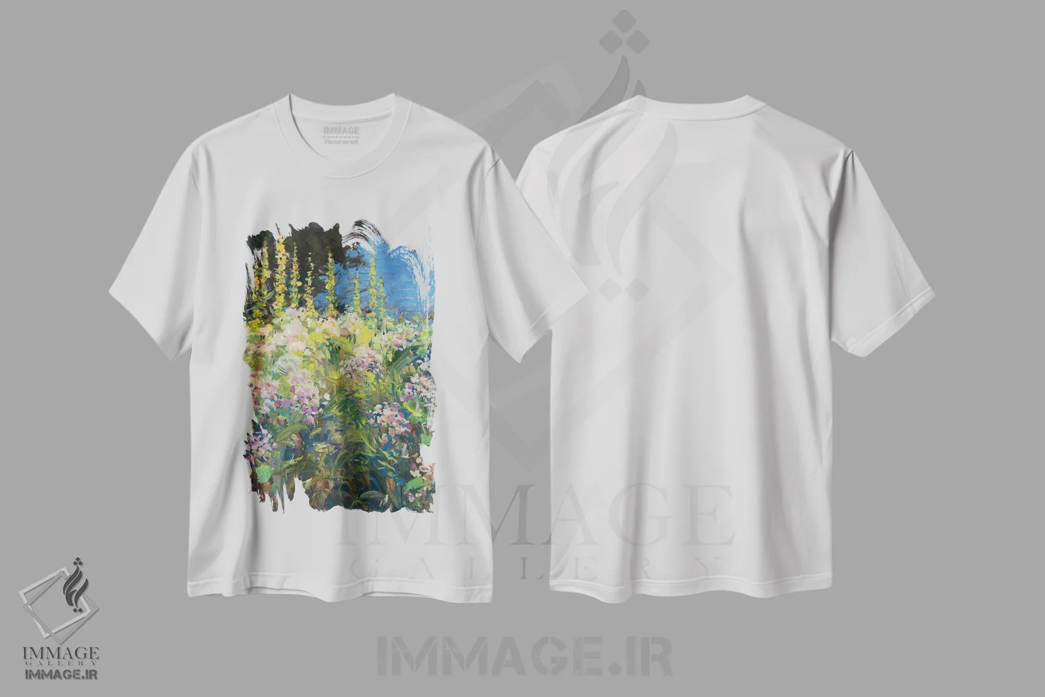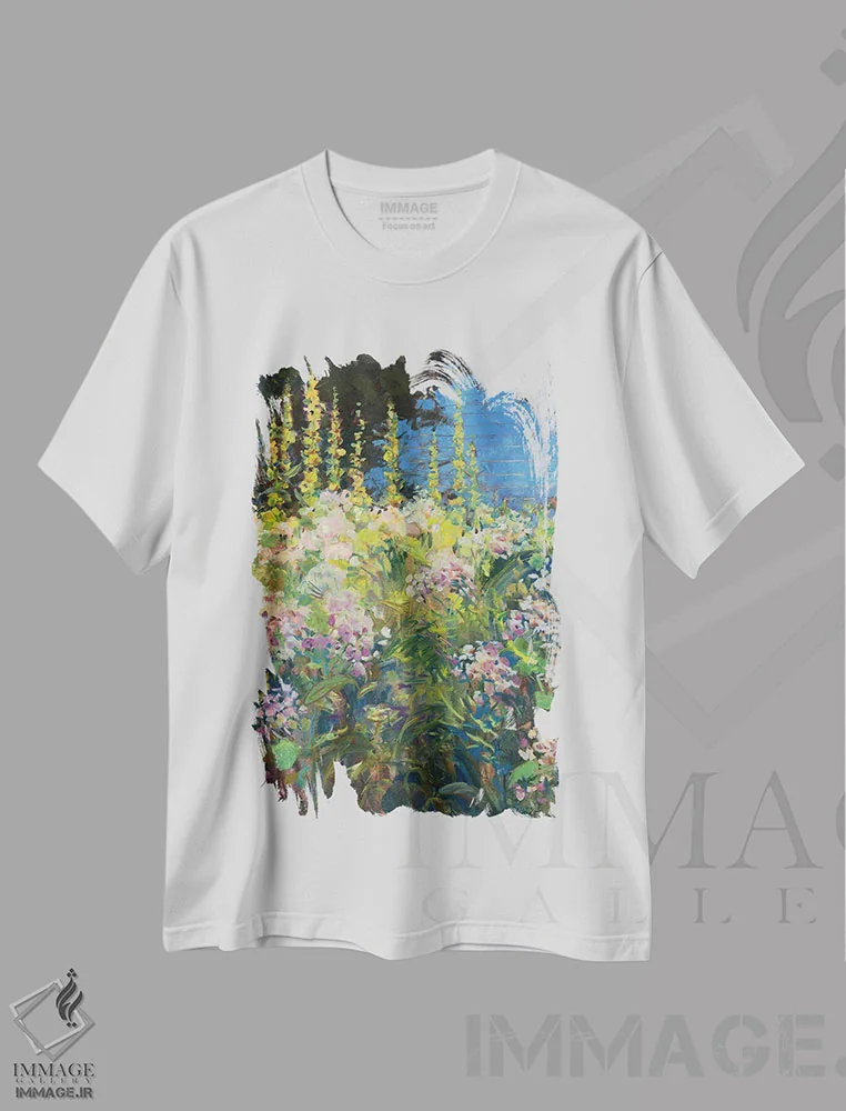 تیشرت سفید طرح دار گل ختمی، هنر فاخر معاصر اثر کترین ام الیوت | immage.ir