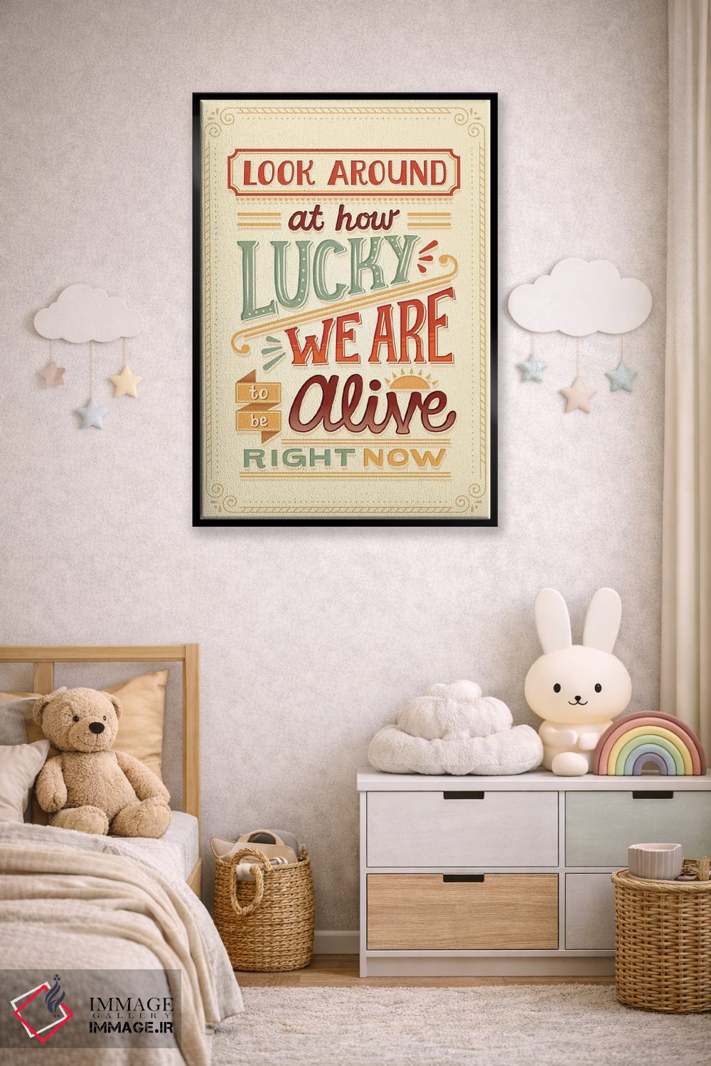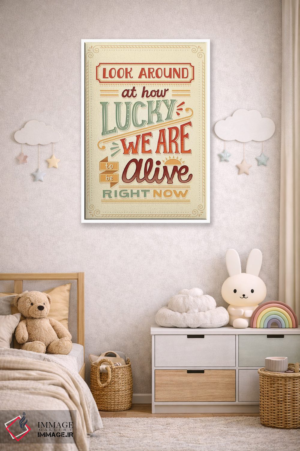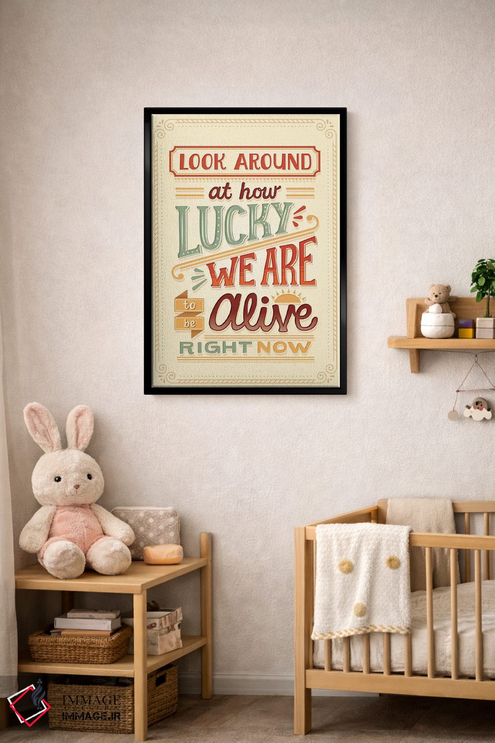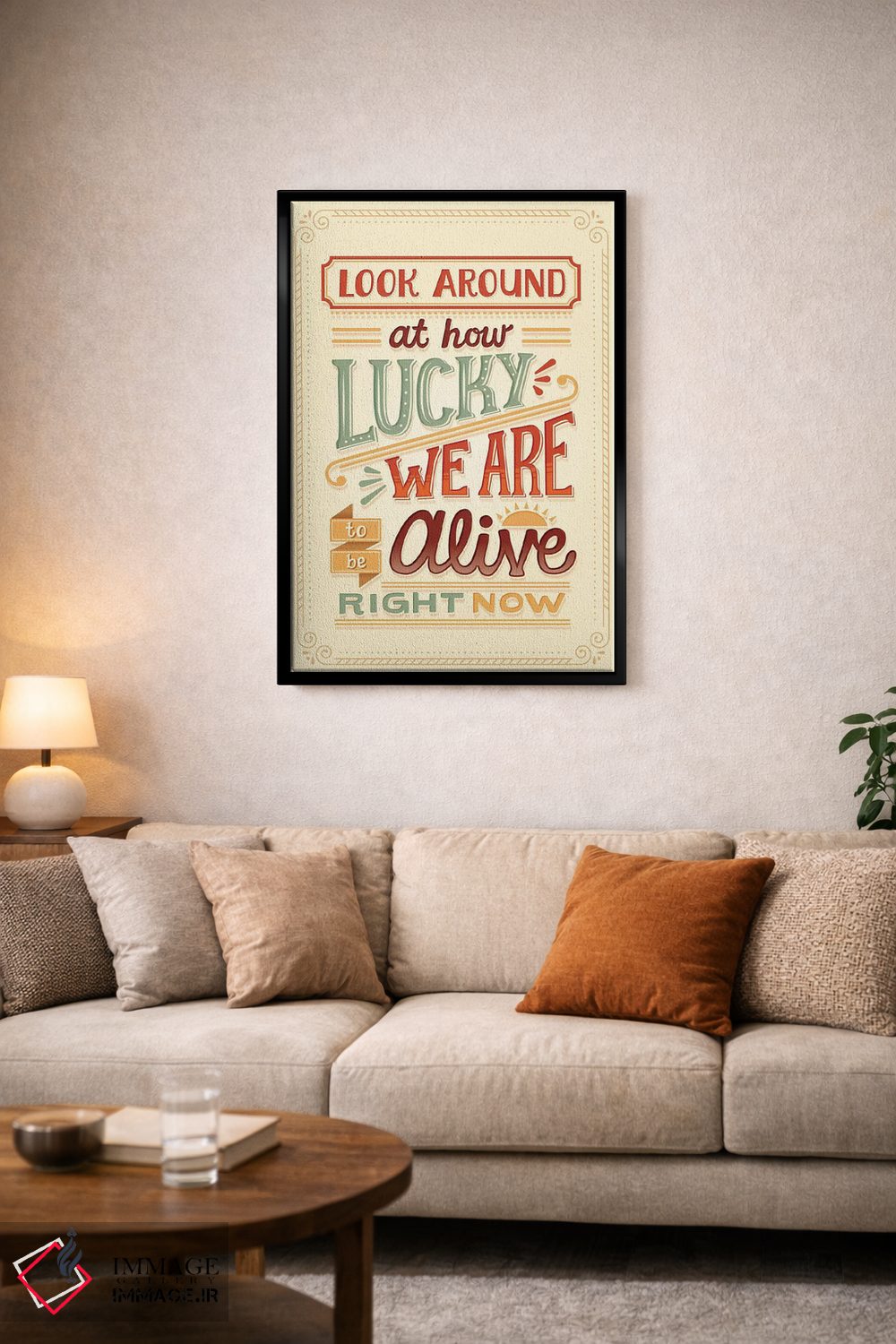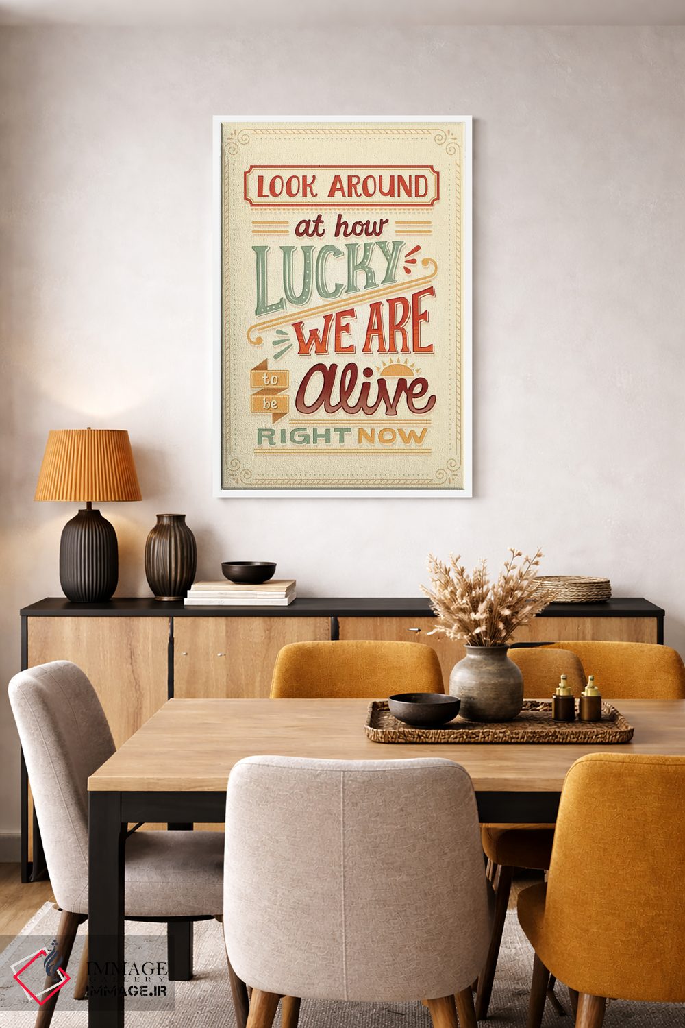 براساس پالت گرم اثر، قاب بلوط روشن (چوبی) پیشنهاد اول است و استخوانی ملایم مکمل. برای سفارشهای پروژهای با ابعاد و قابهای اختصاصی با ایماژ در تماس باشید.