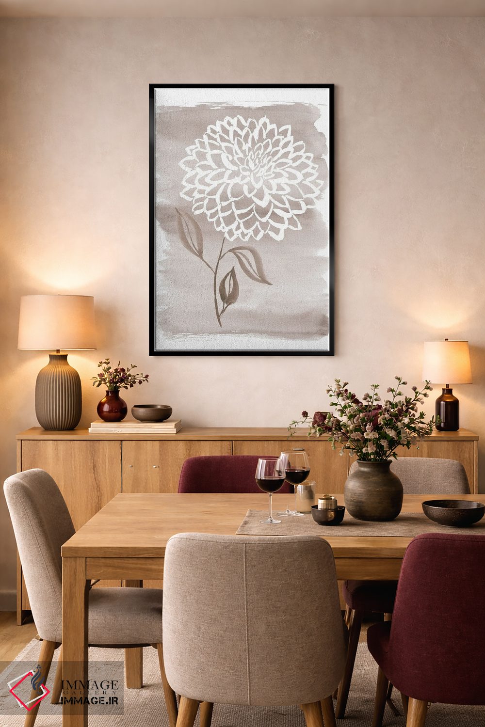 اگر به دکورهای طبیعی علاقه دارید، «دالیای ملایم تاوپ (قهوهای خاکستری)» اثرِ «سارا برنسون» حس فصل را آرام وارد فضا میکند، برای کافهها و فضاهای آرام گزینهٔ مناسبیست. حضورش آرام است، اما بیاثر نیست.