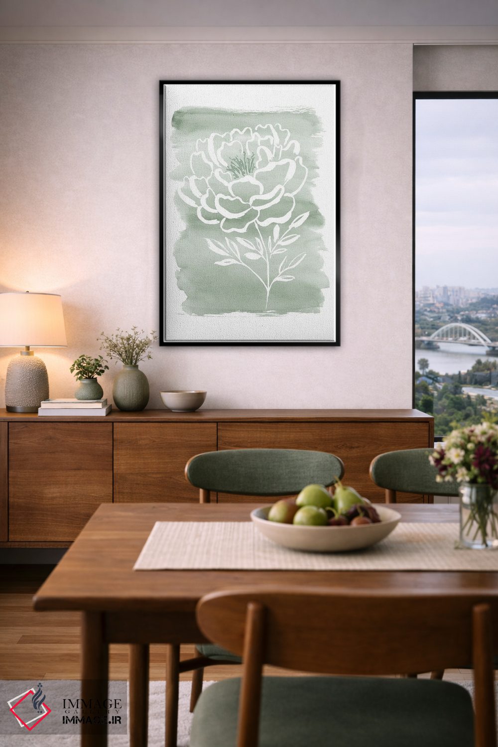 برای دیواری که میخواهید نرمتر دیده شود، «گل صدتومانی و سبز مریم» اثرِ «سارا برنسون» چیدمان را از خشکی بیرون میآورد؛ برای فضاهای بوهمی انتخابی خوشسلیقه است. همیشه بهروز میماند و با فصلها خوب کنار میآید.