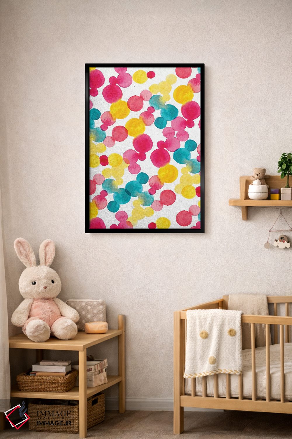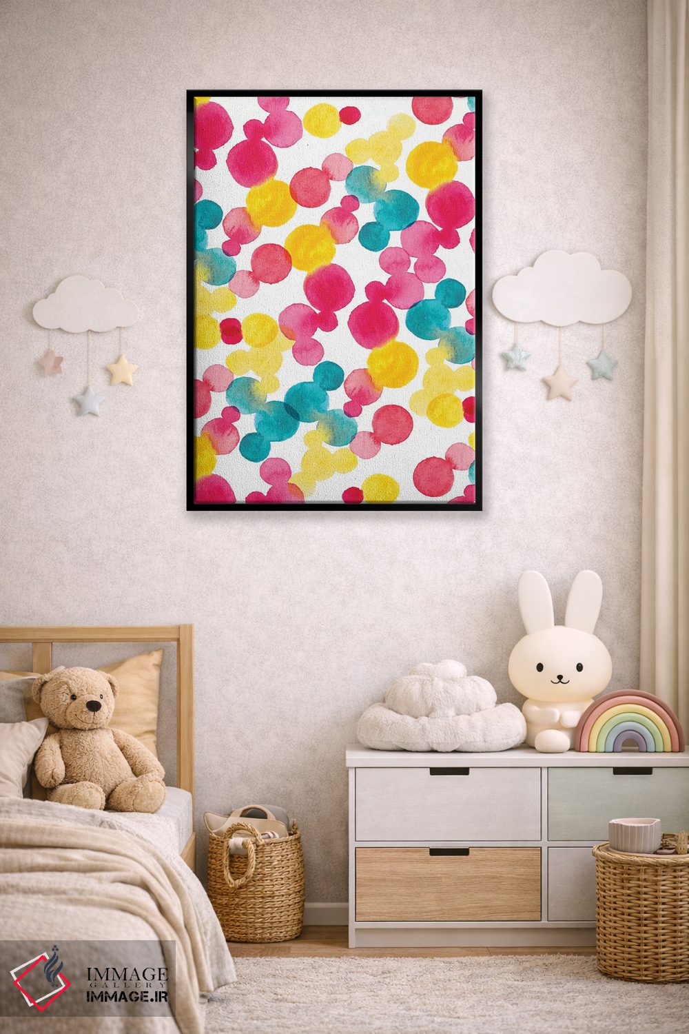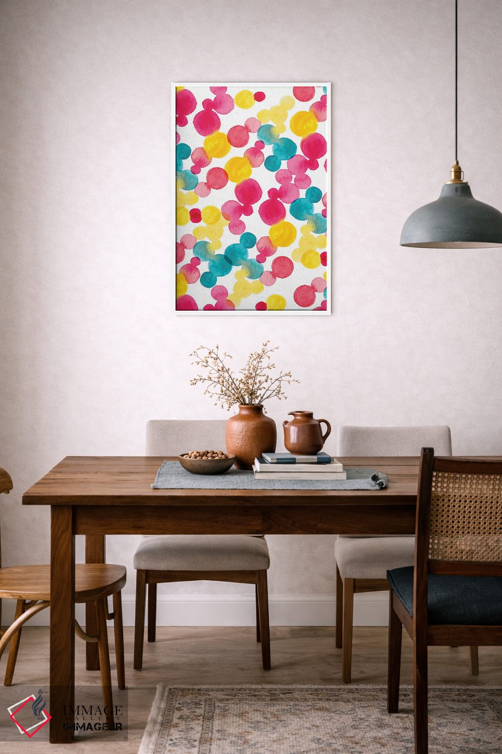 «نقاط آبرنگی» اثرِ «سارا برنسون» در فضای هنری، بیشتر روی ریتمِ رنگ و فرم تکیه دارد و برای دکورهای مدرن عالی مینشیند.