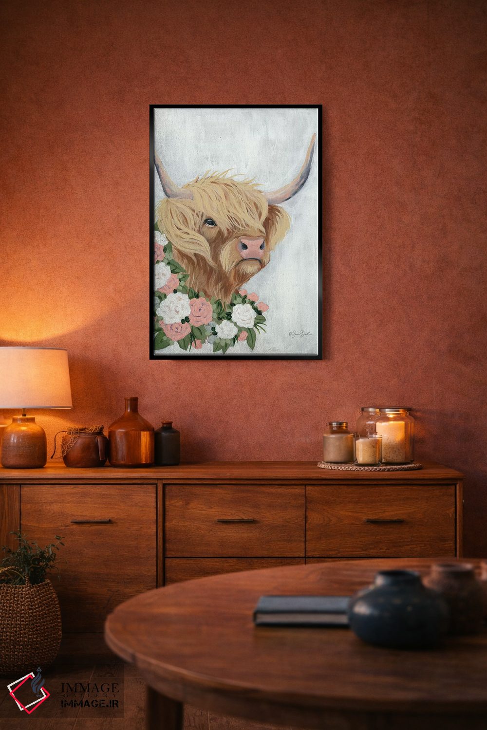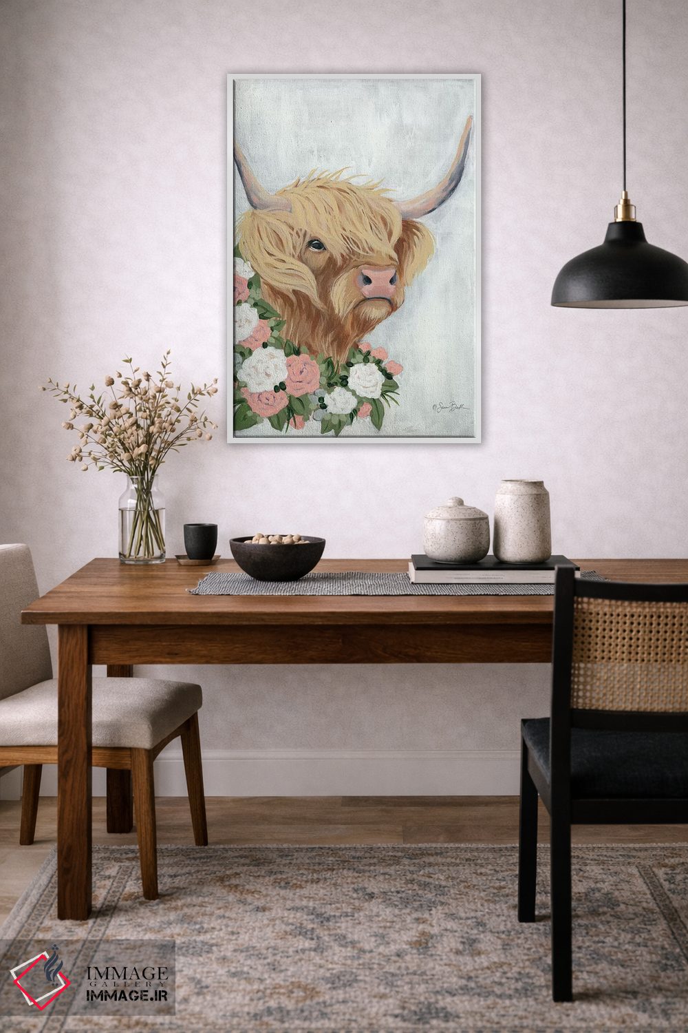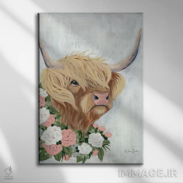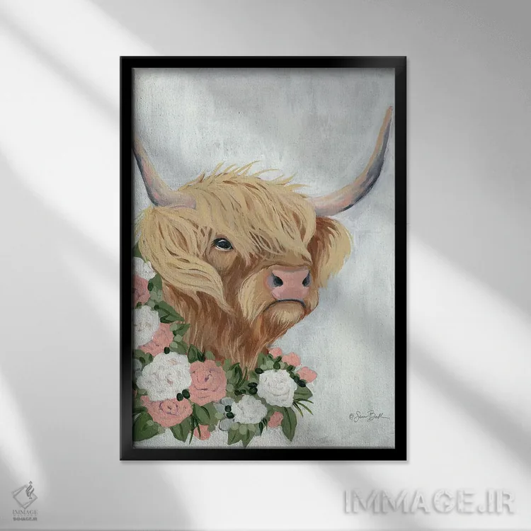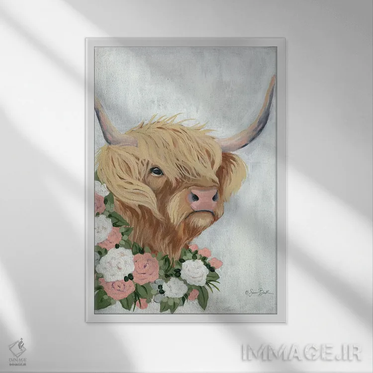 برای دیوارهای ساده، «گاو کوهستانی گلداری» اثرِ «سارا بیکر» گرما و شخصیت به فضا اضافه میکند؛ برای کافههای کوچک و صمیمی انتخابی خوشسلیقه است. در کنار گیاهان و نور طبیعی، جذابتر هم میشود.