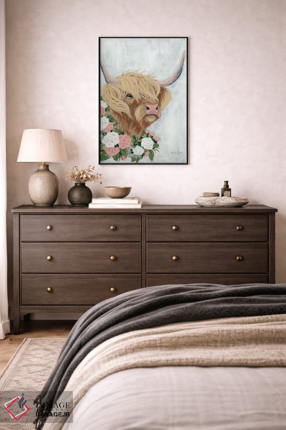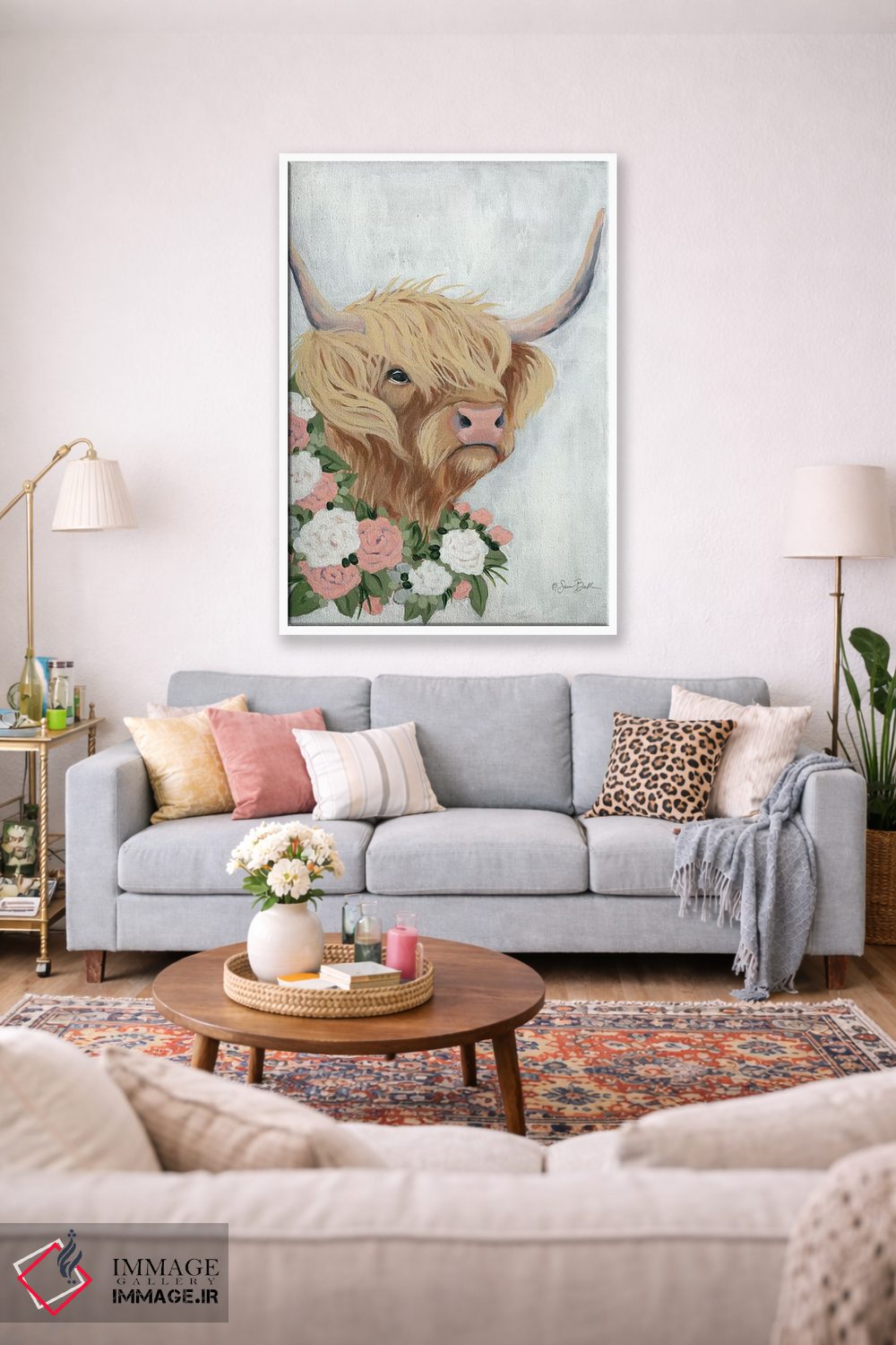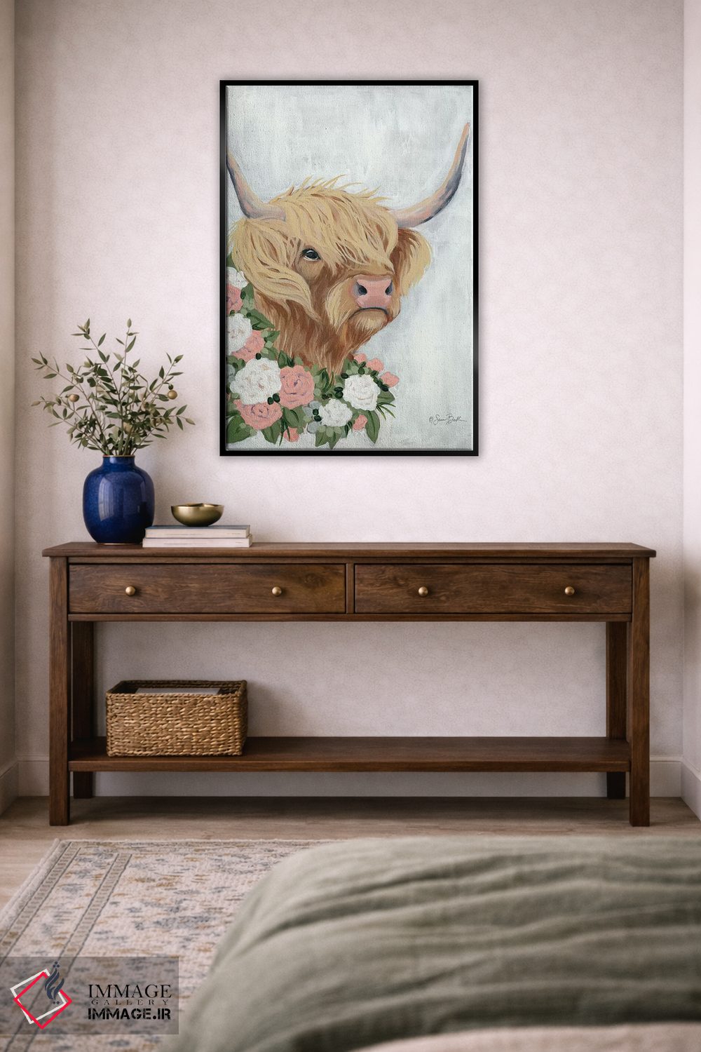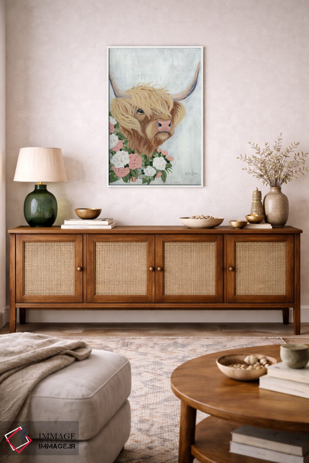 برای دیوارهای ساده، «گاو کوهستانی گلداری» اثرِ «سارا بیکر» گرما و شخصیت به فضا اضافه میکند؛ برای کافههای کوچک و صمیمی انتخابی خوشسلیقه است. در کنار گیاهان و نور طبیعی، جذابتر هم میشود.