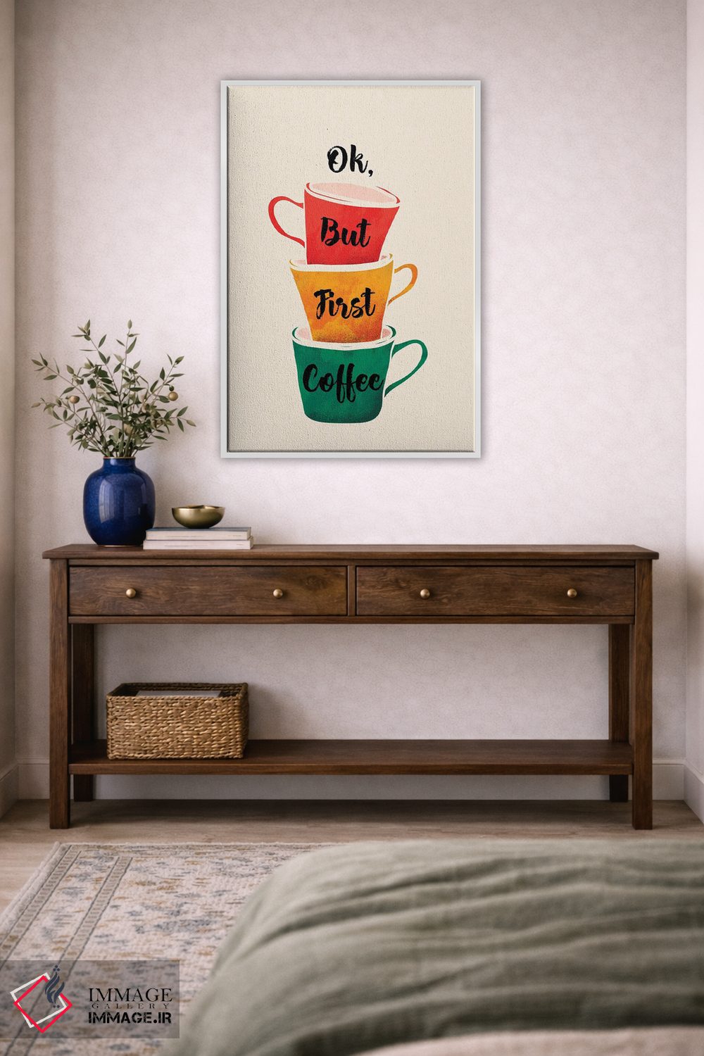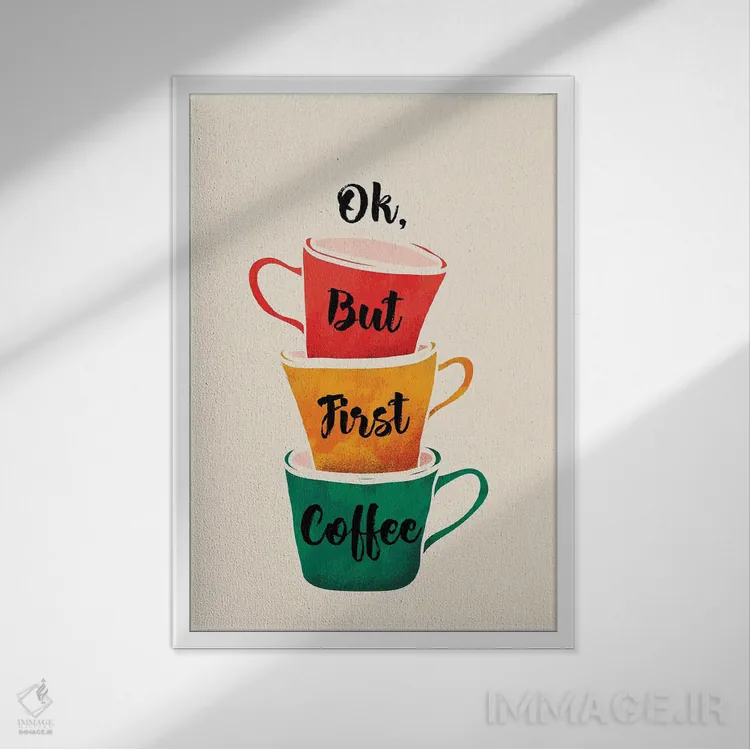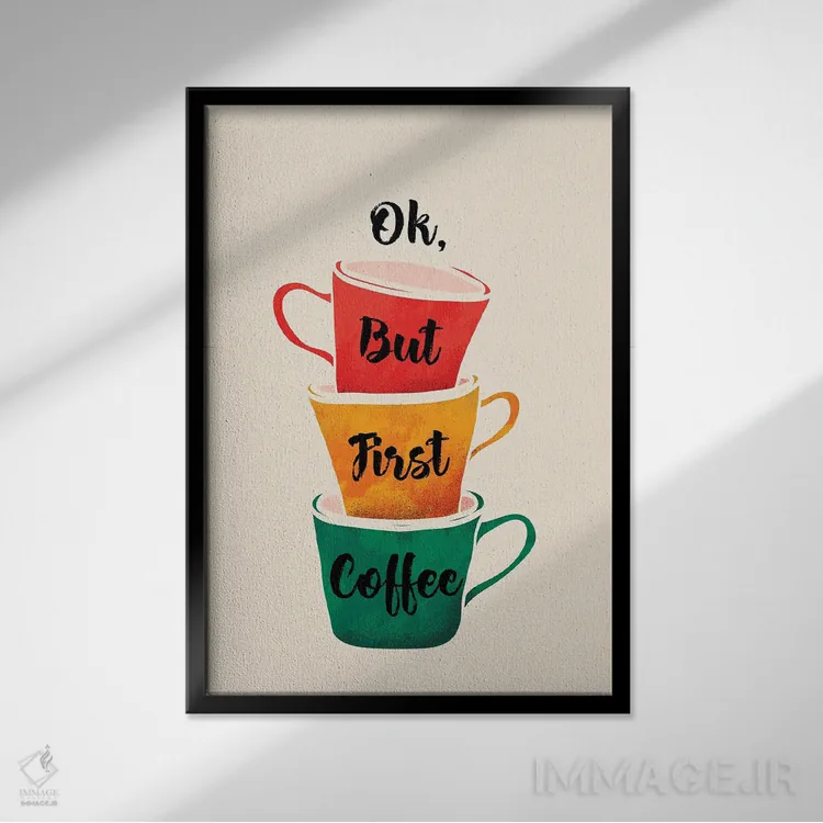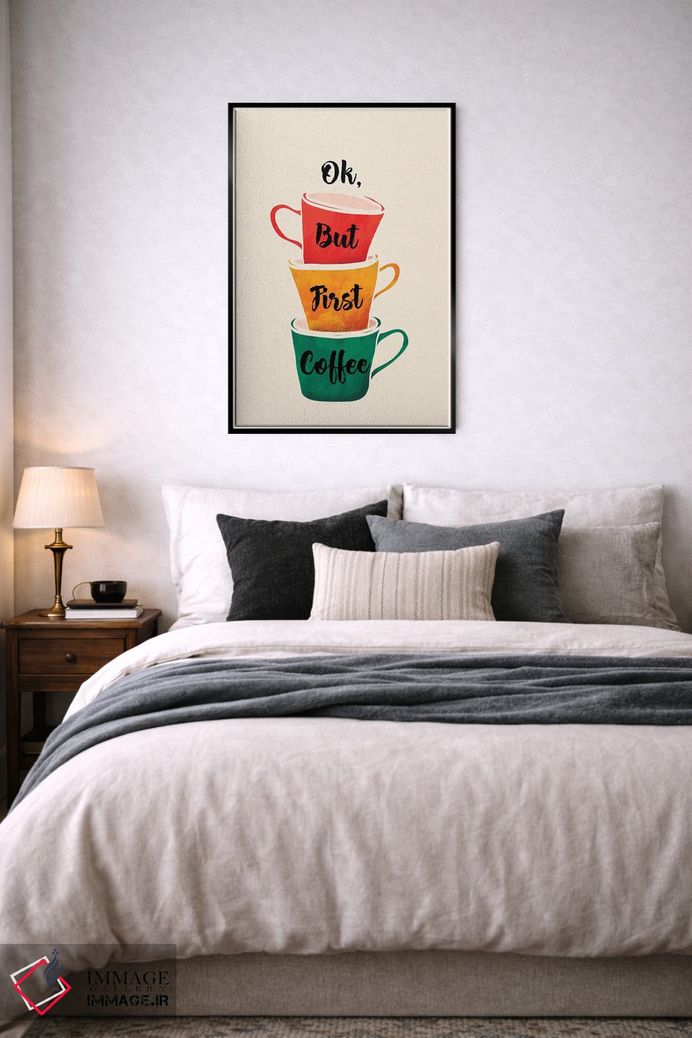 «باشه ولی اول قهوه» اثرِ «شو میمارس (برند هنری)» یک قاب دکوراتیوِ خوشخوان است؛ این اثر در آن بهجای اغراق، با ظرافت و تناسب دیده میشود.