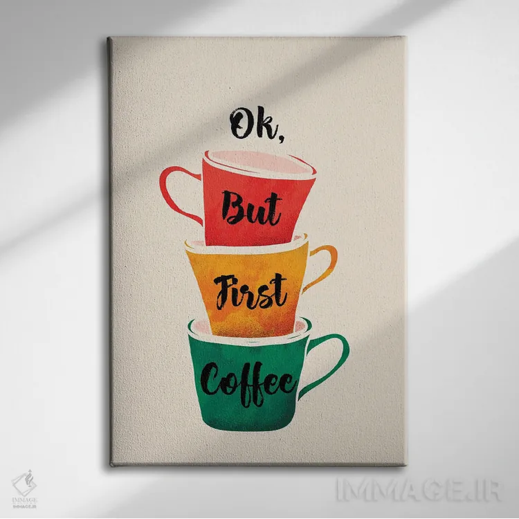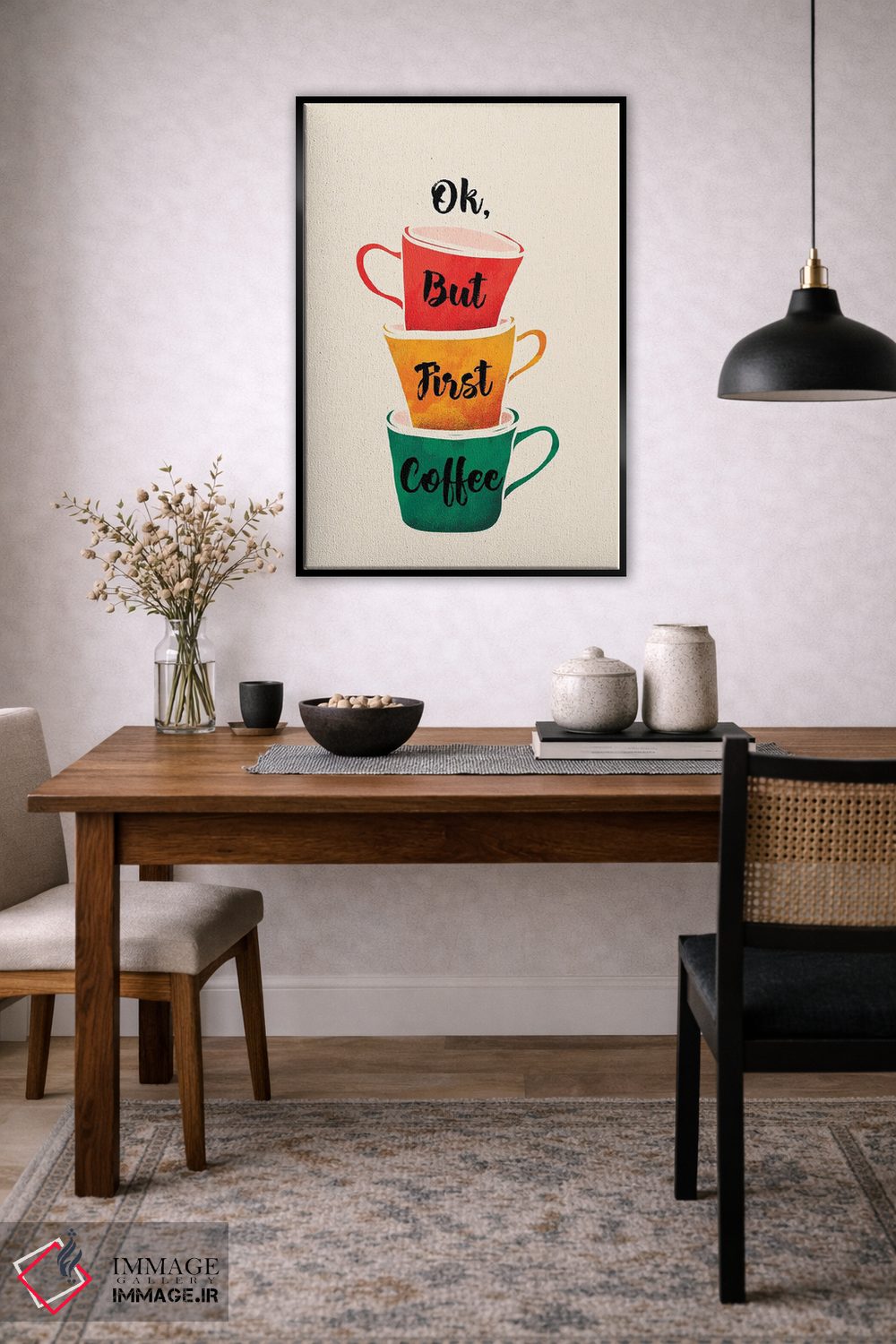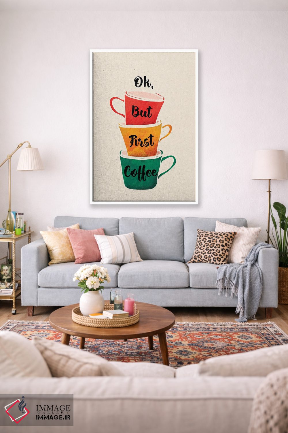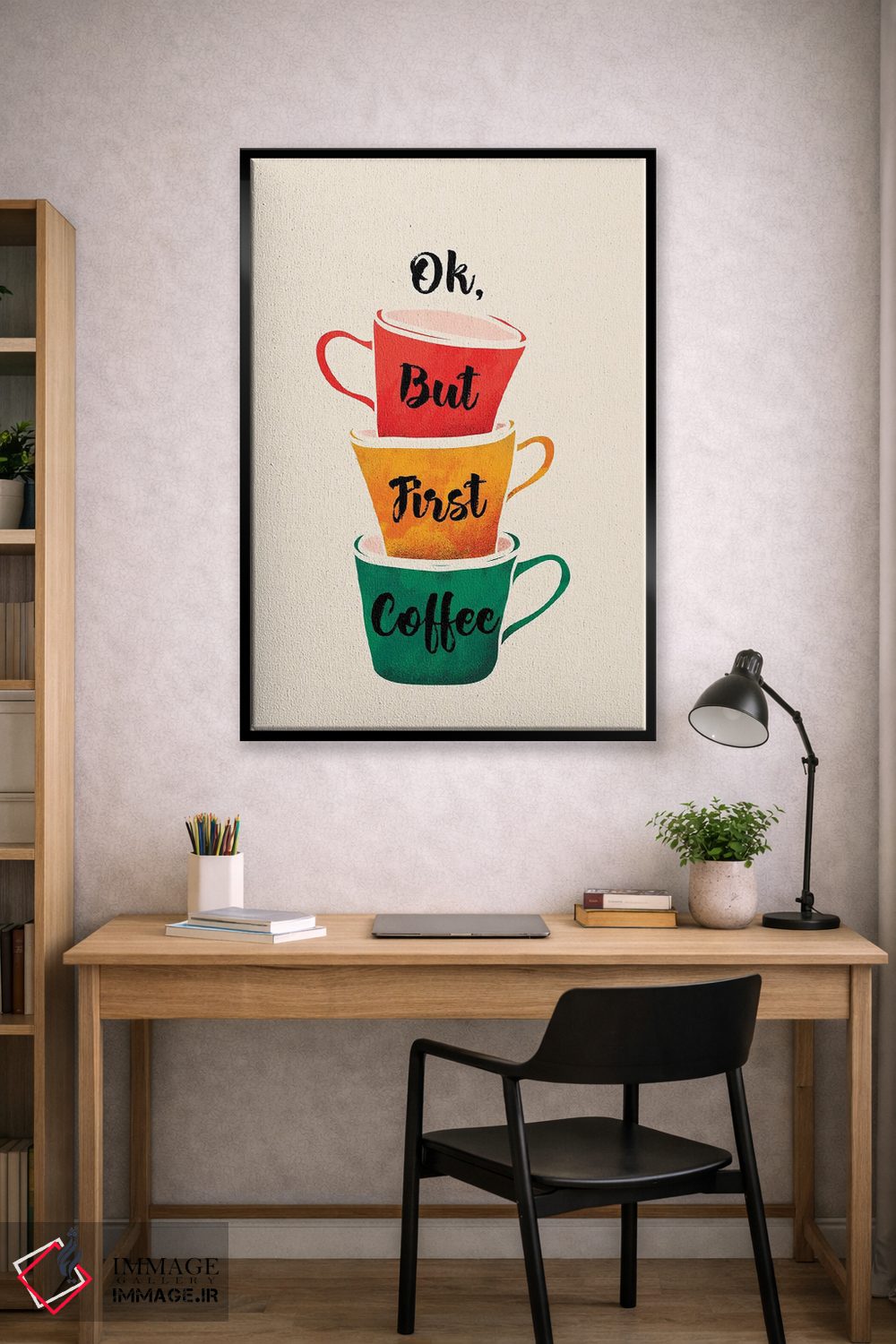 «باشه ولی اول قهوه» اثرِ «شو میمارس (برند هنری)» یک قاب دکوراتیوِ خوشخوان است؛ این اثر در آن بهجای اغراق، با ظرافت و تناسب دیده میشود.