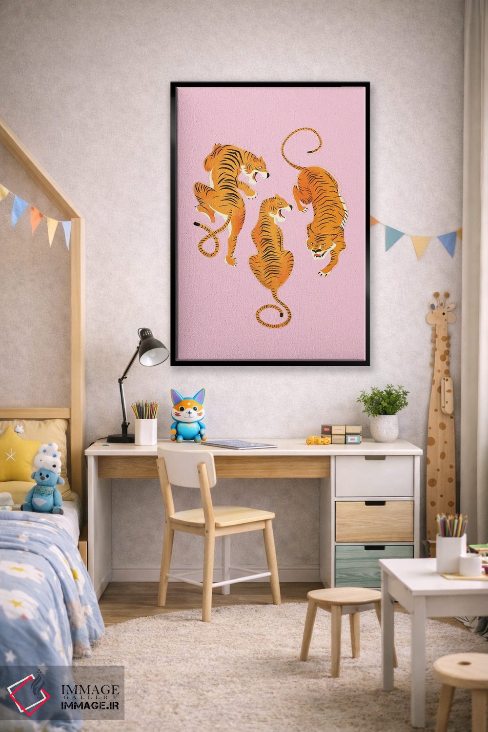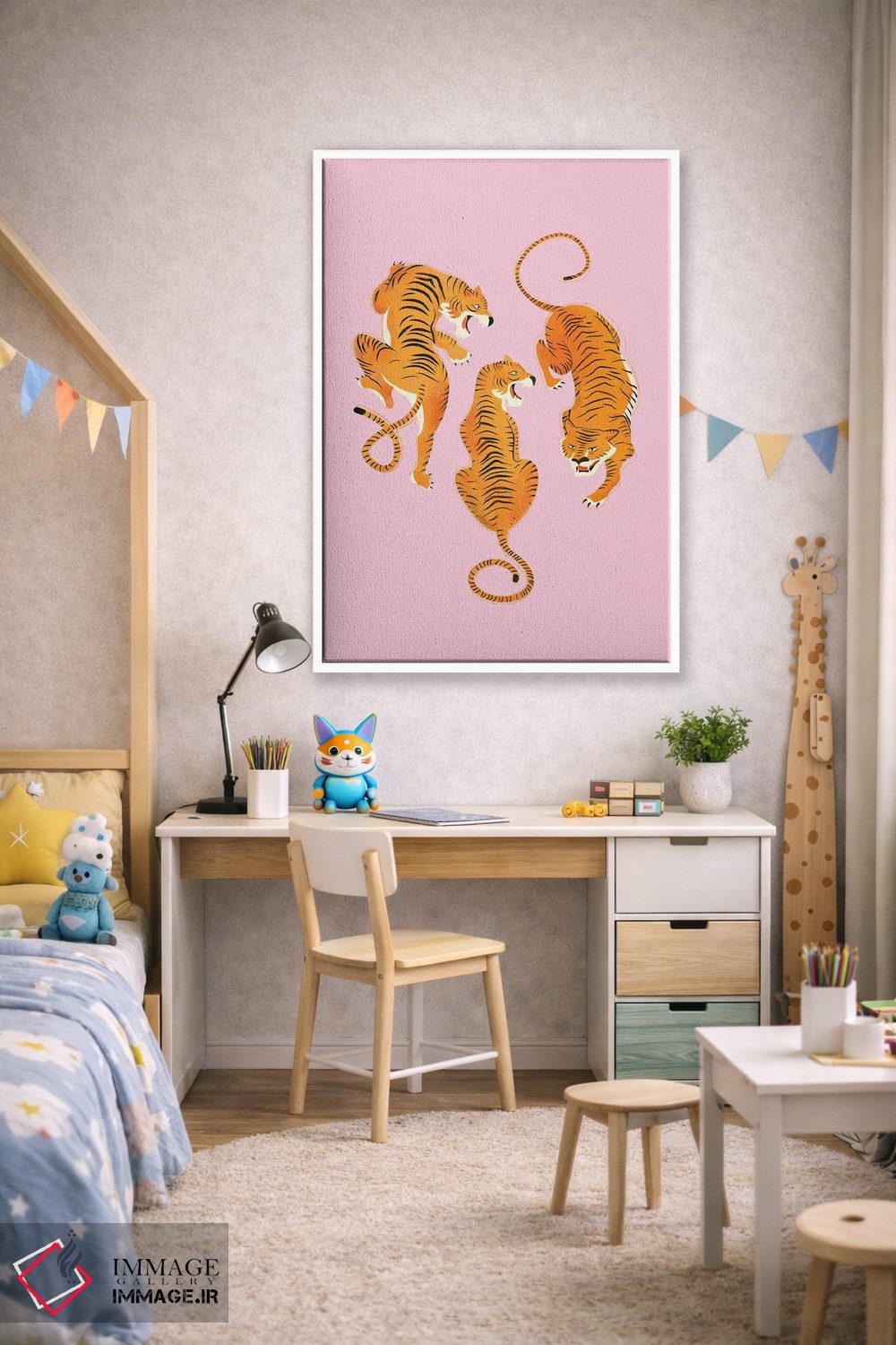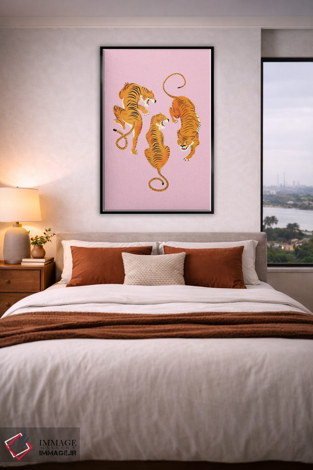 «سه ببر جسور» اثرِ «شو میمارس (برند هنری)» از آن کارهاییست که بافت و جزئیات را طوری نشان میدهد که نگاه میماند؛ برای کافههای کوچک و صمیمی انتخاب خوبیست. با قاب چوبی یا مشکی، حس مرتبتری پیدا میکند.