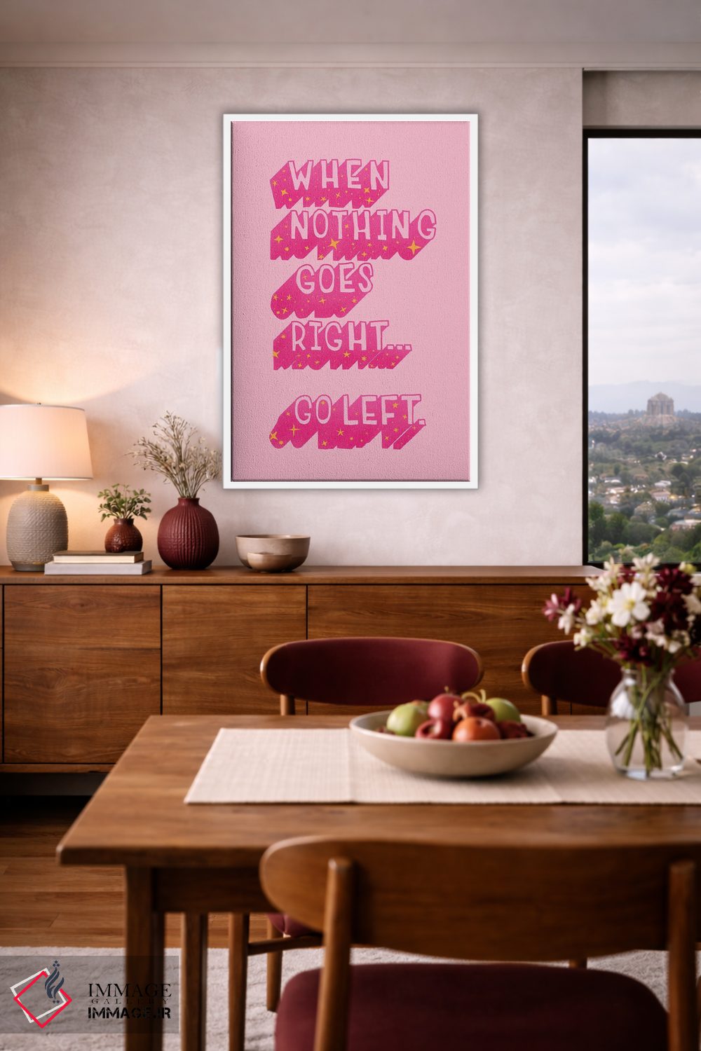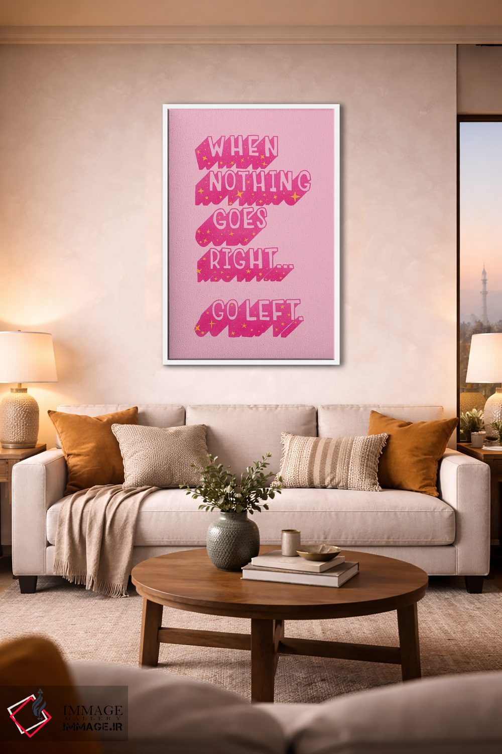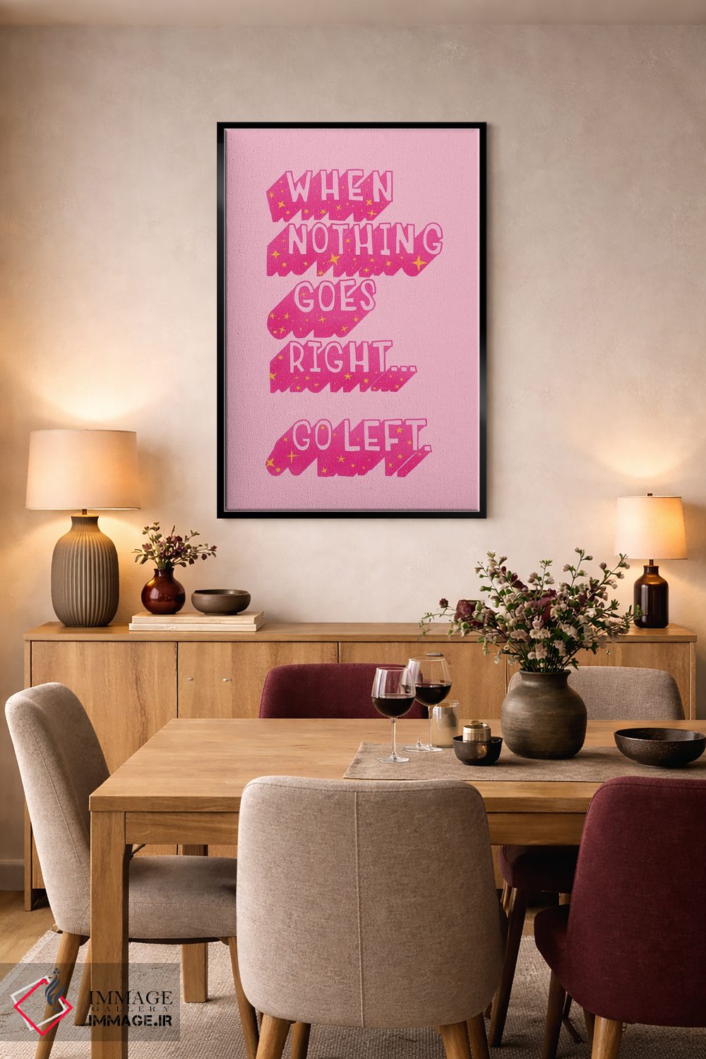 «وقتی هیچ چیز درست پیش نمیرود» اثرِ «شو میمارس (برند هنری)» با موضوعِ این اثر، به چیدمان رنگی فضا کمک میکند و حس پرداختِ هنری را هم حفظ میکند.