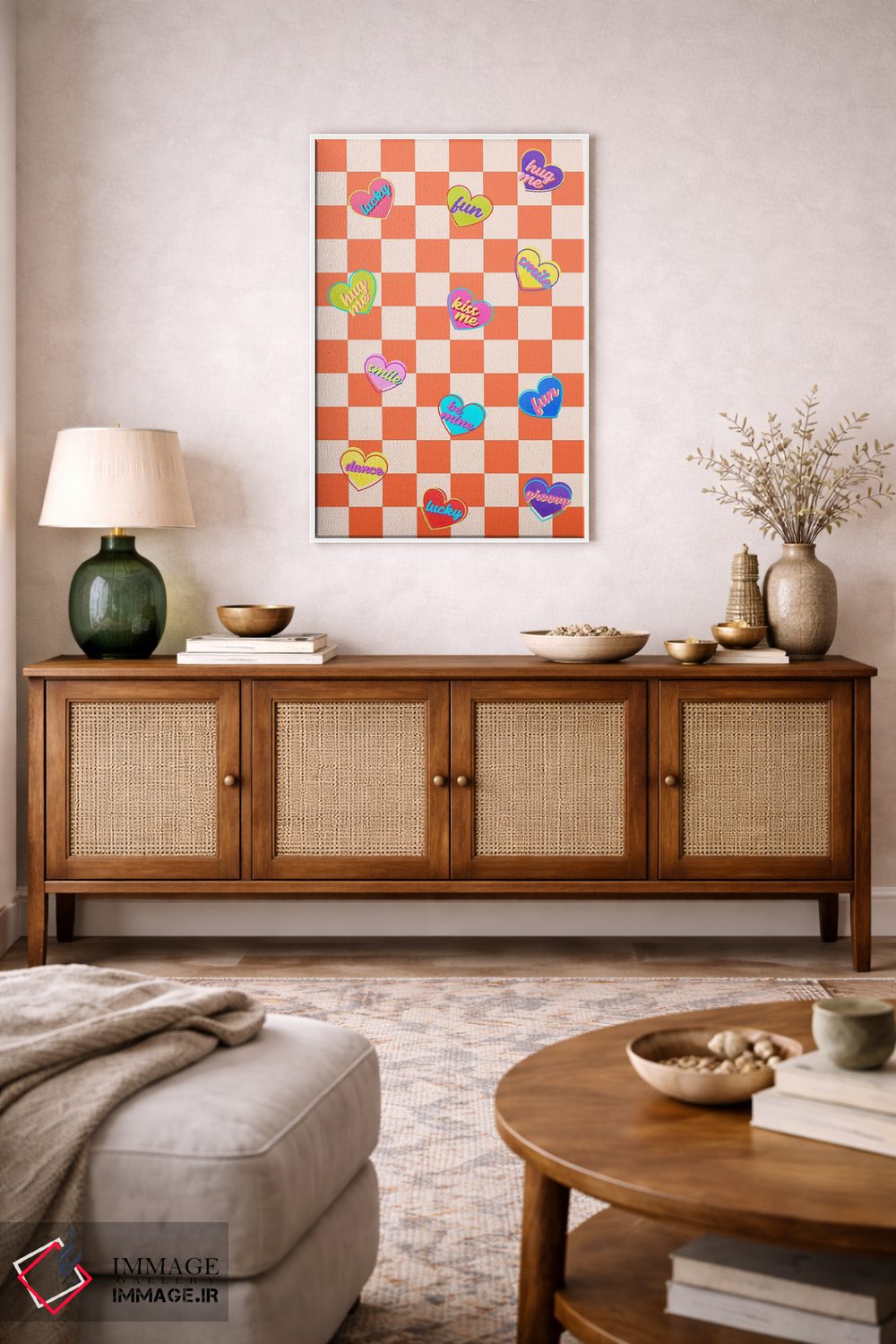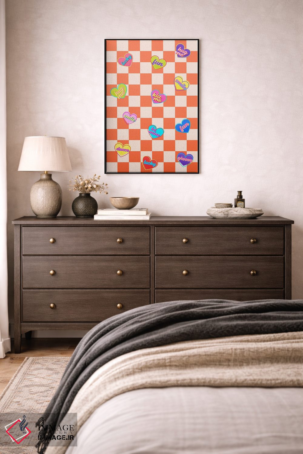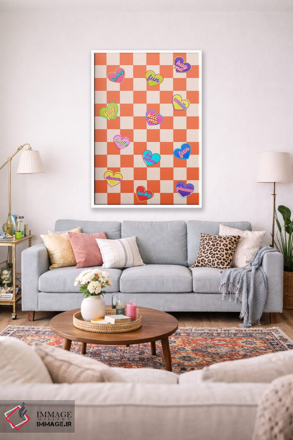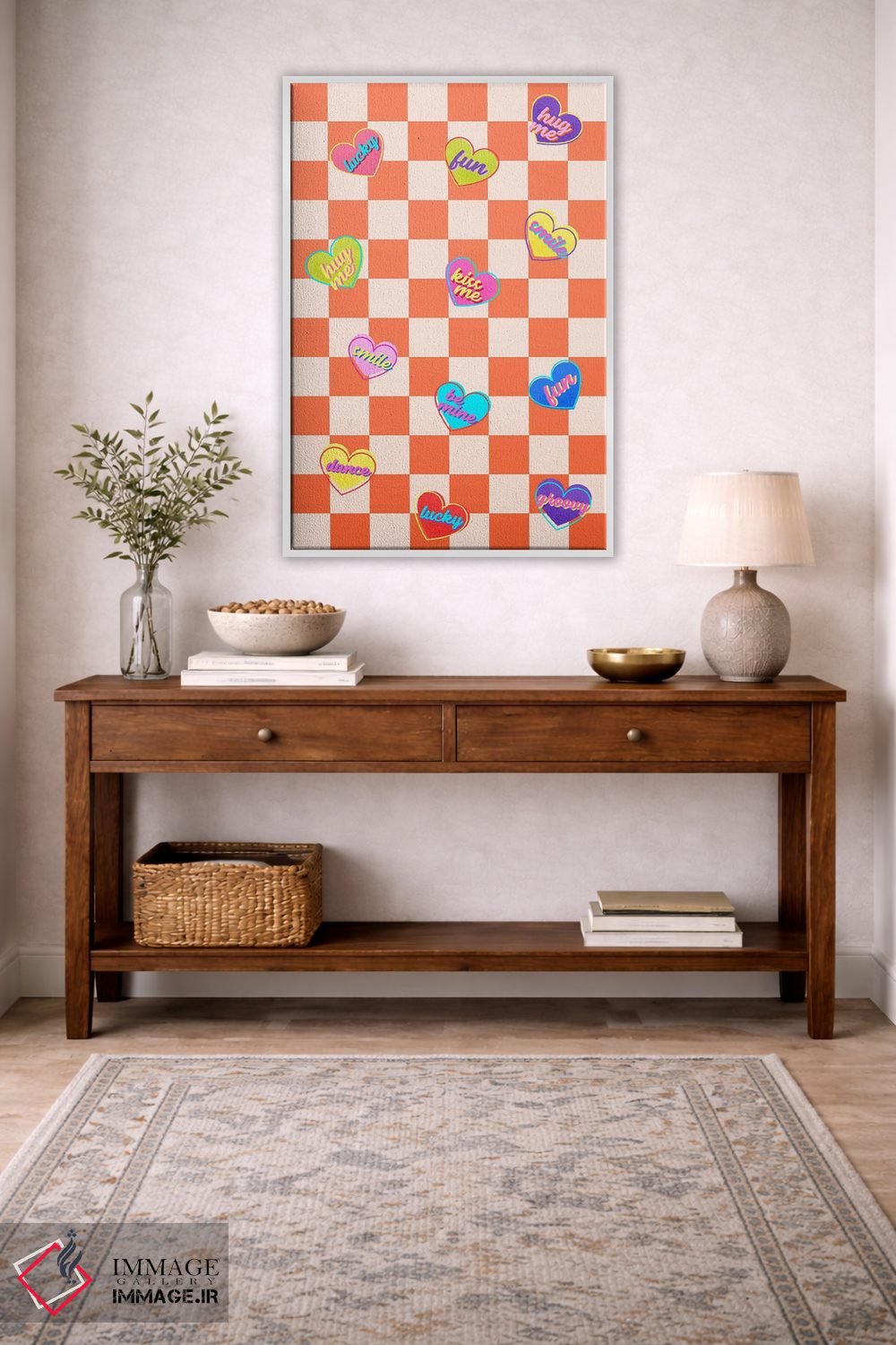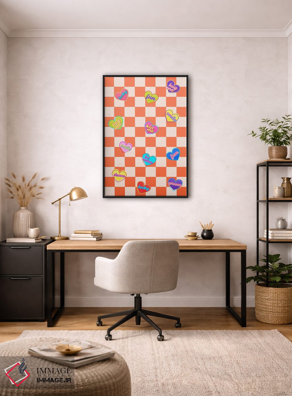 این اثر با حس این اثر و پرداختِ هنری، برای دکورهای روشن و مینیمال عالی جواب میدهد: «آبنباتهای قلبی روی شطرنجی نارنجی» اثرِ «شو میمارس (برند هنری)».