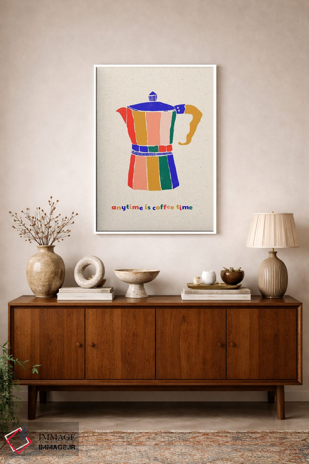 براساس پالت ترکیبی اثر، قاب تیک گرم (چوبی) پیشنهاد اول است و مشکی مات (فریم متوسط) مکمل. برای سفارشهای پروژهای با ابعاد و قابهای اختصاصی با ایماژ در تماس باشید.