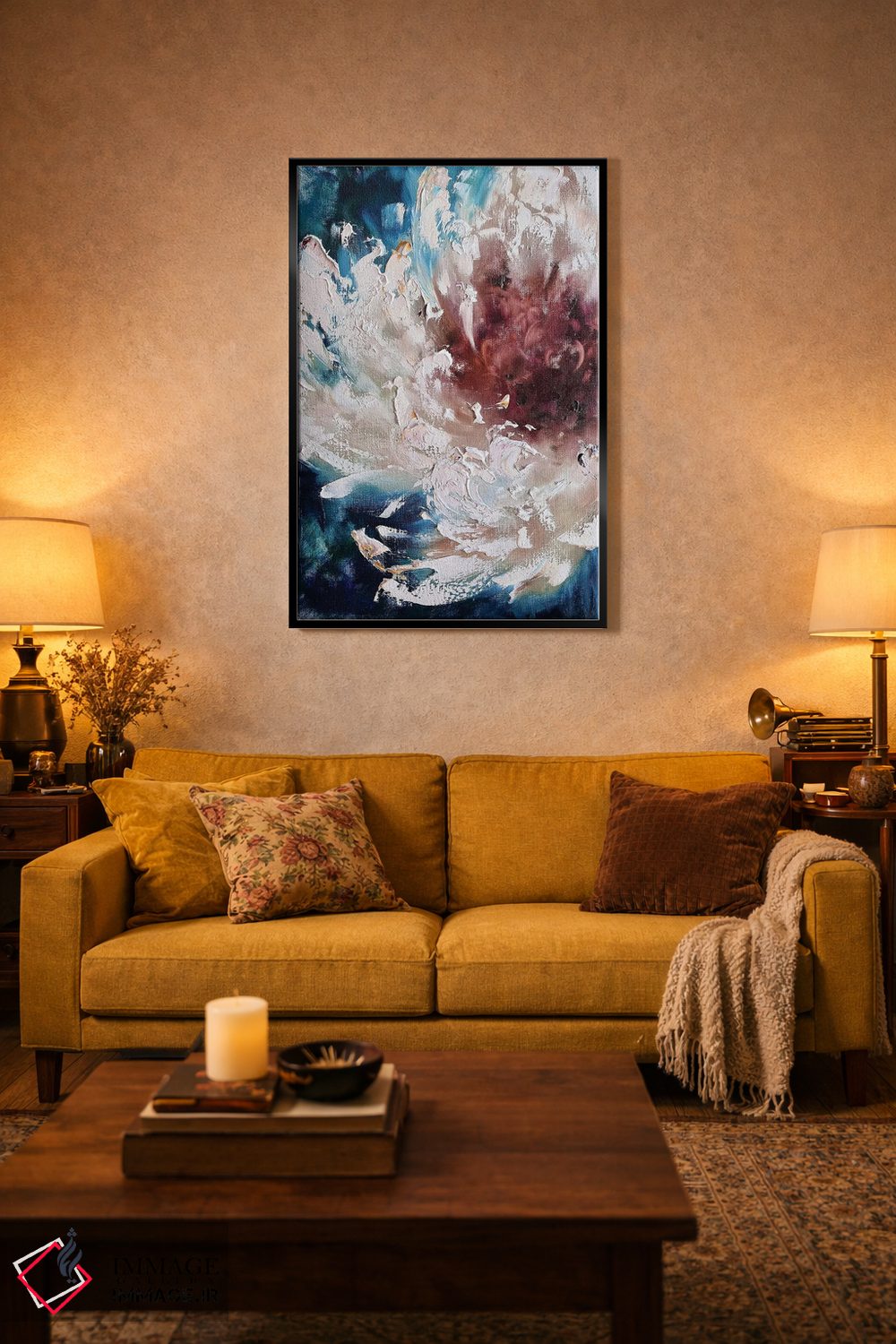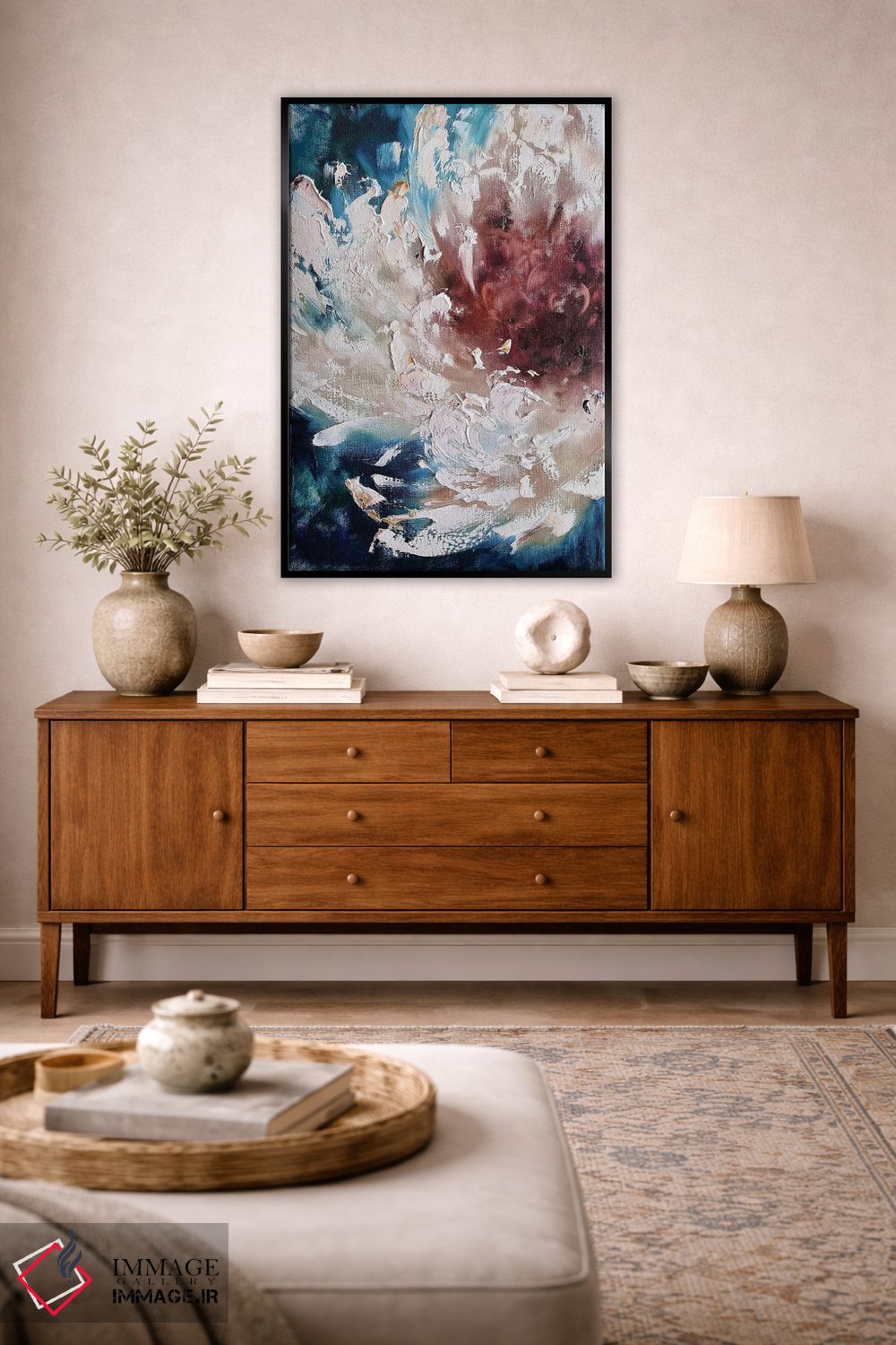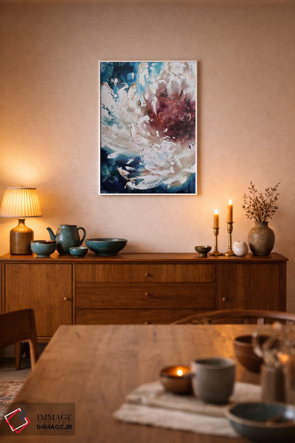 براساس پالت ترکیبی اثر، قاب تیک گرم (چوبی) پیشنهاد اول است و مشکی مات (فریم متوسط) مکمل. برای سفارشهای پروژهای با ابعاد و قابهای اختصاصی با ایماژ در تماس باشید.