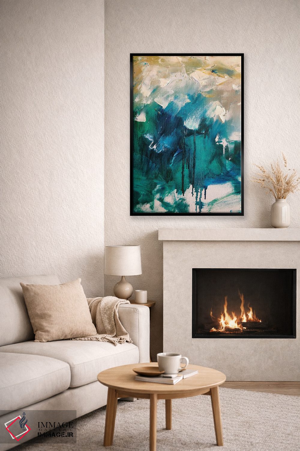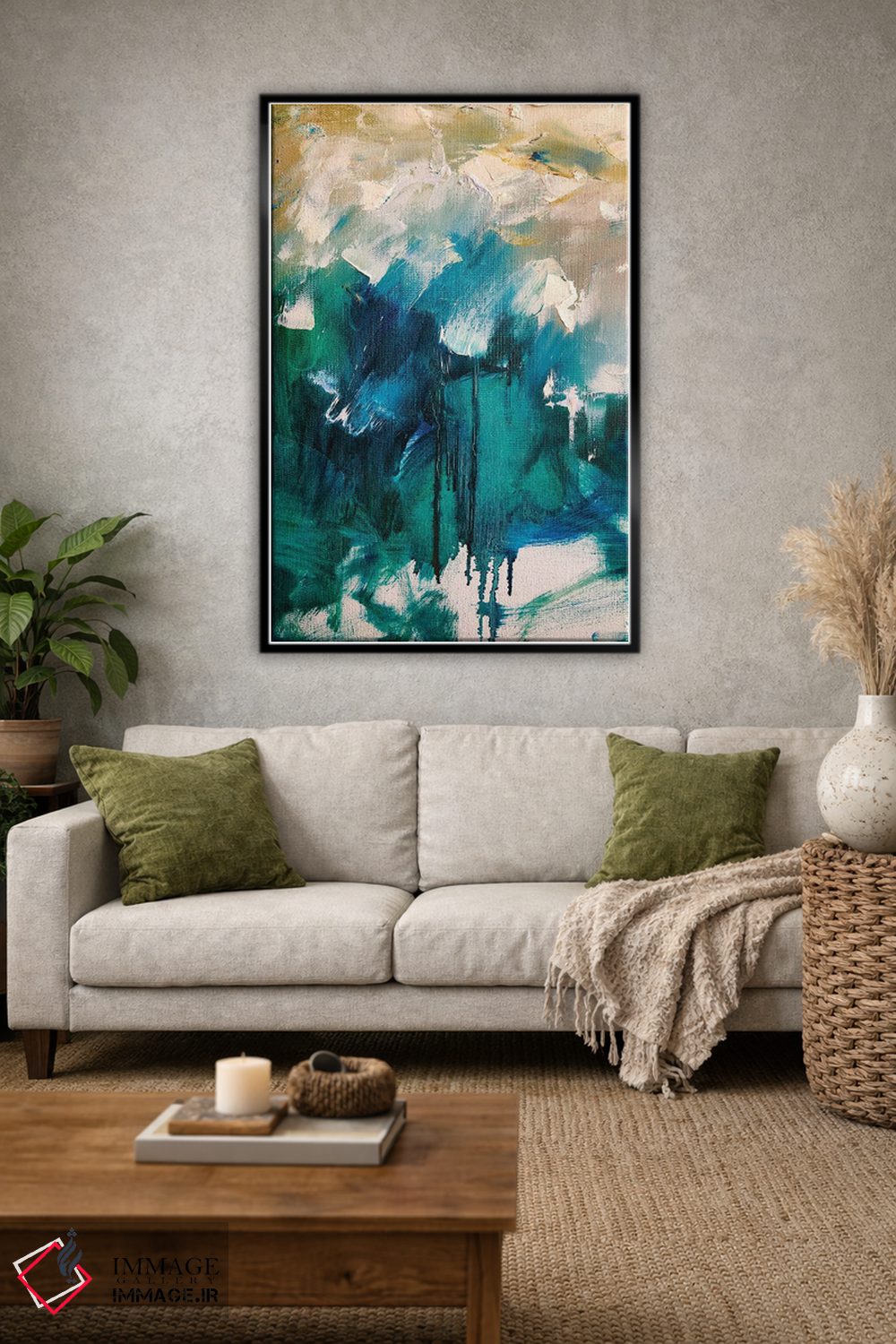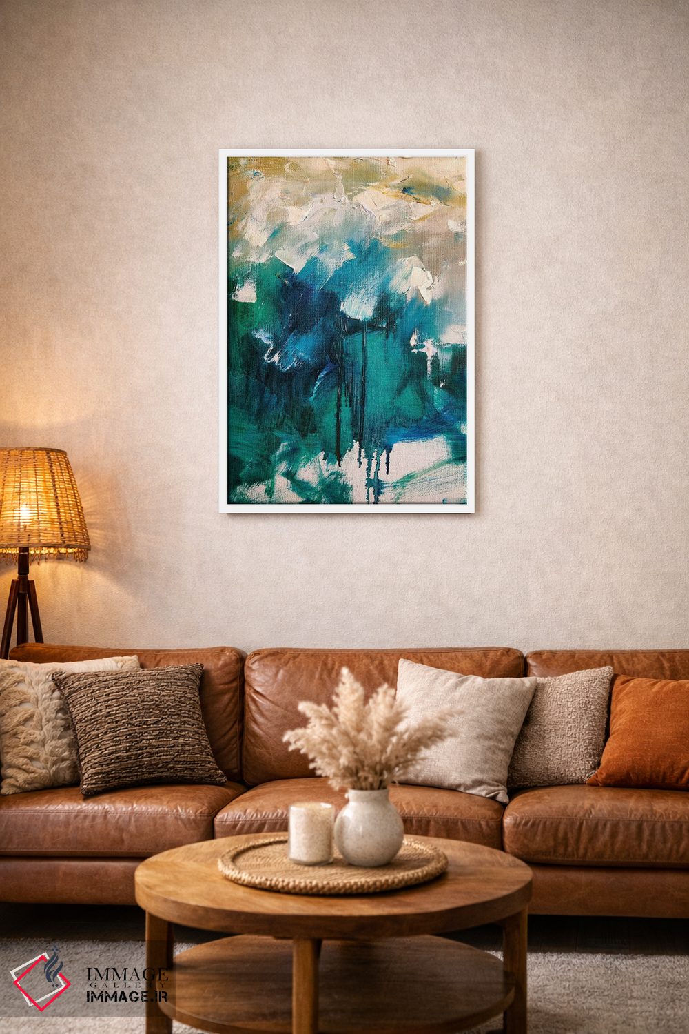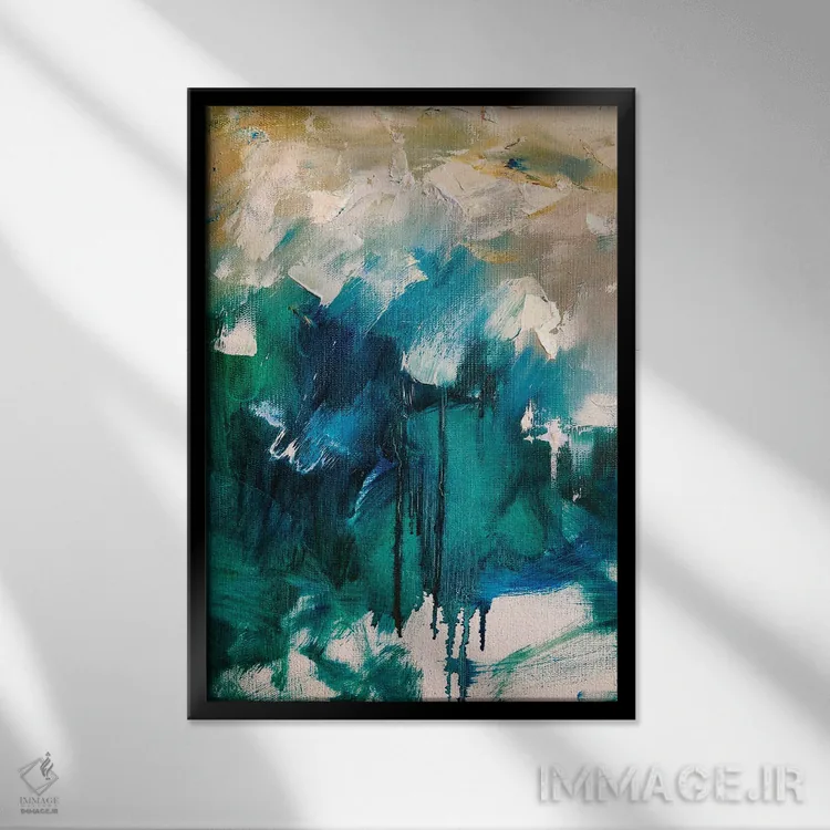 براساس پالت ترکیبی اثر، قاب بلوط روشن (چوبی) پیشنهاد اول است و استخوانی ملایم مکمل. برای سفارشهای پروژهای با ابعاد و قابهای اختصاصی با ایماژ در تماس باشید.