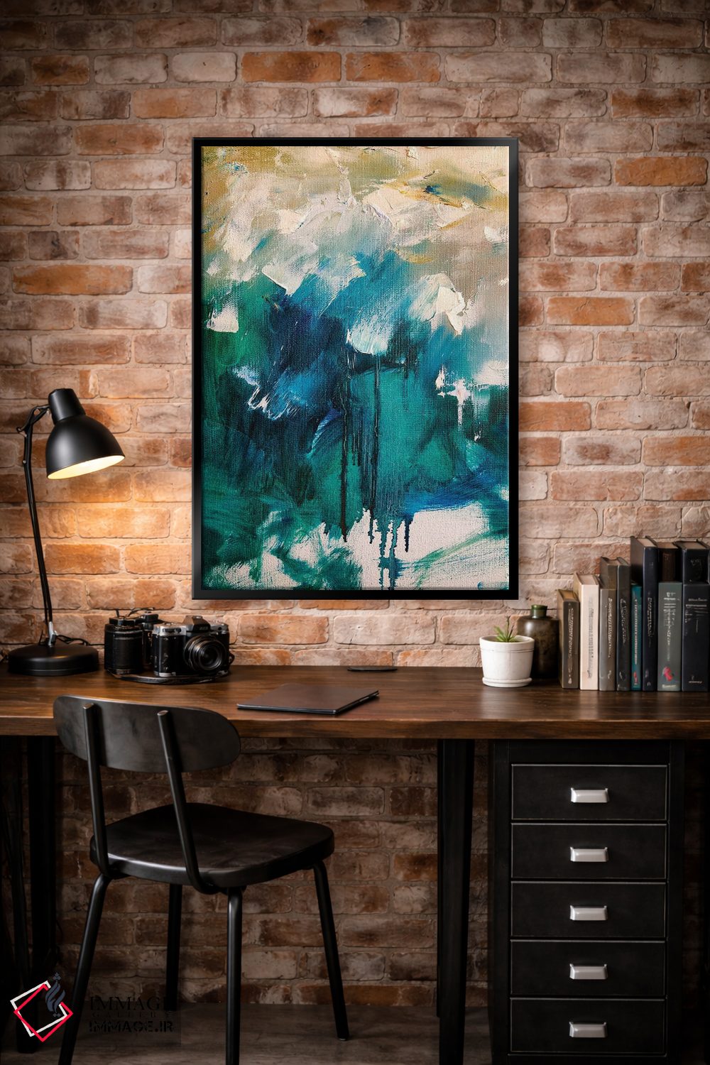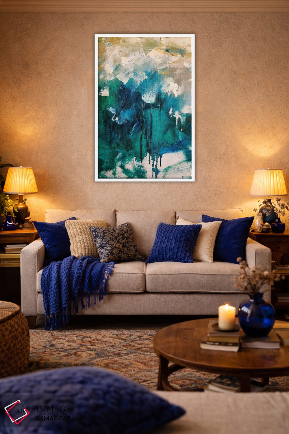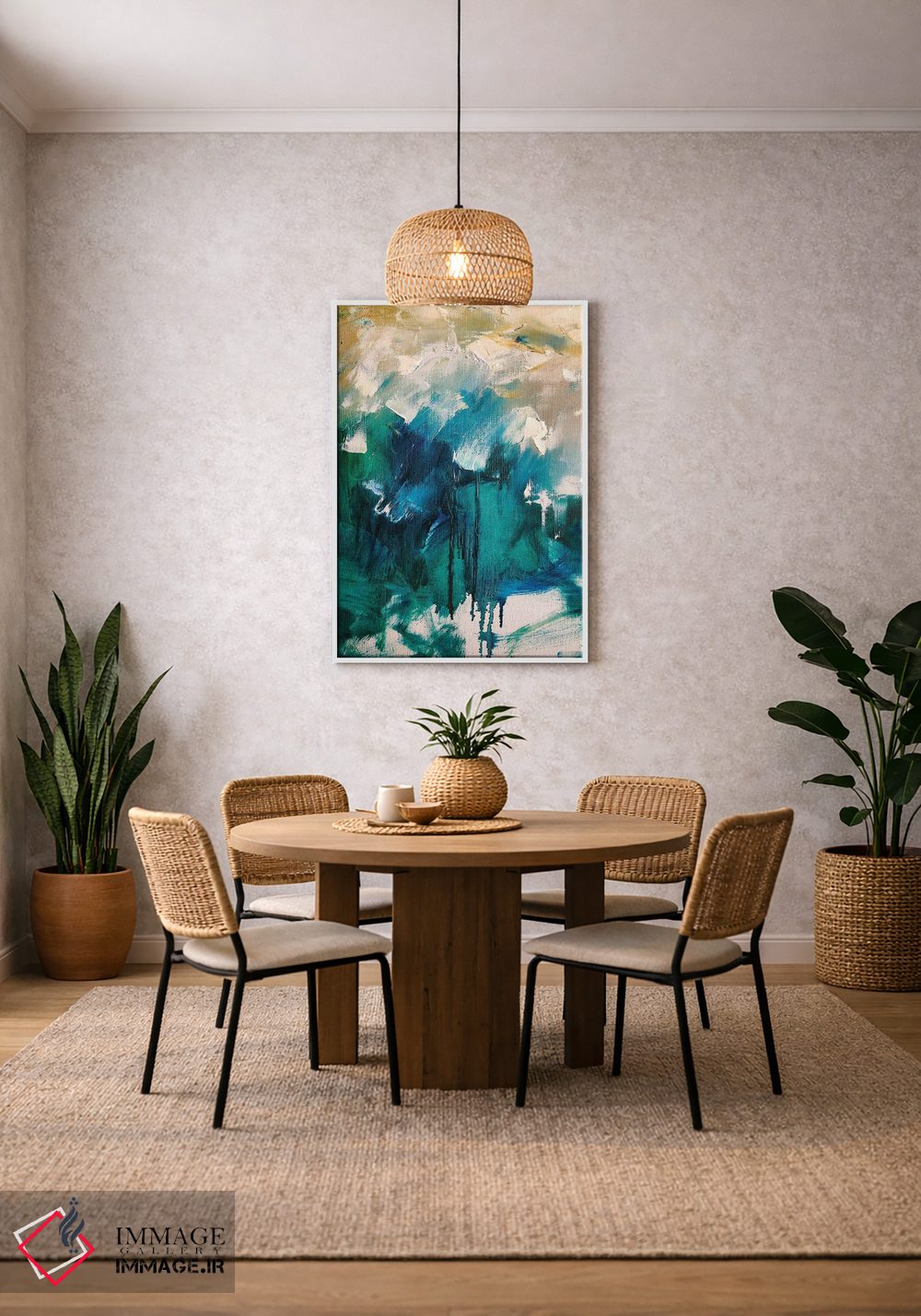 براساس پالت ترکیبی اثر، قاب بلوط روشن (چوبی) پیشنهاد اول است و استخوانی ملایم مکمل. برای سفارشهای پروژهای با ابعاد و قابهای اختصاصی با ایماژ در تماس باشید.