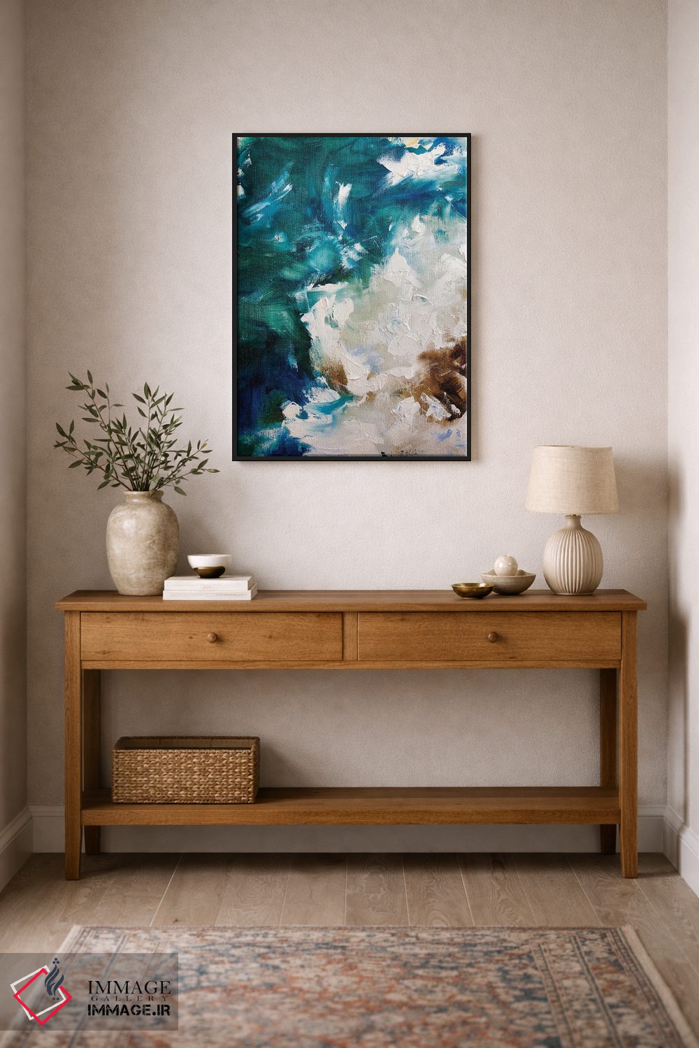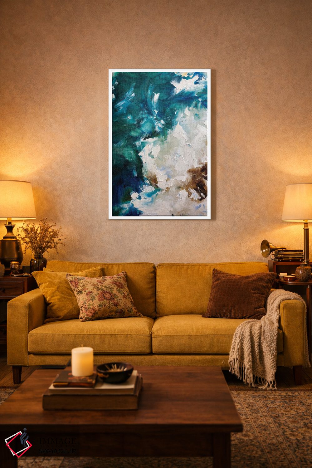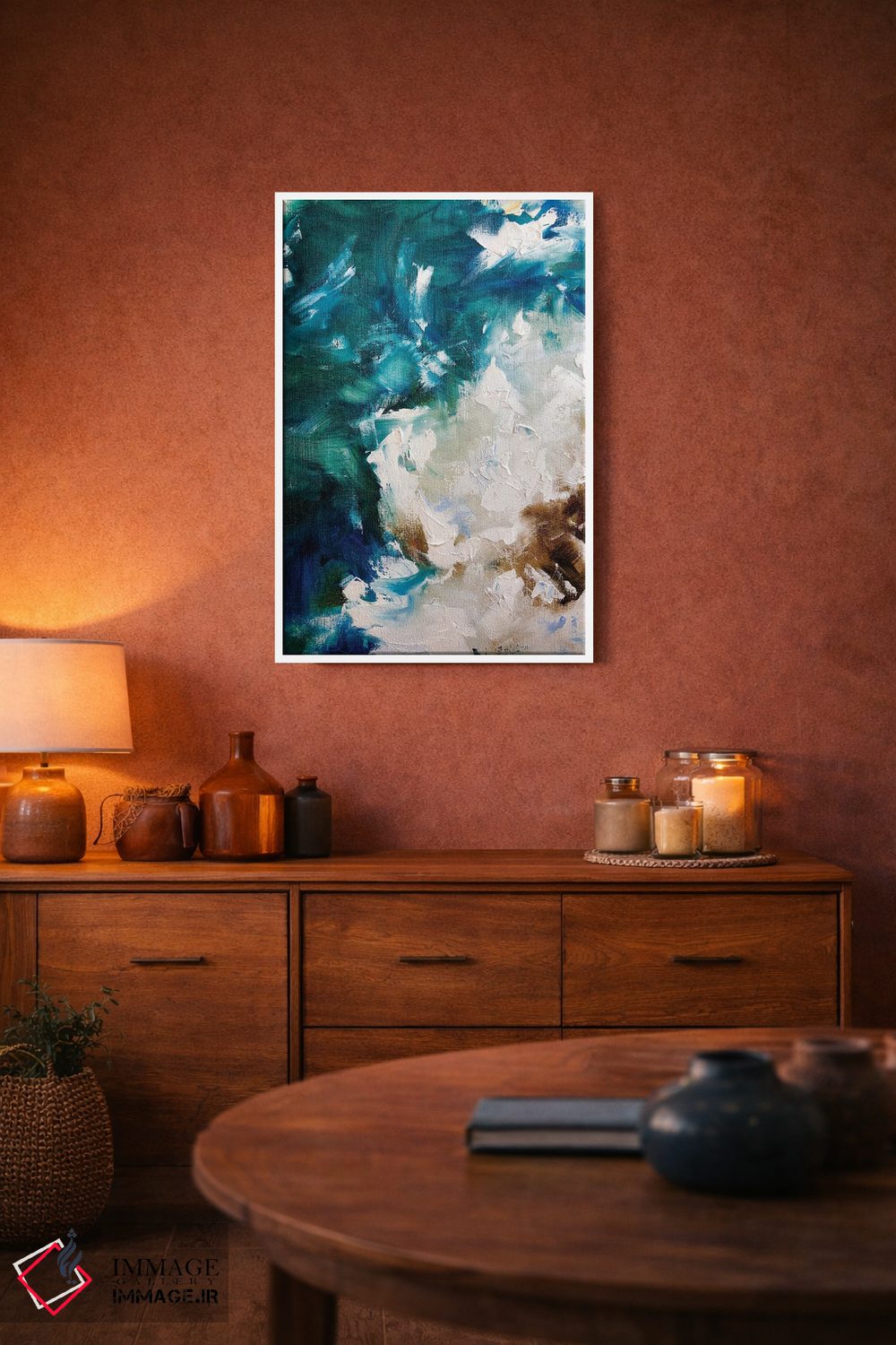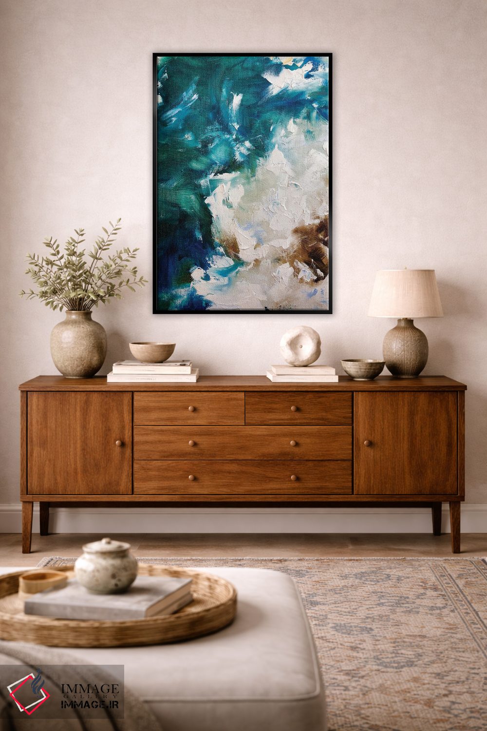 اگر فضا مینیمال است، فیروزهای را در کوسن یا پاف برگردانید تا رنگها در فضا نفس بکشند. انتخاب قاب هم میتواند این اکسنت را تقویت کند.