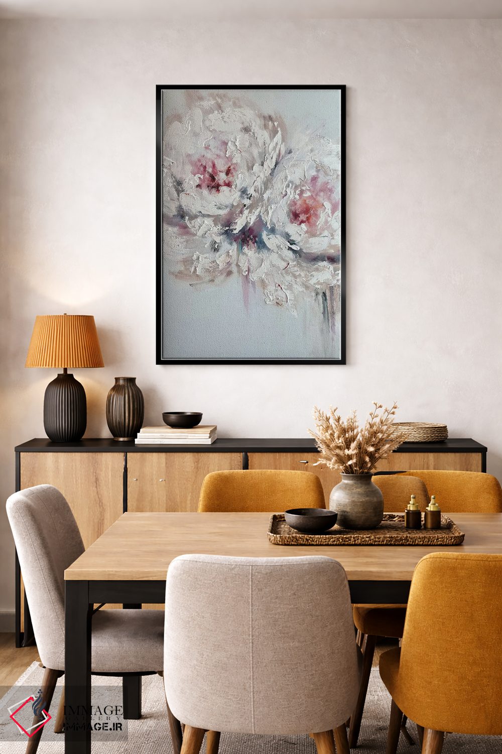 براساس پالت گرم اثر، قاب تیک گرم (چوبی) پیشنهاد اول است و مشکی مات (فریم متوسط) مکمل. برای سفارشهای پروژهای با ابعاد و قابهای اختصاصی با ایماژ در تماس باشید.
