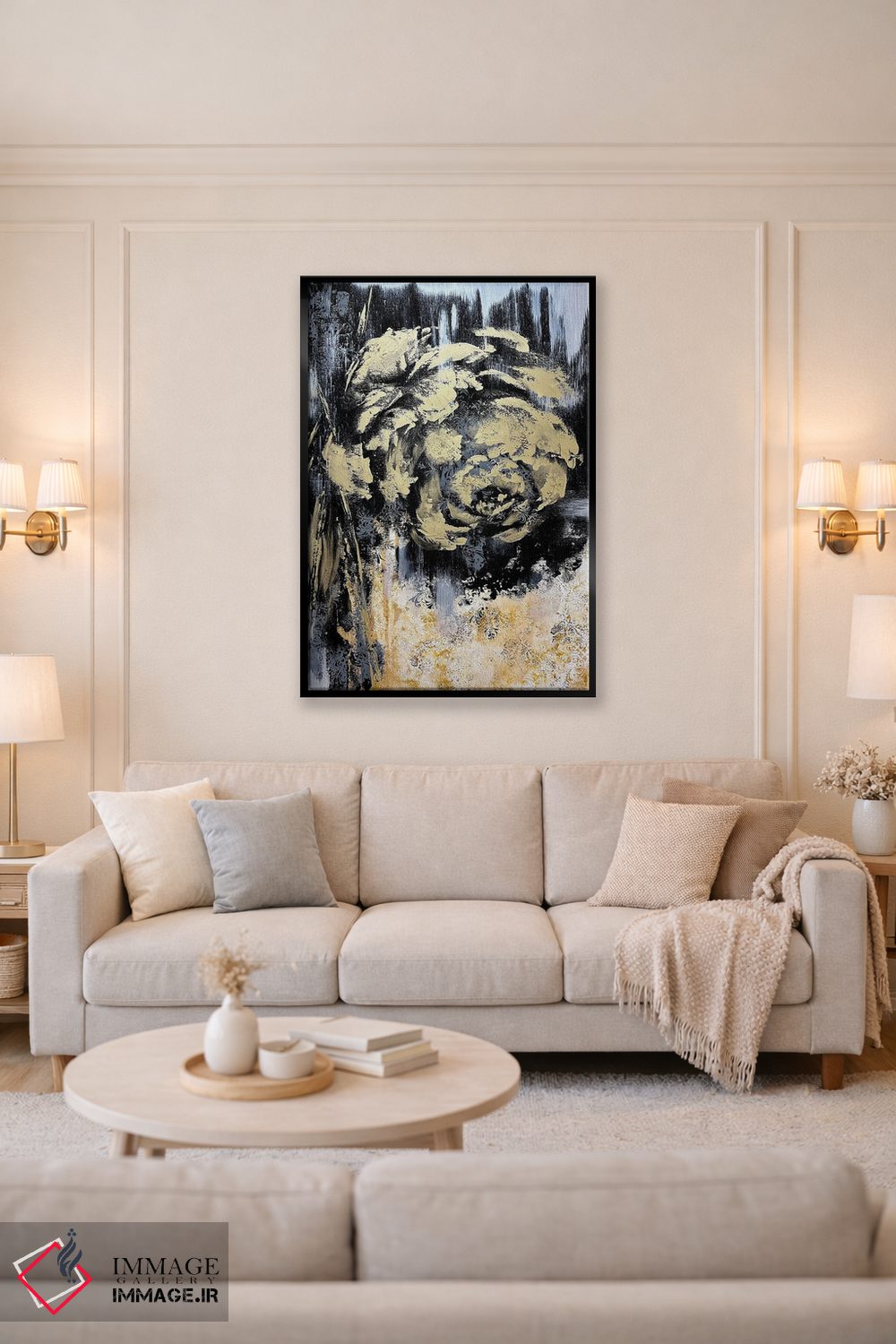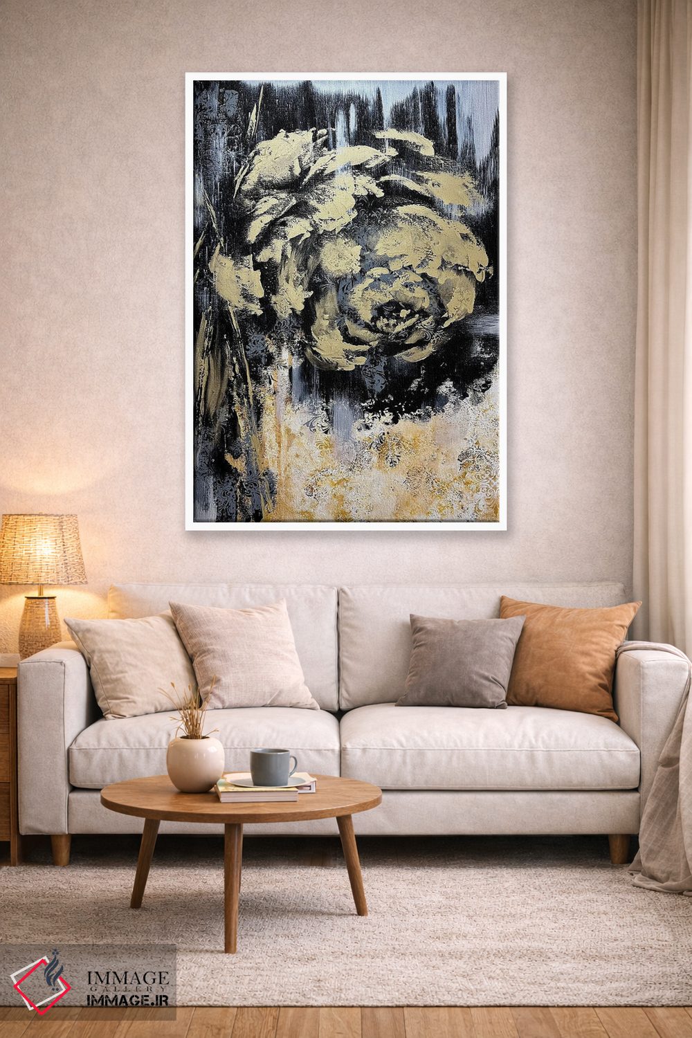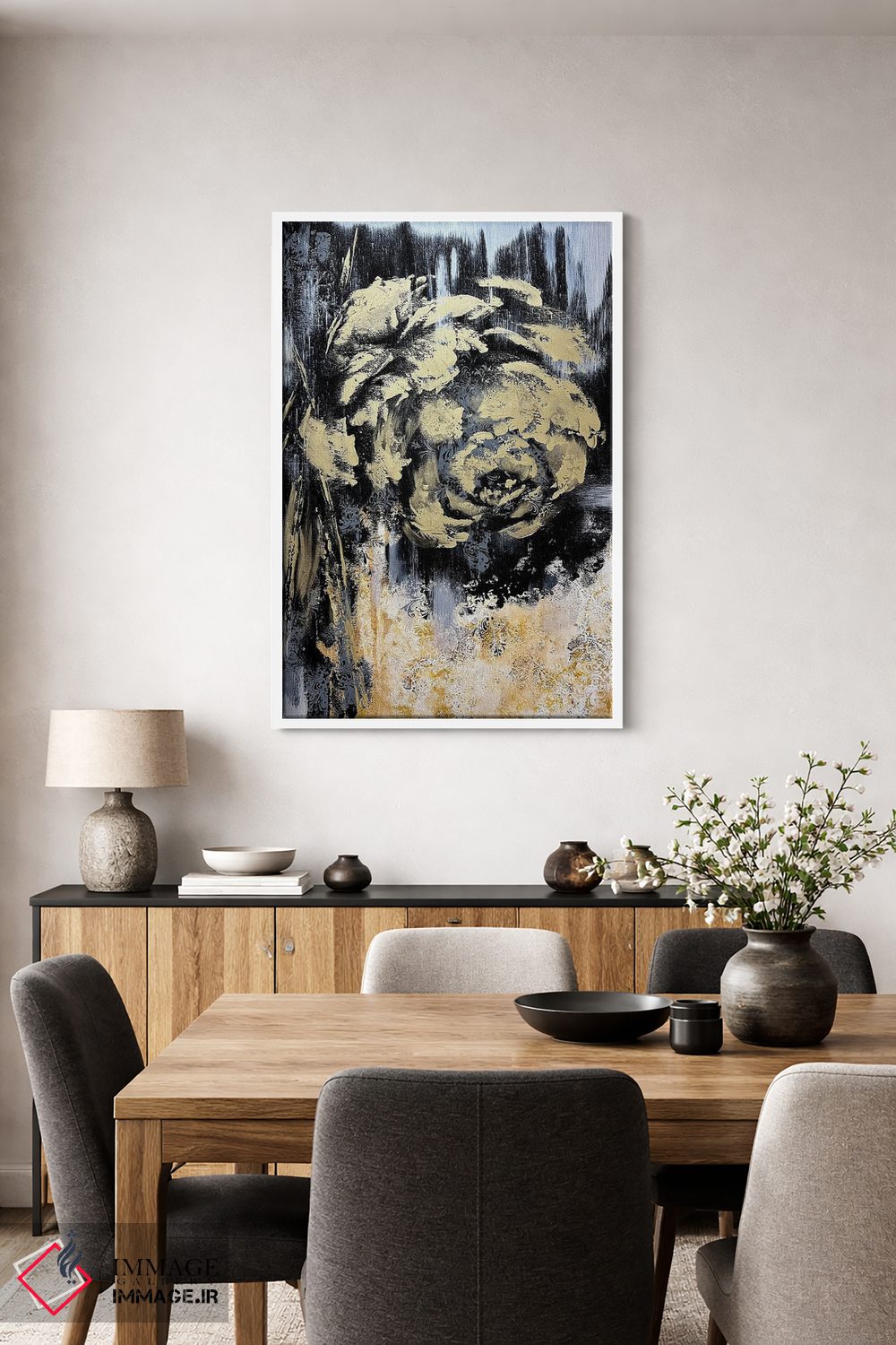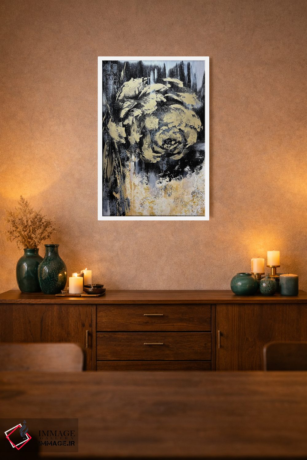 تابلو انتزاعی گل های طلایی شگفت انگیز اثر مارینا اسکرمووا - نمای روبه‌رو روی دیوار