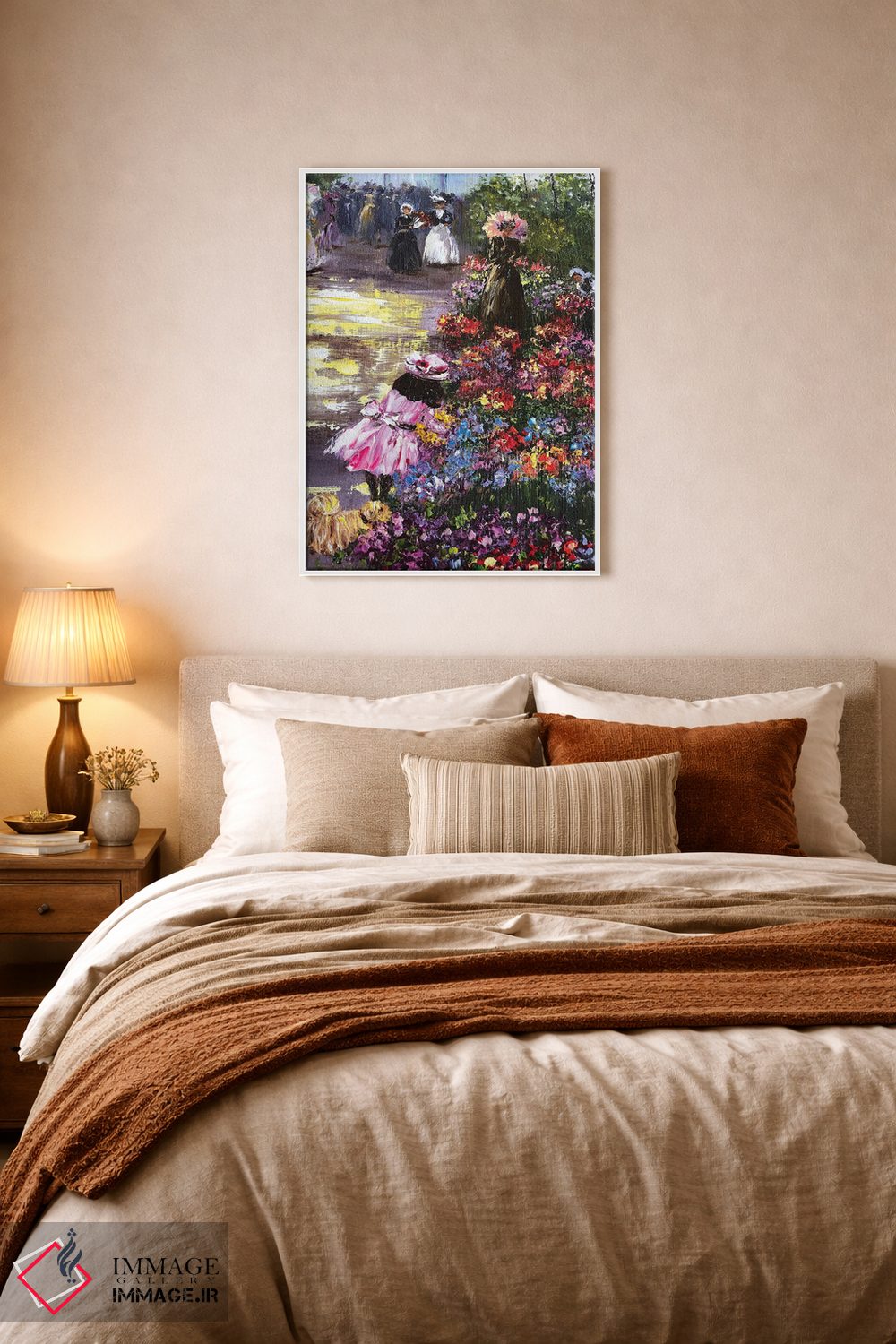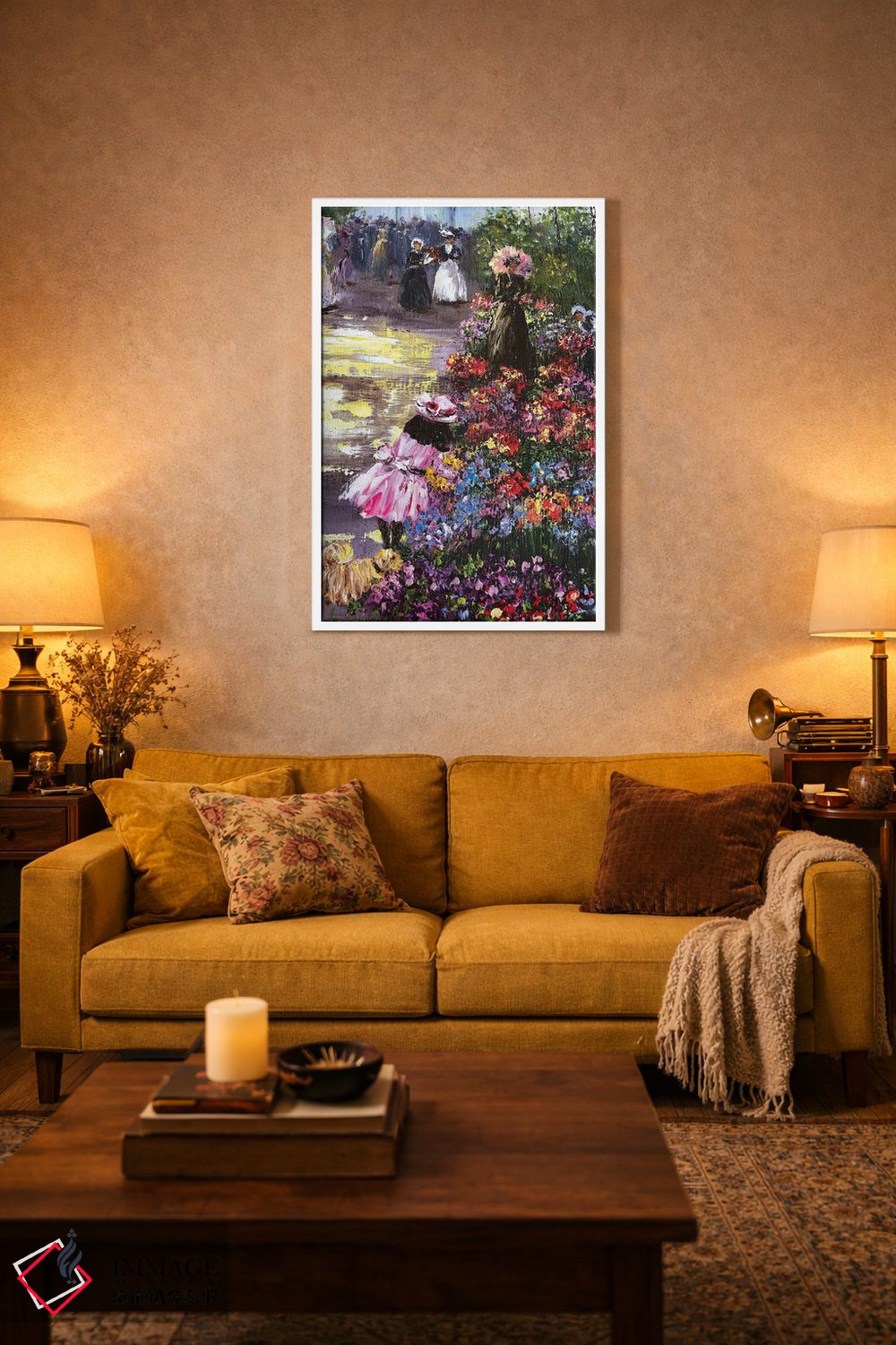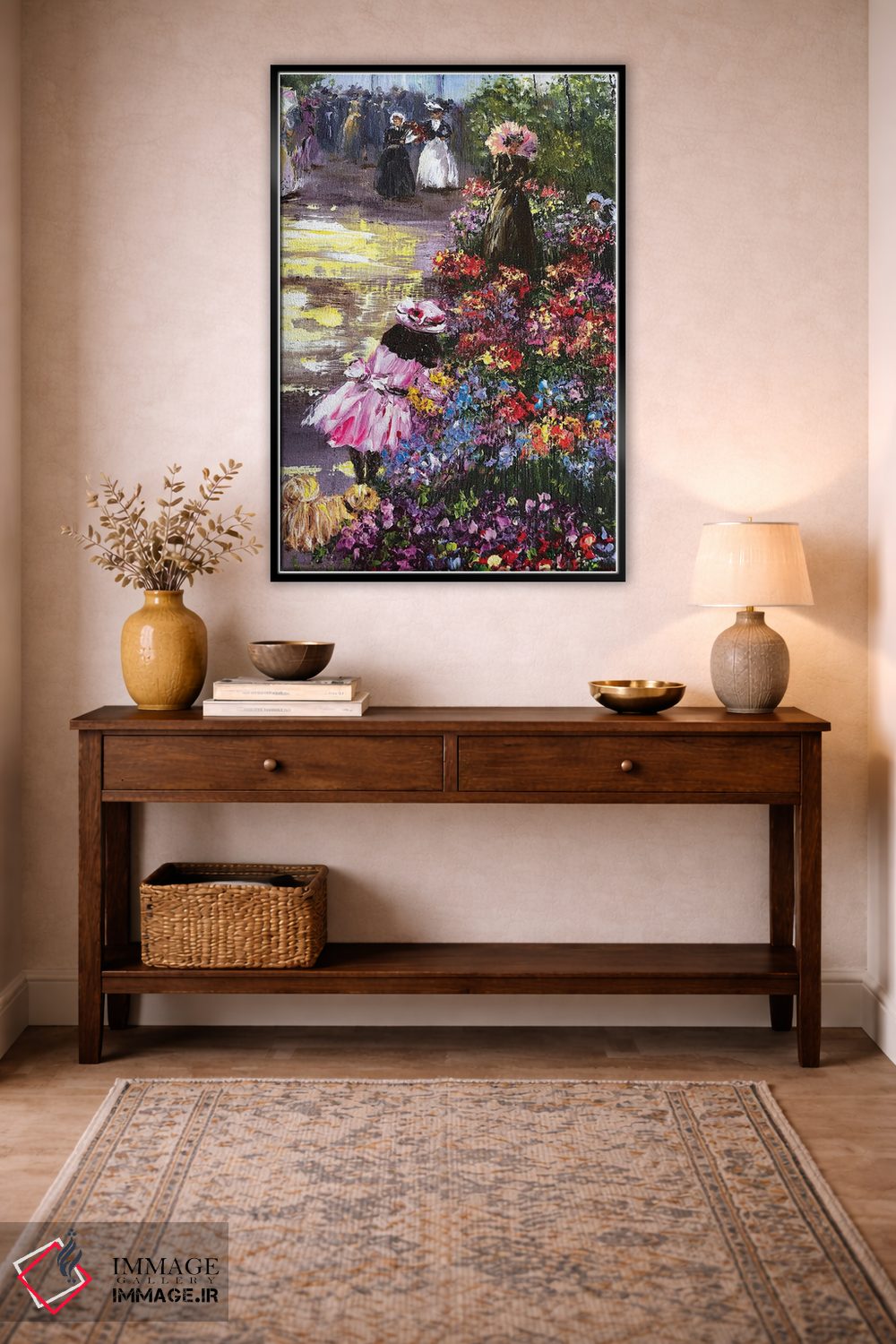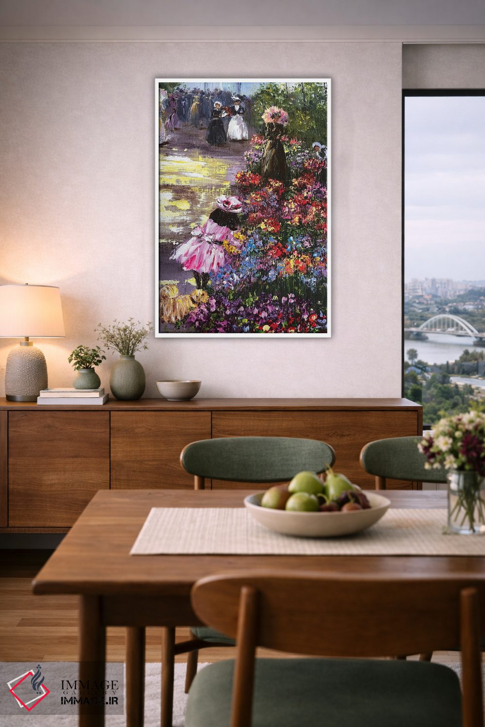 طراحی بوم گالری ایماژ بهگونهای است که اثر روی دیوار «پرداختشده» و حرفهای دیده شود—نه پرزرقوبرقِ بیپایه؛ بلکه دقیق و خوشپرداخت. بافت ظریف کنواس کمک میکند حس اثر هنری را در نگاه نزدیک نگه میدارد. کنترل تونها باعث میشود از تند شدن ناخواستهی رنگها جلوگیری میکند بهخصوص وقتی نور موضعی ملایم داشته باشید. حاصل کار، یک تابلو خوشنشین است که هم از دور اثرگذار است و هم از نزدیک خوشخوان؛ در محیطهای کاری، این نظم بصری خیلی به چشم میآید.
