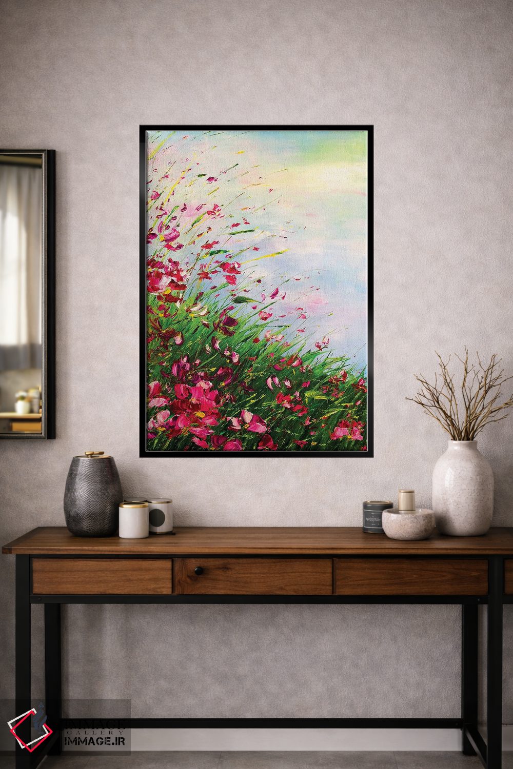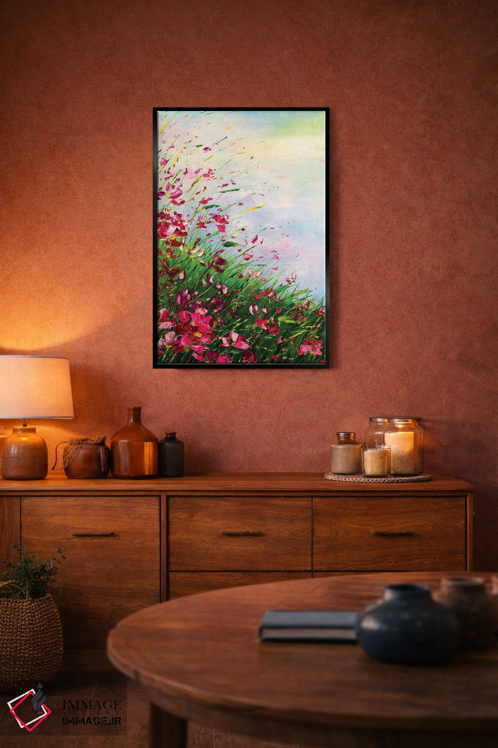 براساس پالت ترکیبی اثر، قاب تیک گرم (چوبی) پیشنهاد اول است و مشکی مات (فریم متوسط) مکمل. برای سفارشهای پروژهای با ابعاد و قابهای اختصاصی با ایماژ در تماس باشید.