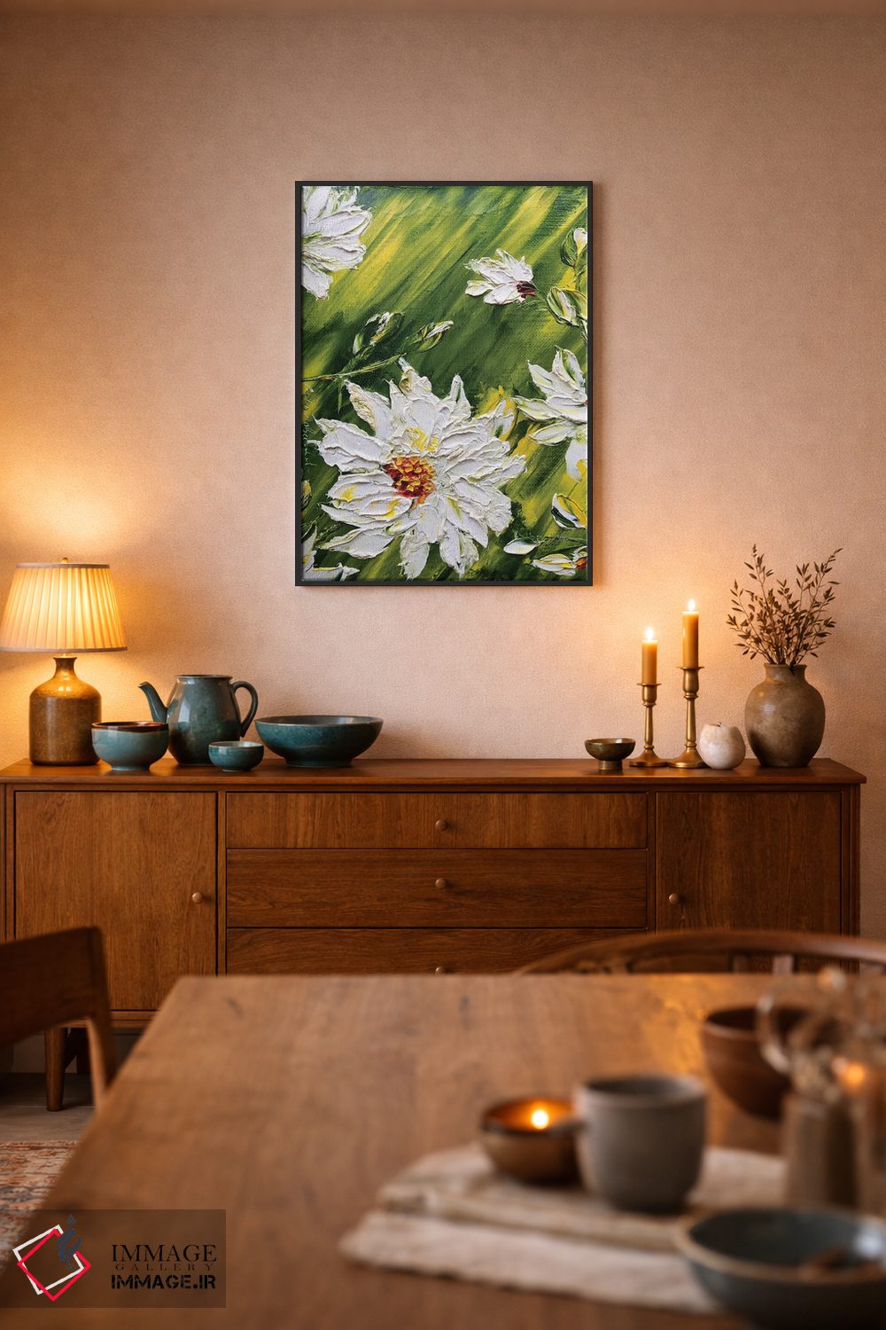 براساس پالت ترکیبی اثر، قاب تیک گرم (چوبی) پیشنهاد اول است و مشکی مات (فریم متوسط) مکمل. برای سفارشهای پروژهای با ابعاد و قابهای اختصاصی با ایماژ در تماس باشید.