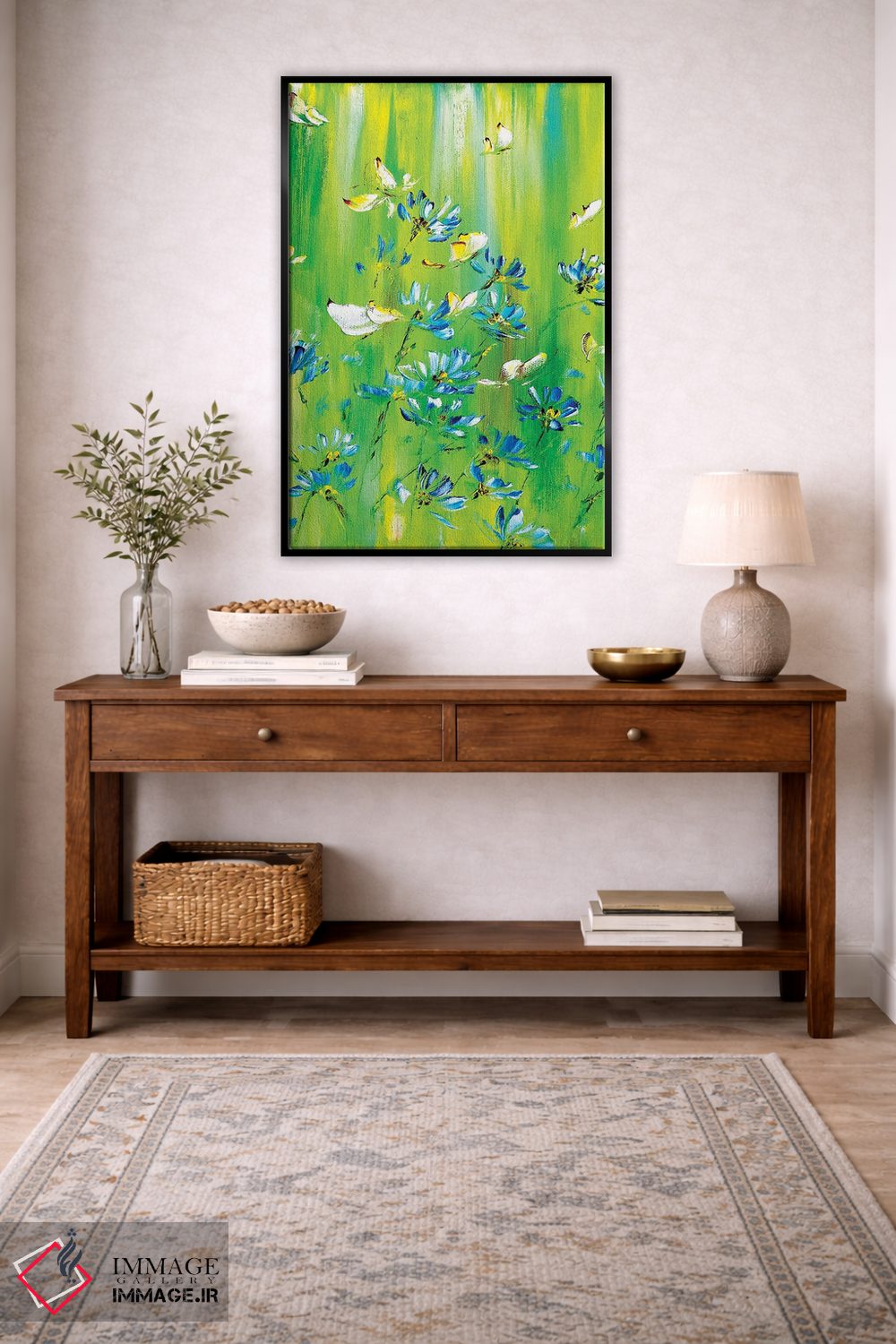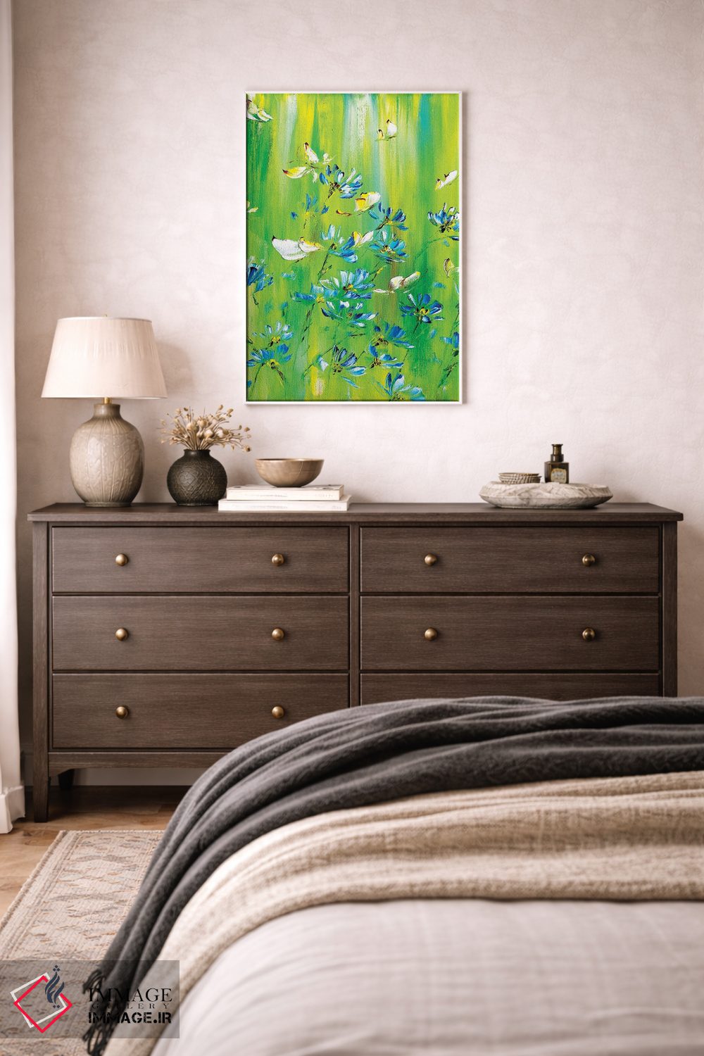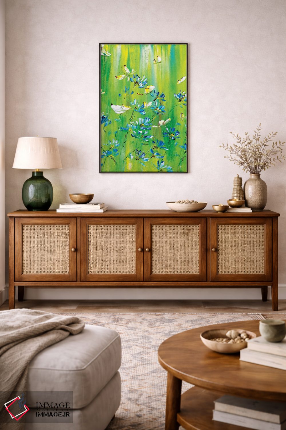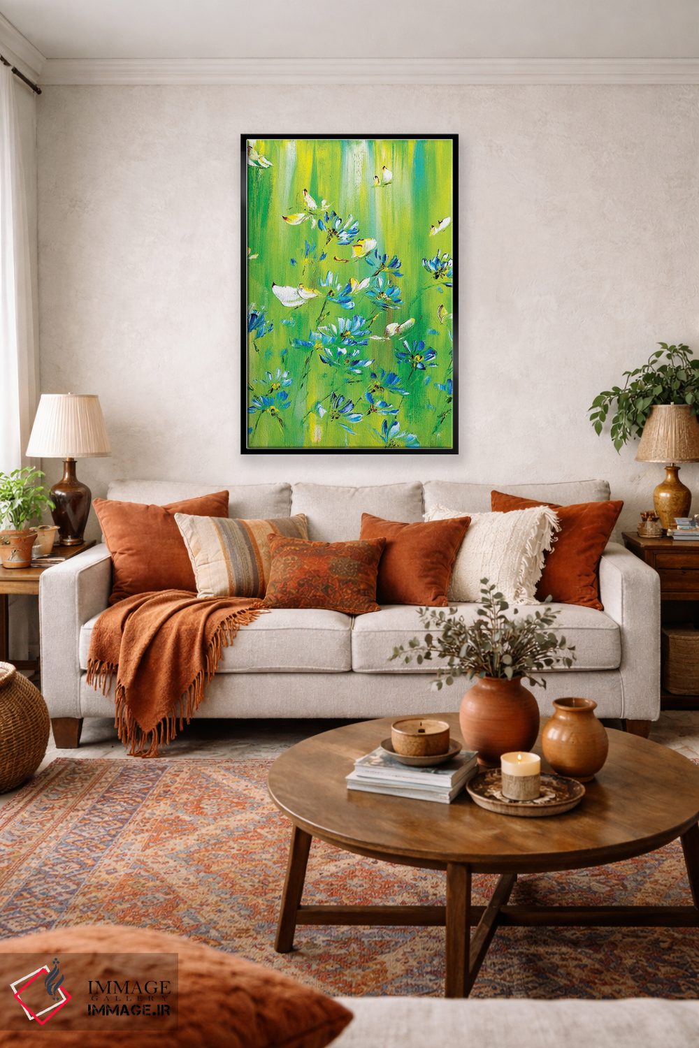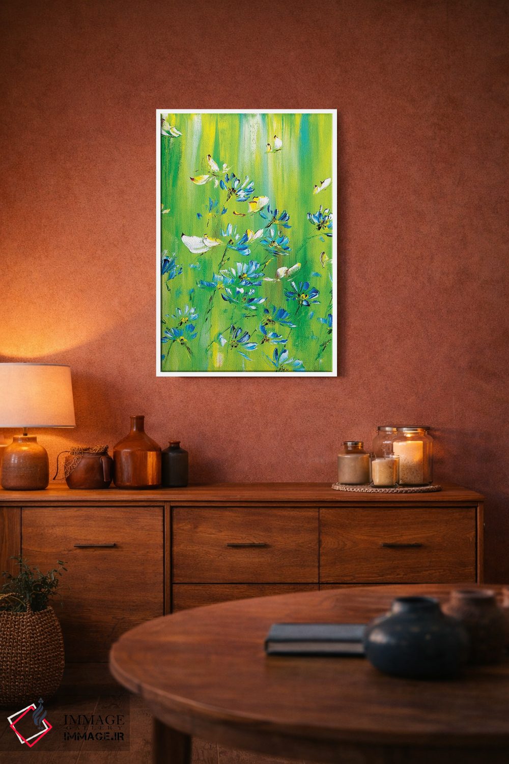 برای فضاهایی که به لطافت نیاز دارند، «چمنزار سبز با گلهای بابونه» اثرِ «مارینا اسکرمووا» حس فصل را آرام وارد فضا میکند؛ برای نشیمنهای روشن انتخابی خوشسلیقه است. حضورش آرام است، اما بیاثر نیست.