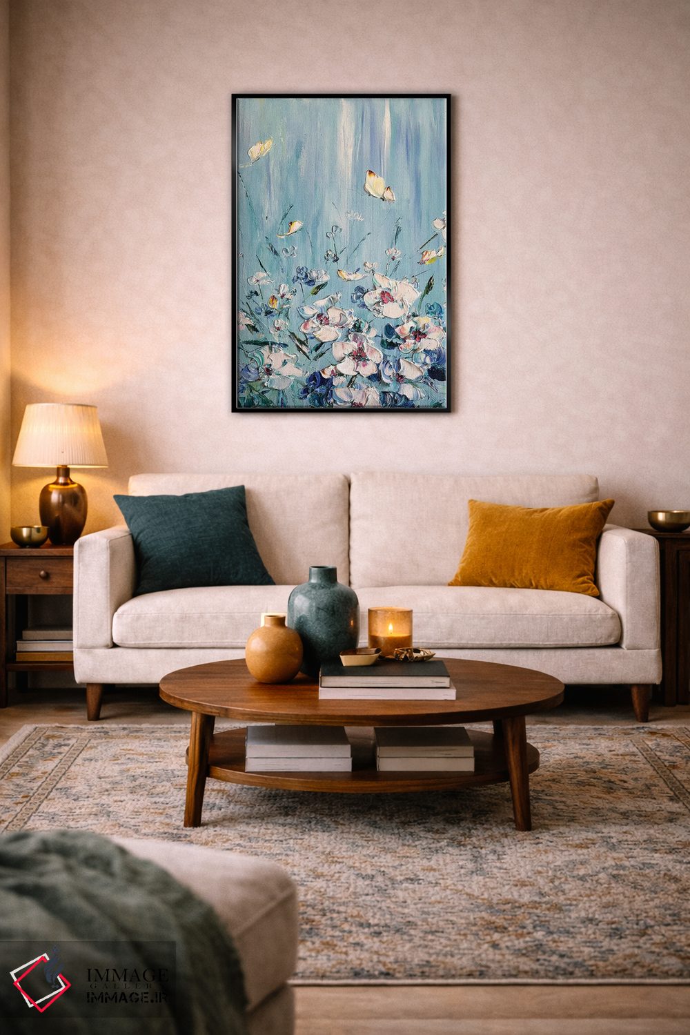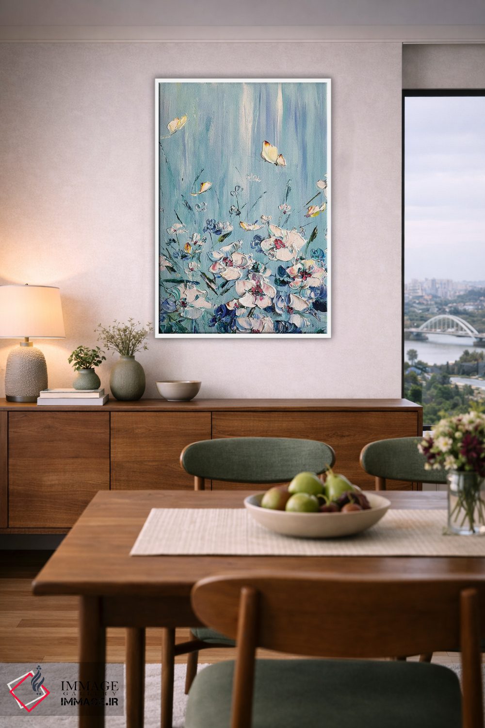 اگر دوست دارید دیوار روشنتر و آرامتر دیده شود، «چمنزار گلهای سفید» اثرِ «مارینا اسکرمووا» حس طراوت را بدون شلوغی وارد اتاق میکند، برای خانههایی با نور طبیعی گزینهٔ مناسبیست. حضورش آرام است، اما بیاثر نیست.