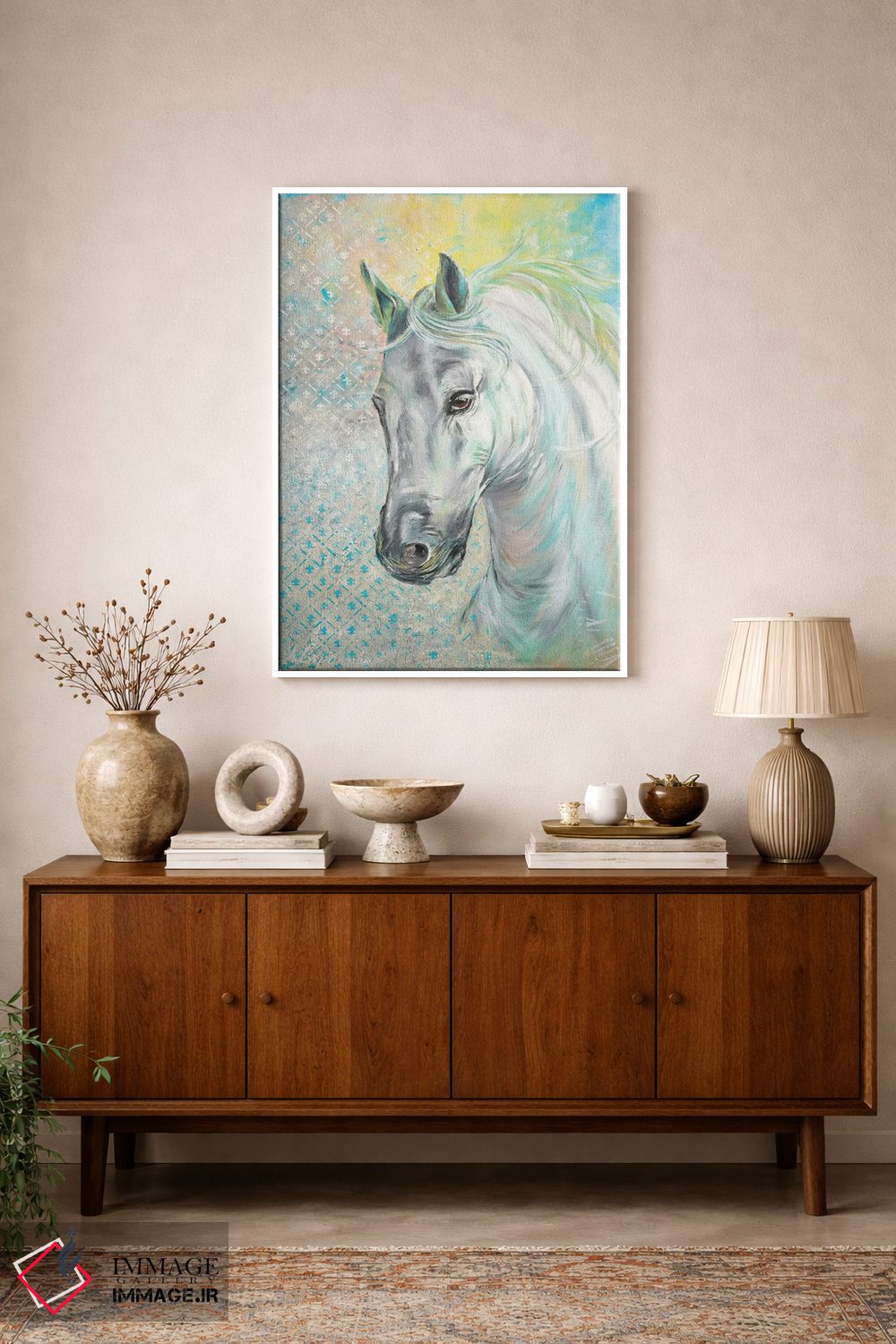 براساس پالت ترکیبی اثر، قاب بلوط روشن (چوبی) پیشنهاد اول است و استخوانی ملایم مکمل. برای سفارشهای پروژهای با ابعاد و قابهای اختصاصی با ایماژ در تماس باشید.