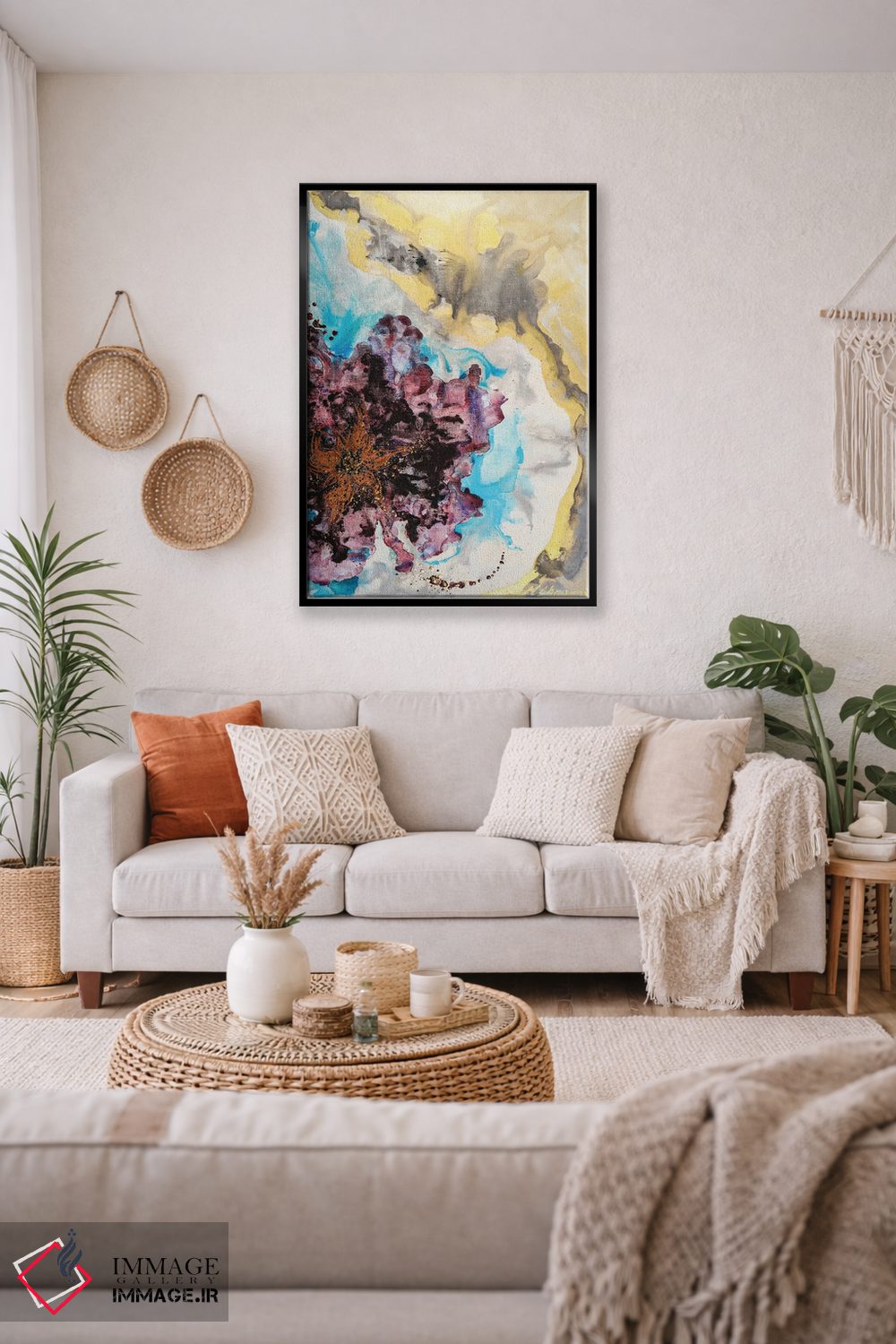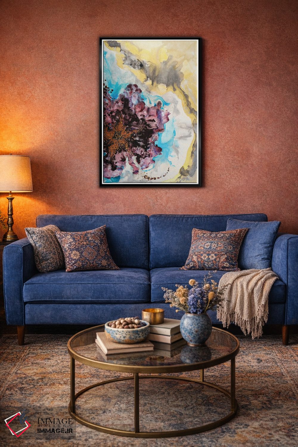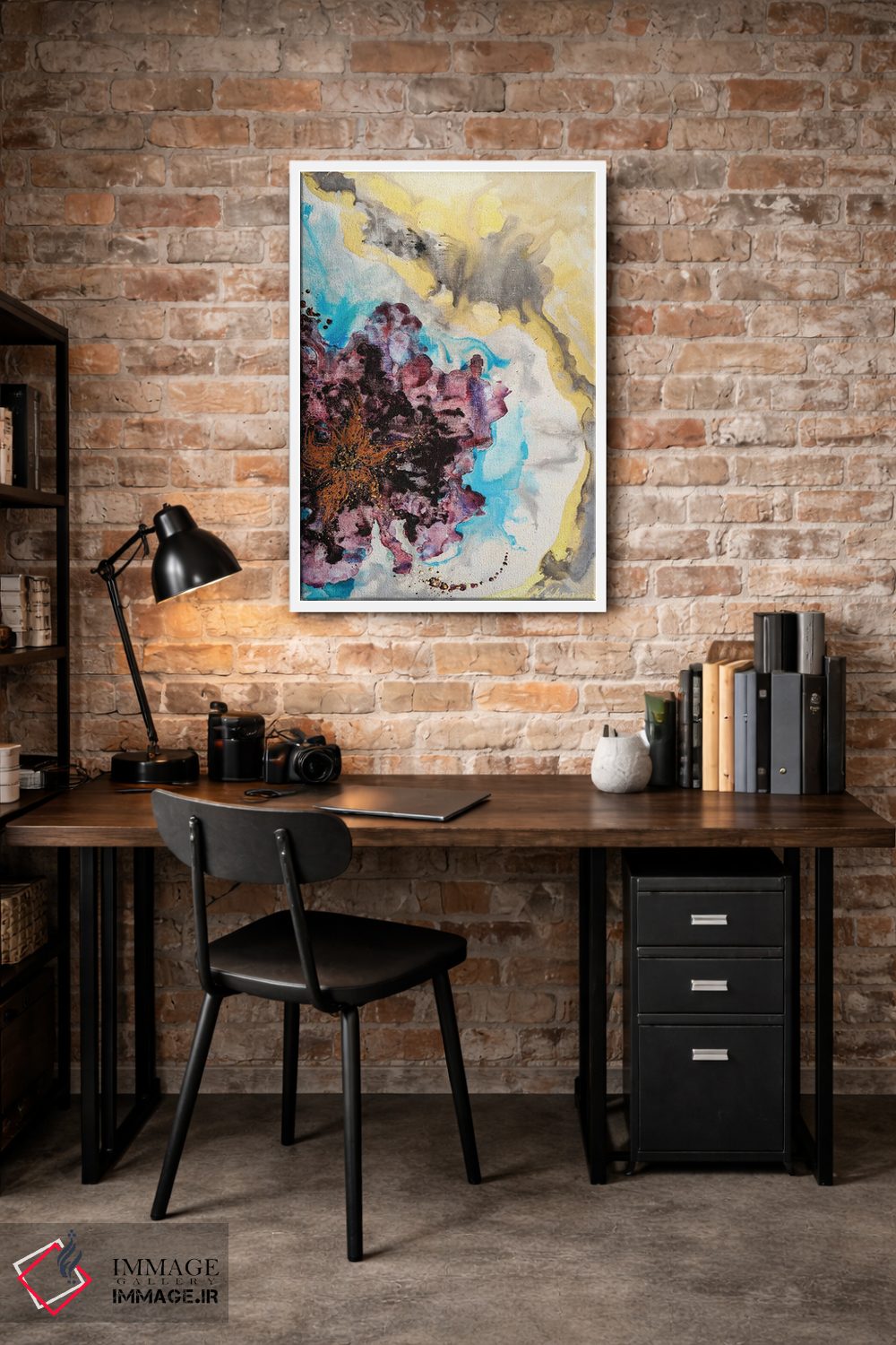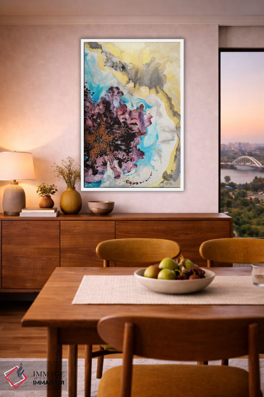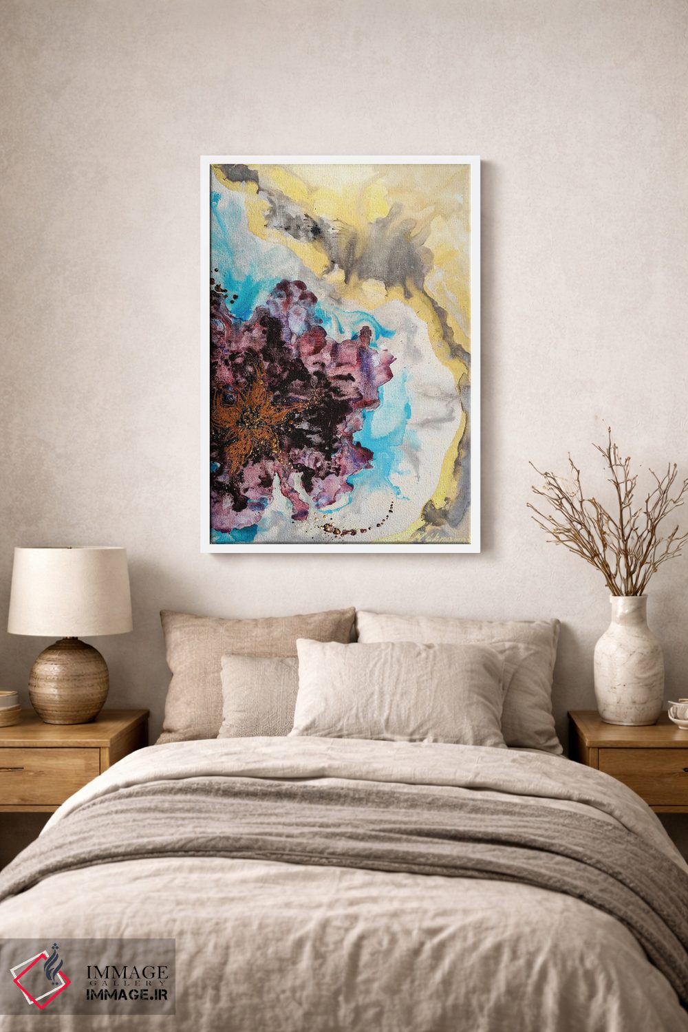براساس پالت ترکیبی اثر، قاب تیک گرم (چوبی) پیشنهاد اول است و مشکی مات (فریم متوسط) مکمل. برای سفارشهای پروژهای با ابعاد و قابهای اختصاصی با ایماژ در تماس باشید.
