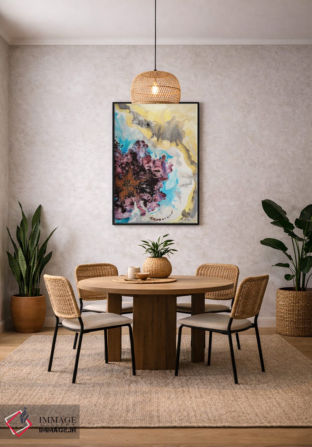 بوم گالری ایماژ طوری طراحی شده که اثر روی دیوار «پرداختشده» و حرفهای دیده شود—نه پرزرقوبرقِ بیپایه؛ بلکه دقیق و خوشپرداخت. بافت ظریف کنواس کمک میکند حس اثر هنری را در نگاه نزدیک نگه میدارد و در دکورهای مدرن و مینیمال خیلی خوب مینشیند. در چاپ جیکلی (Giclée)، گذارهای رنگی را نرمتر میکند و نتیجه را یکدستتر میکند. حاصل کار، یک تابلو خوشنشین است که هم از دور اثرگذار است و هم از نزدیک خوشخوان؛ اگر فضا مینیمال است، همین پرداخت تمیز کافی است.