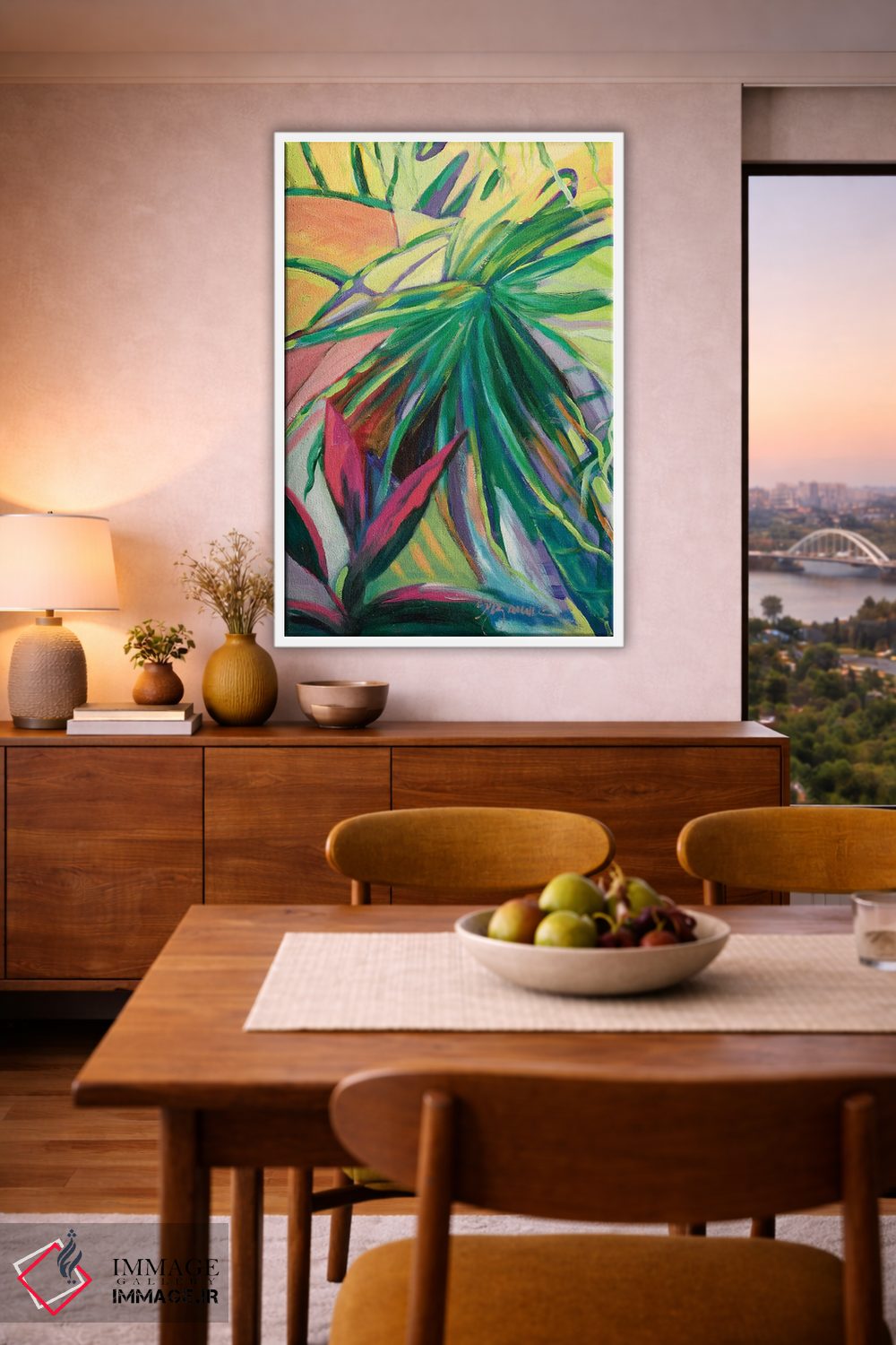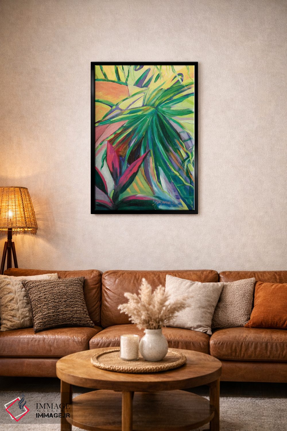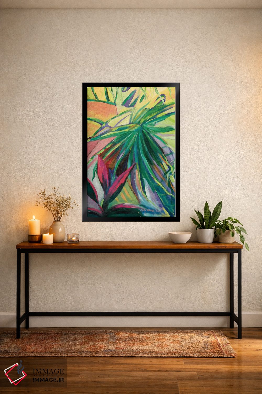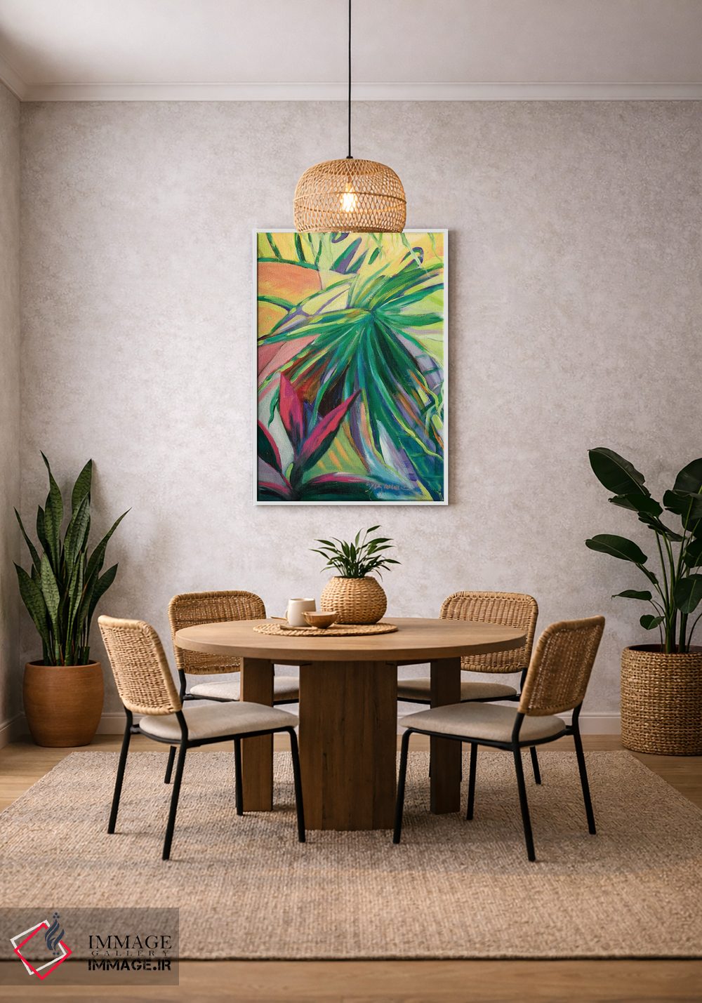 اگر به دکورهای طبیعی علاقه دارید، «باغ انتزاعی ۱» اثرِ «سوزان ویلکینز» فضا را نرمتر و مهماننوازتر میکند، برای فضاهای بوهمی گزینهٔ مناسبیست. حضورش آرام است، اما بیاثر نیست.